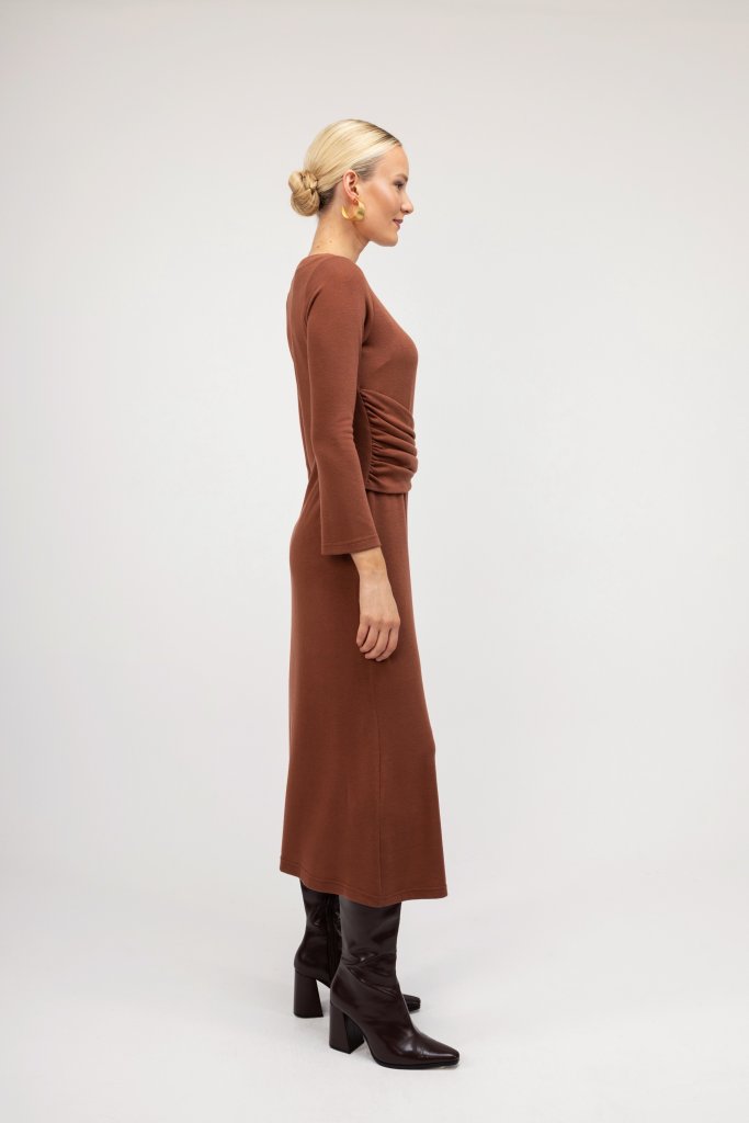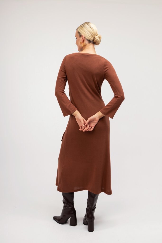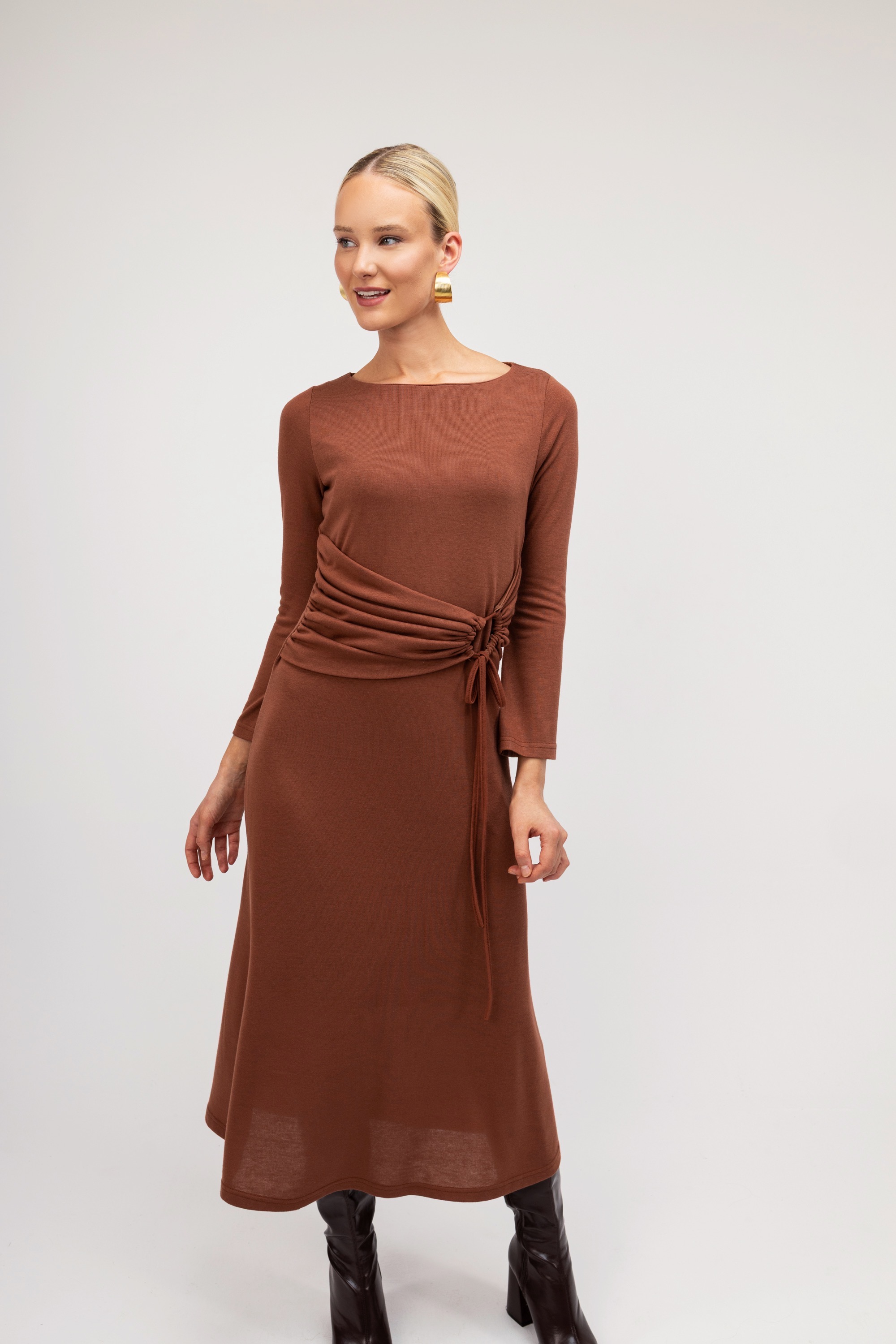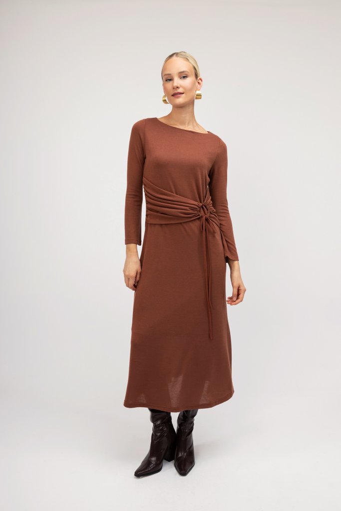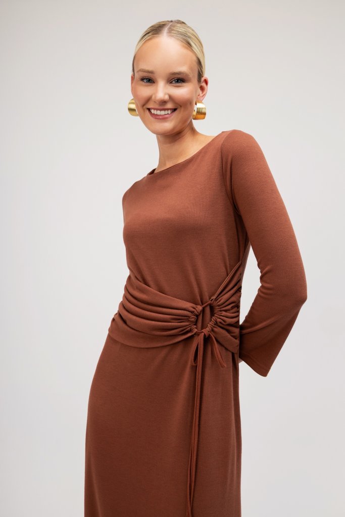 Γυναικείο εκάι φόρεμα με ιδιαίτερες λεπτομέρειες με σούρα και κορδόνι. Διαθέτει άλφα γραμμή και κλειστή λαιμόκοψη. Ανανεώστε το καθημερινό σας outfit με αυτό το υπέροχο μονόχρωμο φόρεμα.