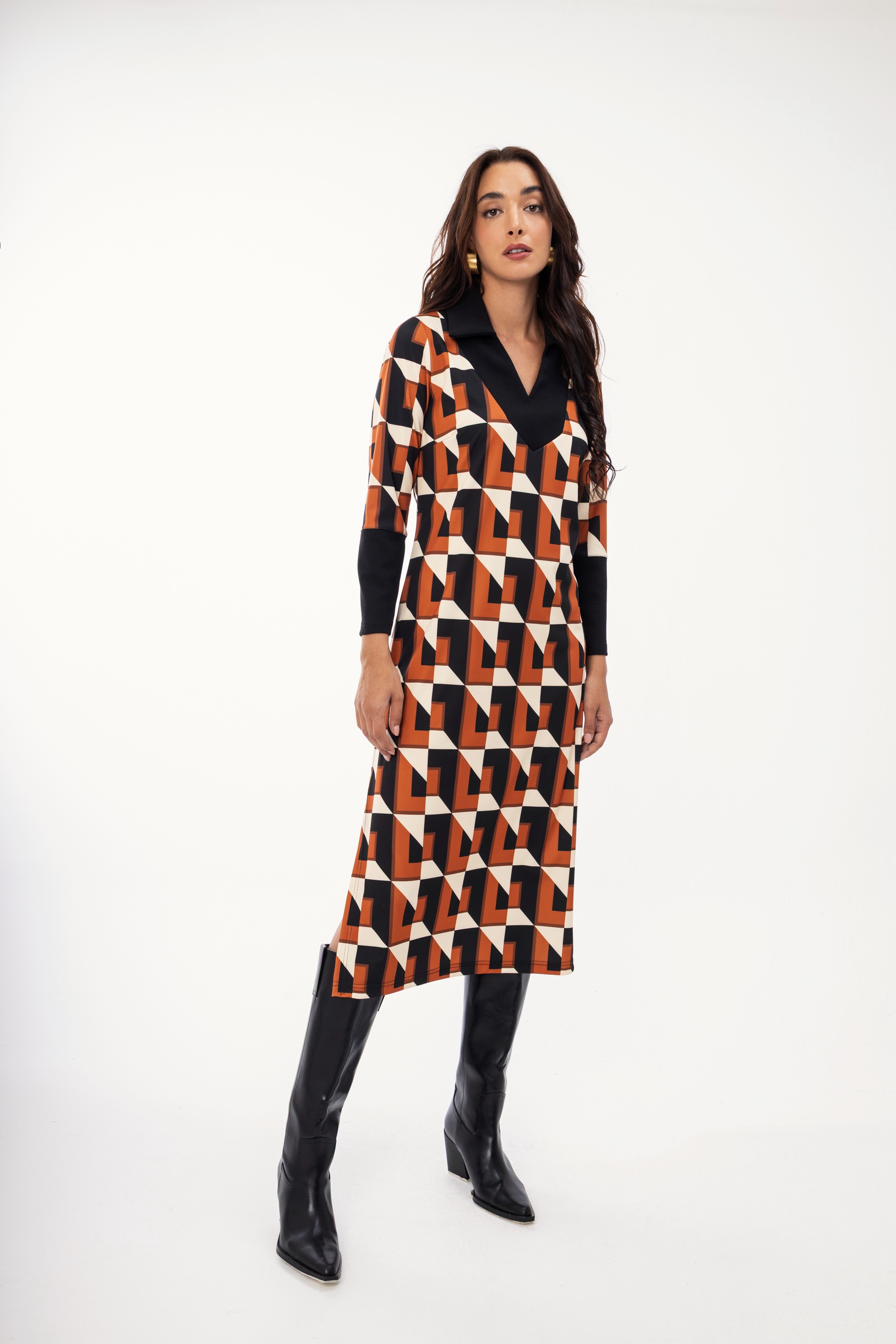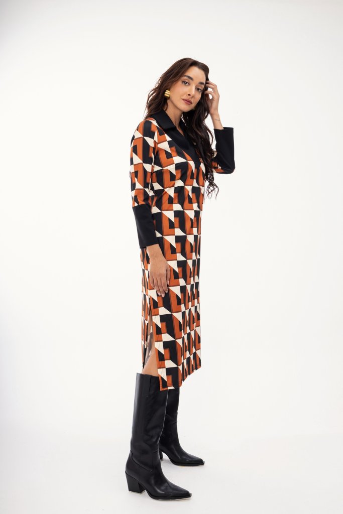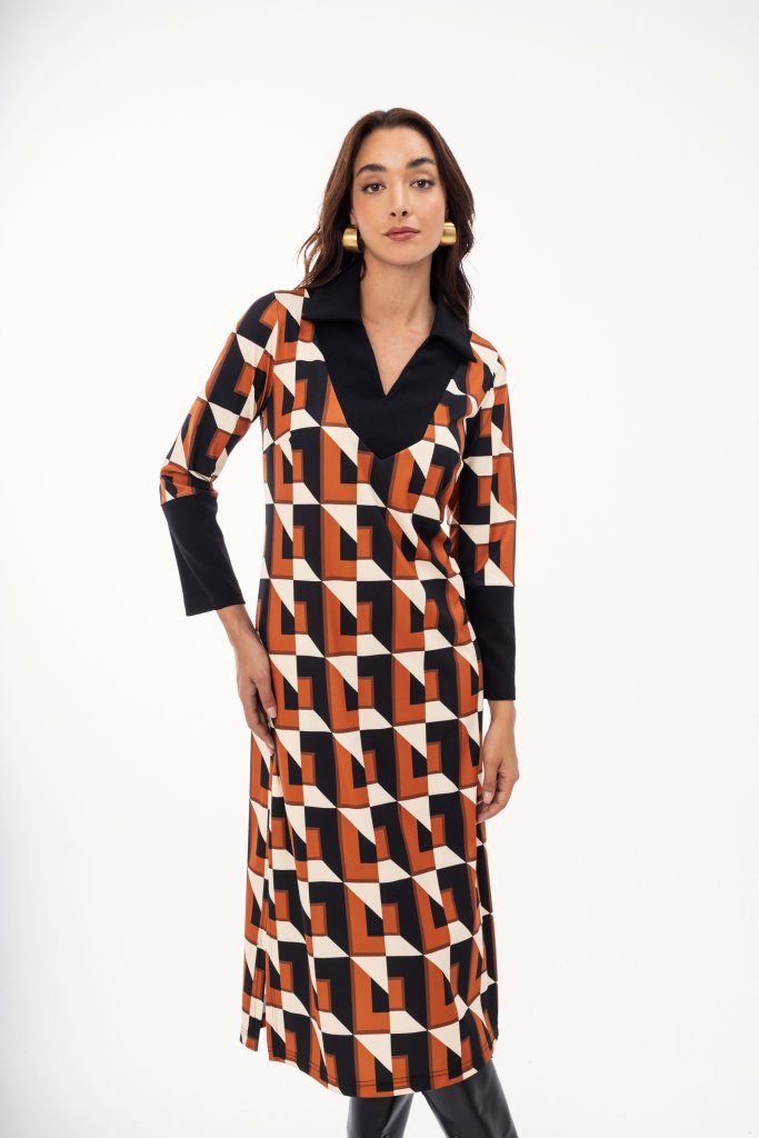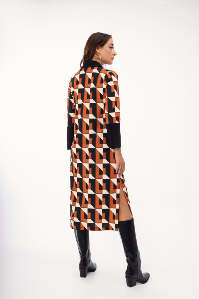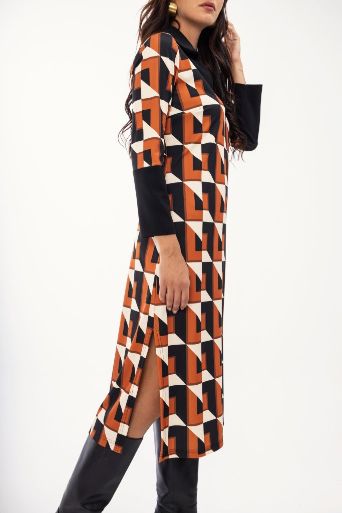 Γυναικείο εμπριμέ φόρεμα με εκάι γεωμετρικά σχέδια σε όλο το μήκος του. Μοντέρνος σχέδιο που μπορεί να φορεθεί σε κάθε σας ανάγκη και να αναβαθμίσει το στιλ σας.
