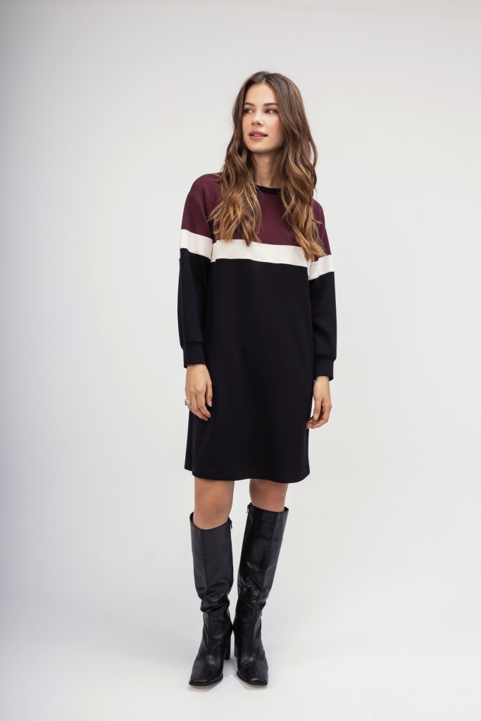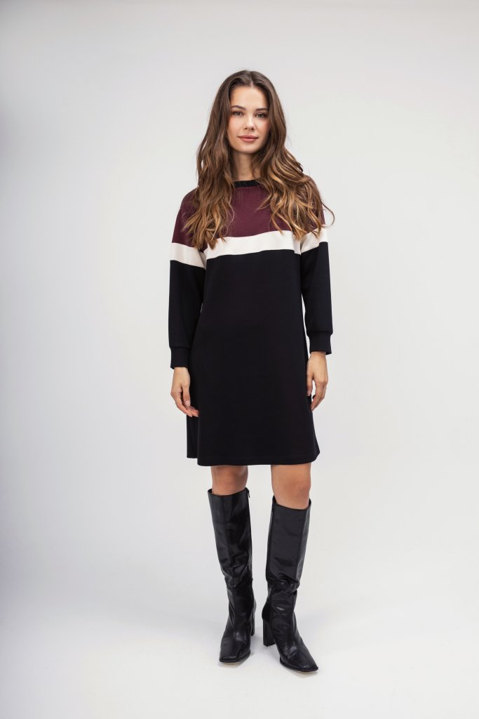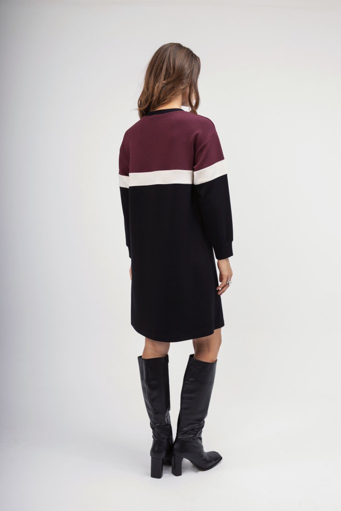 Γυναικείο φόρεμα τύπου φούτερ σε μαύρη απόχρωση με ριγέ λεπτομέρειες από μπορντώ και εκρού. Διαθέτει στρογγυλή λαιμόκοψη. Μια μοντέρνα επιλογή για τη δύσκολη καθημερινότητά σας αλλά και για μια χαλαρή βόλτα.