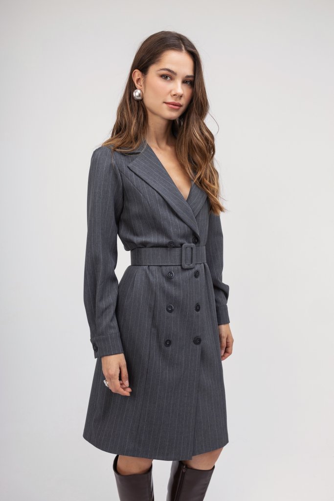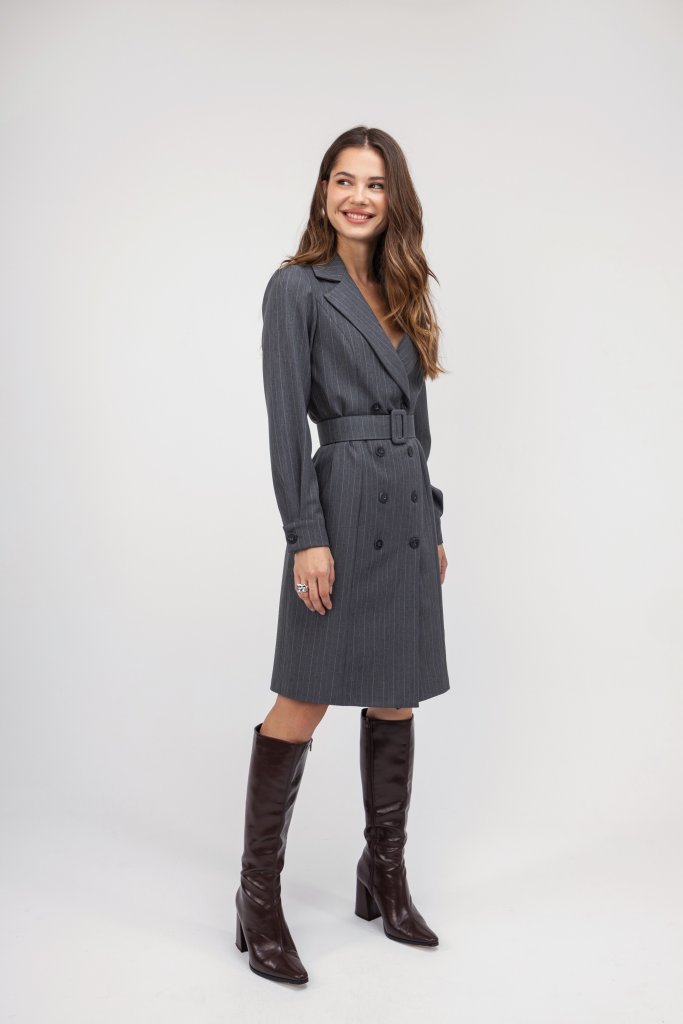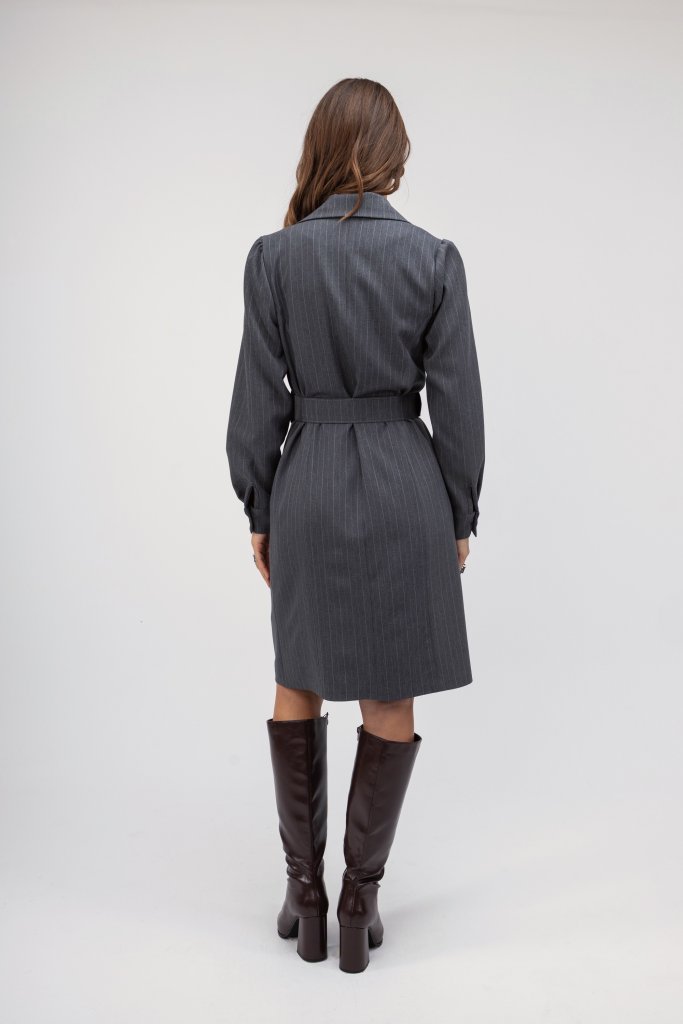 Γυναικείο γκρι φόρεμα σε ριγέ σχέδιο, με γιακά, ανοιχτό ντεκολτέ και ζώνη περιμετρικά στη μέση. Μια κομψή επιλογή που θα σας χαρίσει ένα μοναδικό στιλ σε κάθε εμφάνιση.