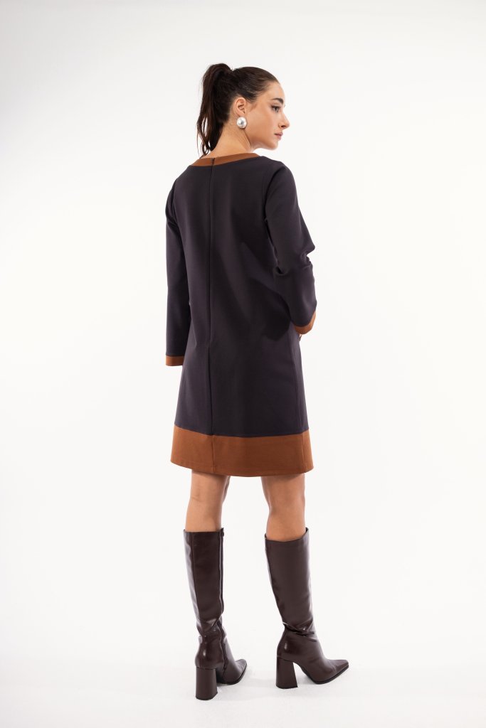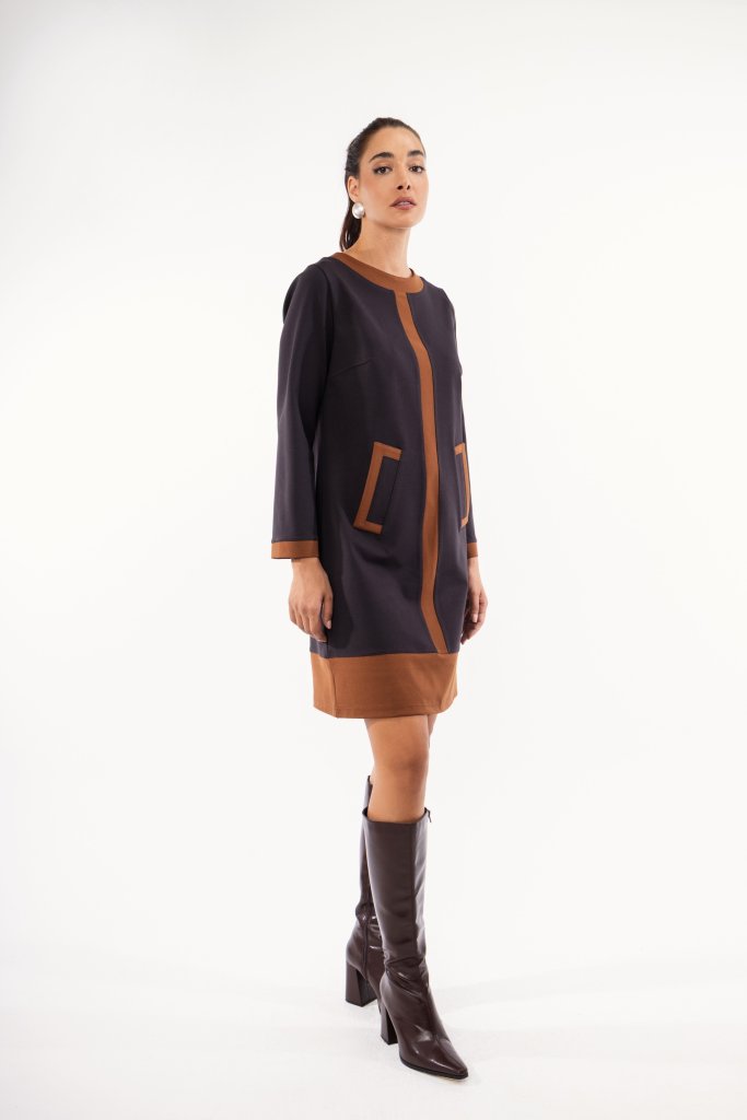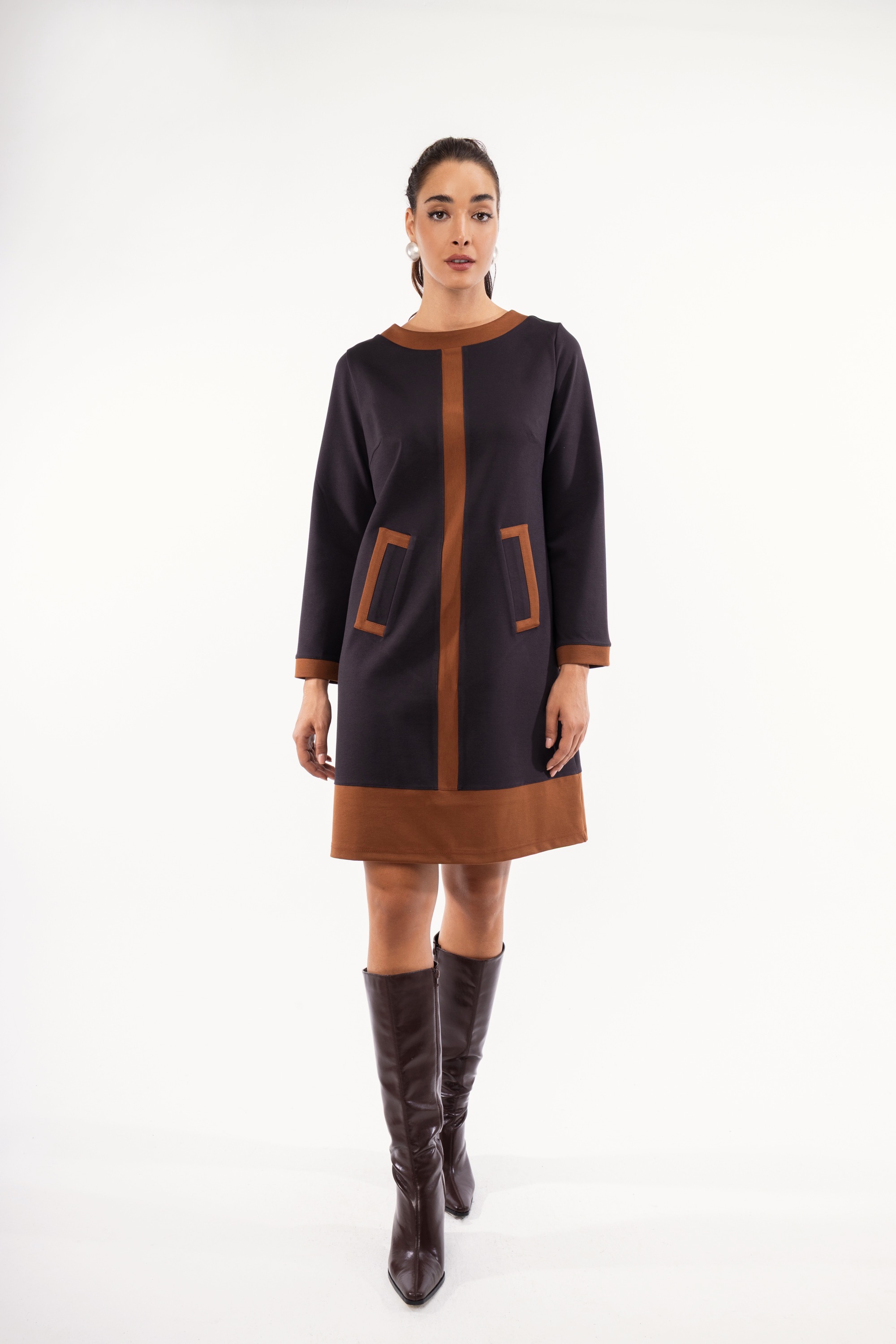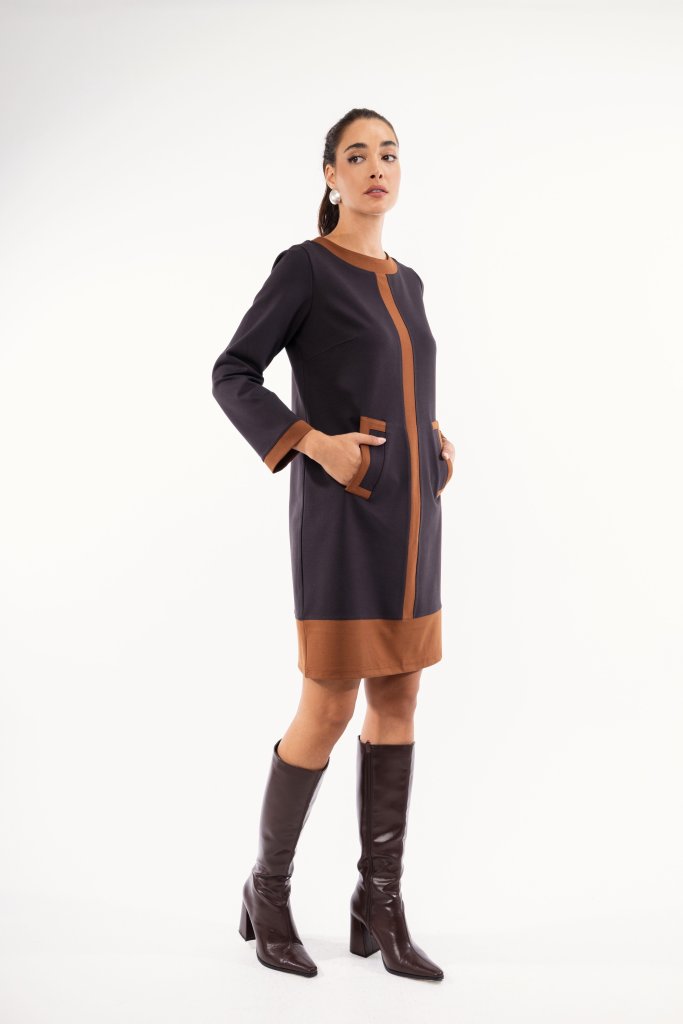 Γυναικείο καφέ φόρεμα με ιδιαίτερο σχέδιο και διχρωμία. Διαθέτει διακοσμημένες τσέπες και απλή άλφα γραμμή. Ανανεώστε το χειμερινό σας outfit στη βόλτα ή στο γραφείο με αυτό το υπέροχο και μοντέρνο φόρεμα.