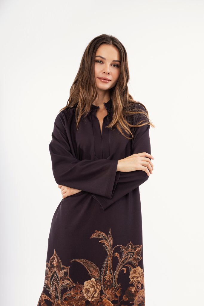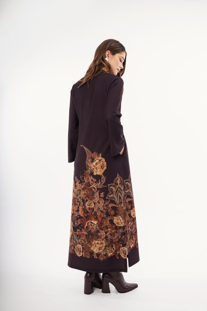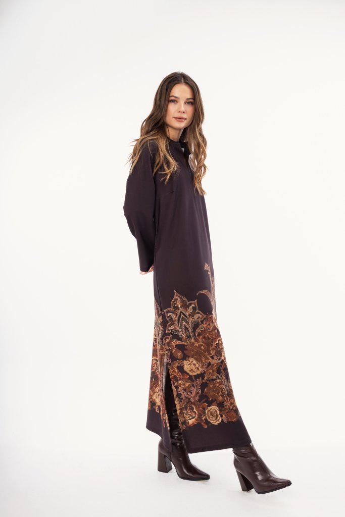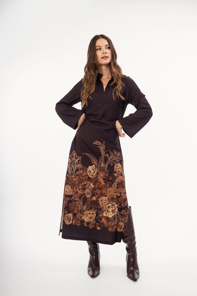 Γυναικείο φόρεμα midi σε καφέ χρώμα με εντυπωσιακά λουλούδια χρυσά στο κάτω μέρος. Διαθέτει διακριτικό άνοιγμα στο λαιμό όπως και στο πλάι στο τελείωμα του σχεδίου. Ανανεώστε τη χειμερινή σας γκαρνταρόμπα με αυτό το κομψό φόρεμα.