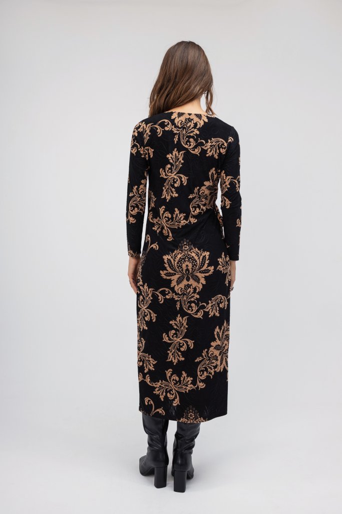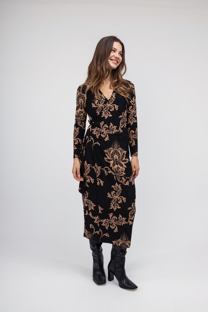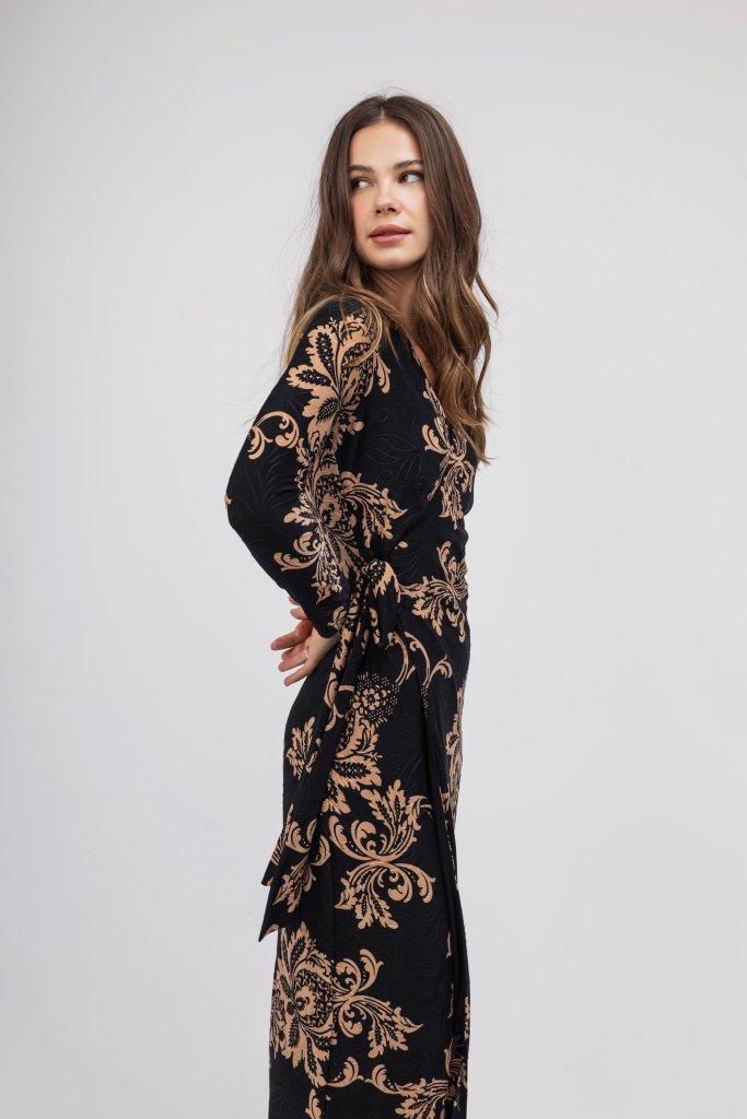 Γυναικείο κρουαζέ φόρεμα με μπεζ σχέδια από λαχούρια και λουλούδια. Δέσιμο στο πλάι πάνω από τη μέση. Μια επιλογή που μπορεί να συνδυαστεί με το καθημερινό σας ντύσιμο αλλά και για μια χαλαρή βόλτα.