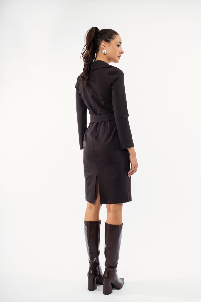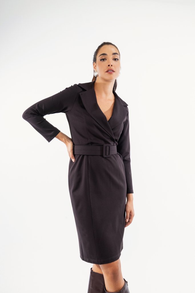 Γυναικείο μαύρο φόρεμα με γιακά, ανοιχτό ντεκολτέ και ζώνη περιμετρικά στη μέση. Μια κομψή επιλογή που θα σας χαρίσει ένα μοναδικό στιλ σε κάθε εμφάνιση.