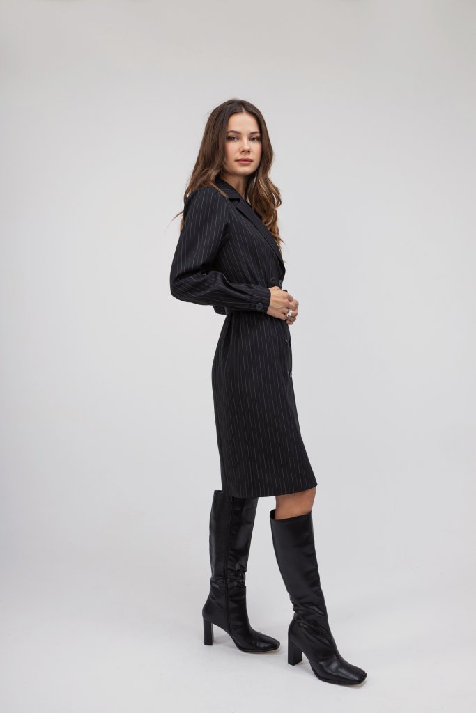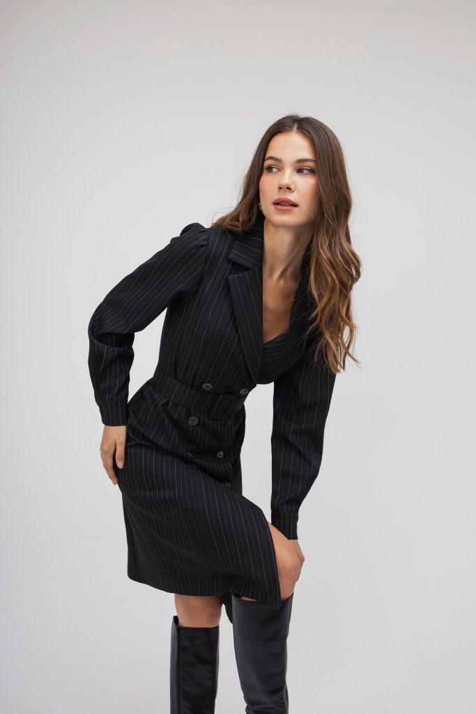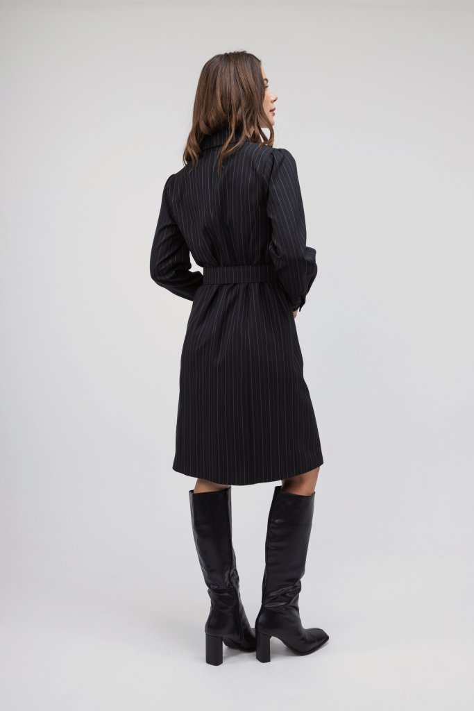 Γυναικείο μαύρο φόρεμα σε ριγέ σχέδιο, με γιακά, ανοιχτό ντεκολτέ και ζώνη περιμετρικά στη μέση. Μια κομψή επιλογή που θα σας χαρίσει ένα μοναδικό στιλ σε κάθε εμφάνιση.