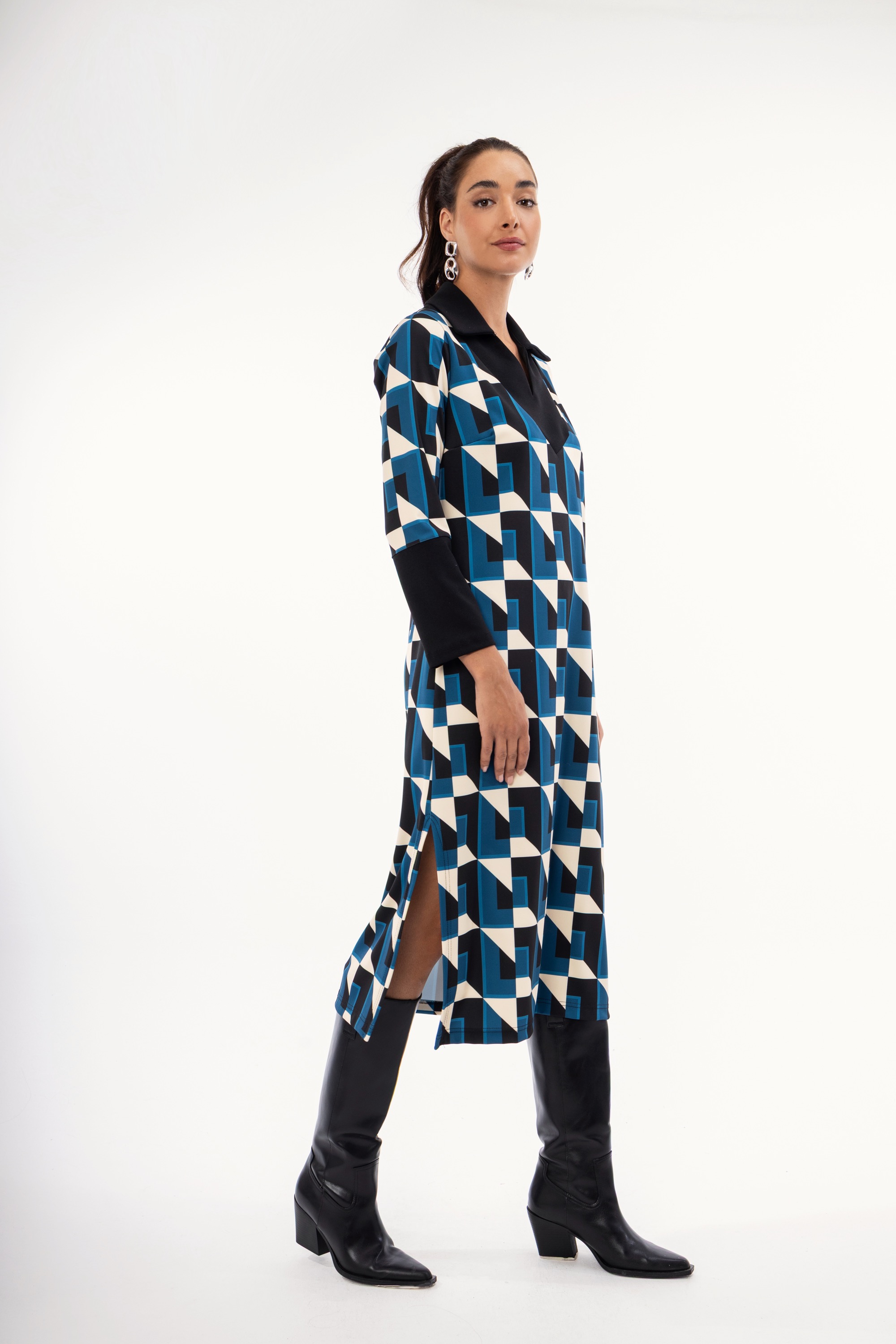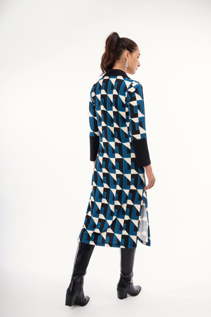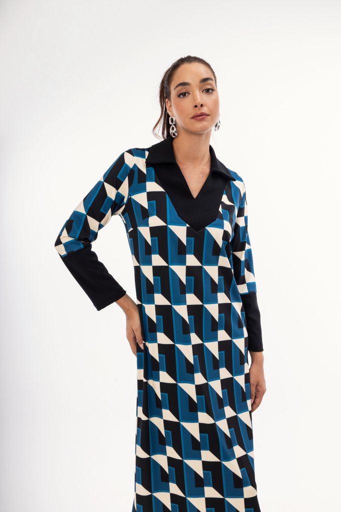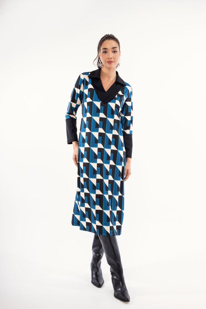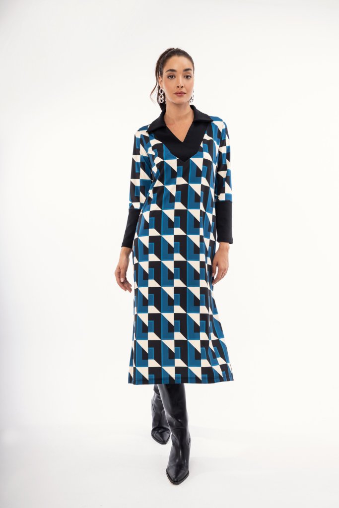 Γυναικείο εμπριμέ φόρεμα με πετρόλ γεωμετρικά σχέδια σε όλο το μήκος του. Μοντέρνος σχέδιο που μπορεί να φορεθεί σε κάθε σας ανάγκη και να αναβαθμίσει το στιλ σας.