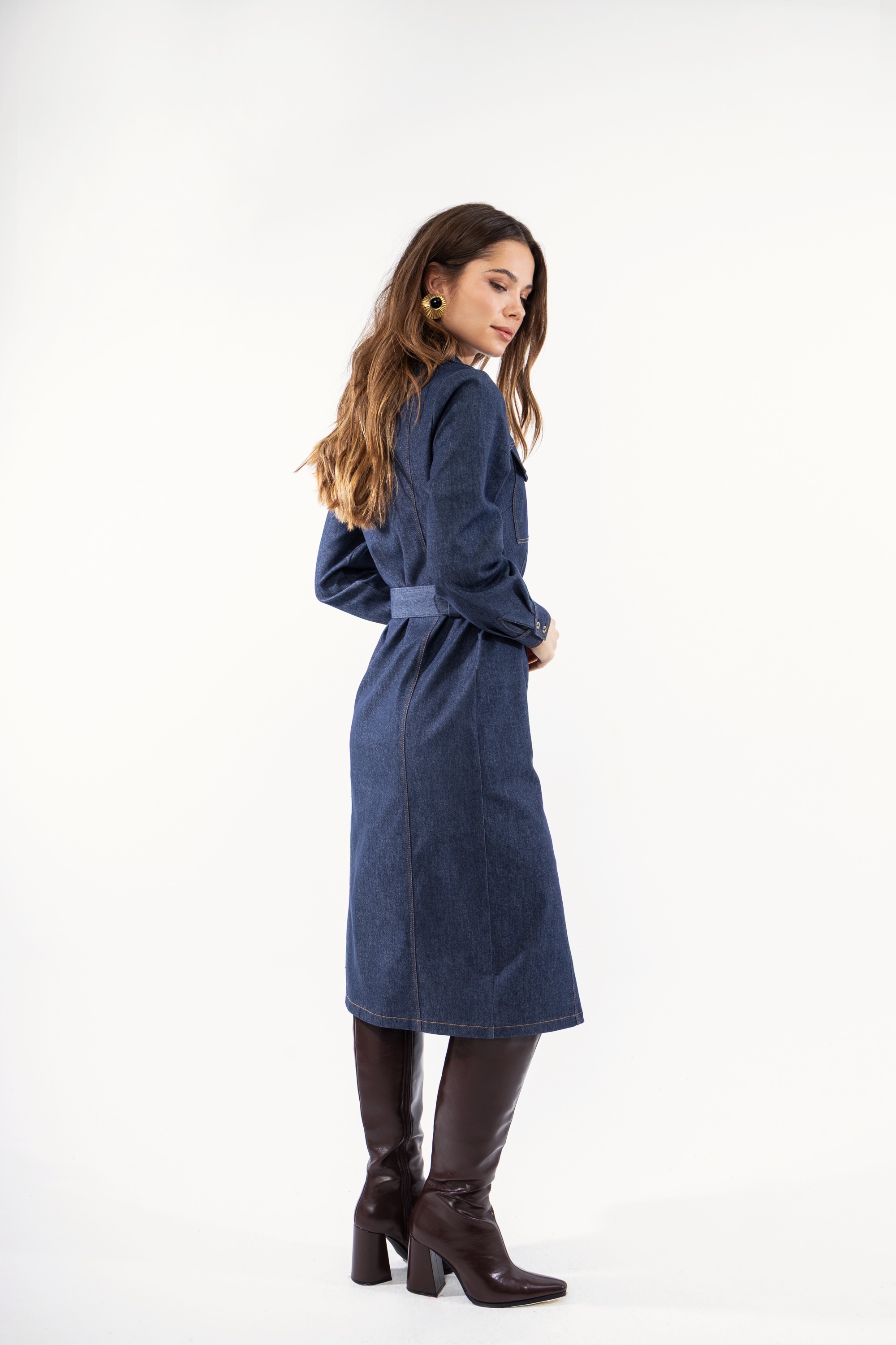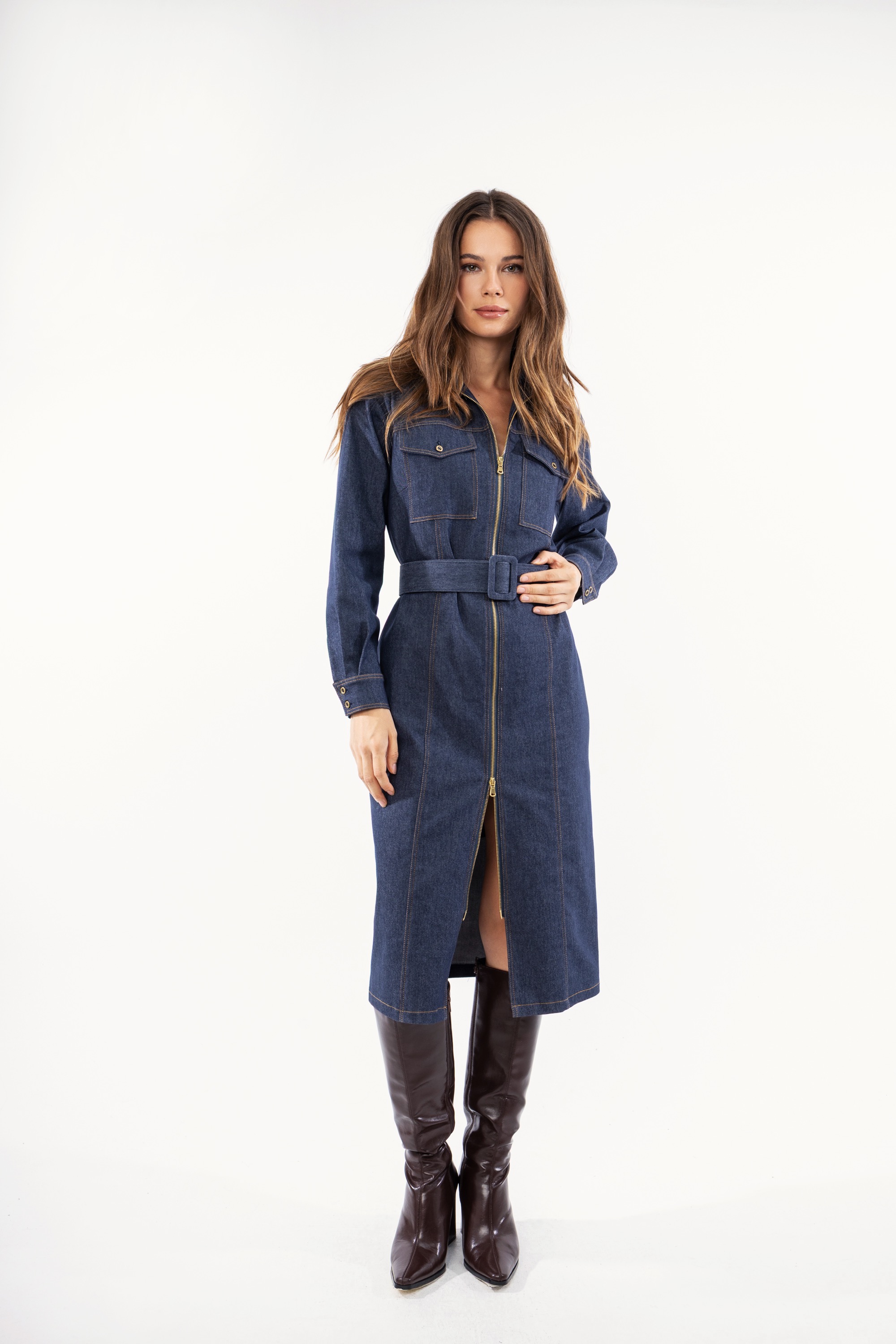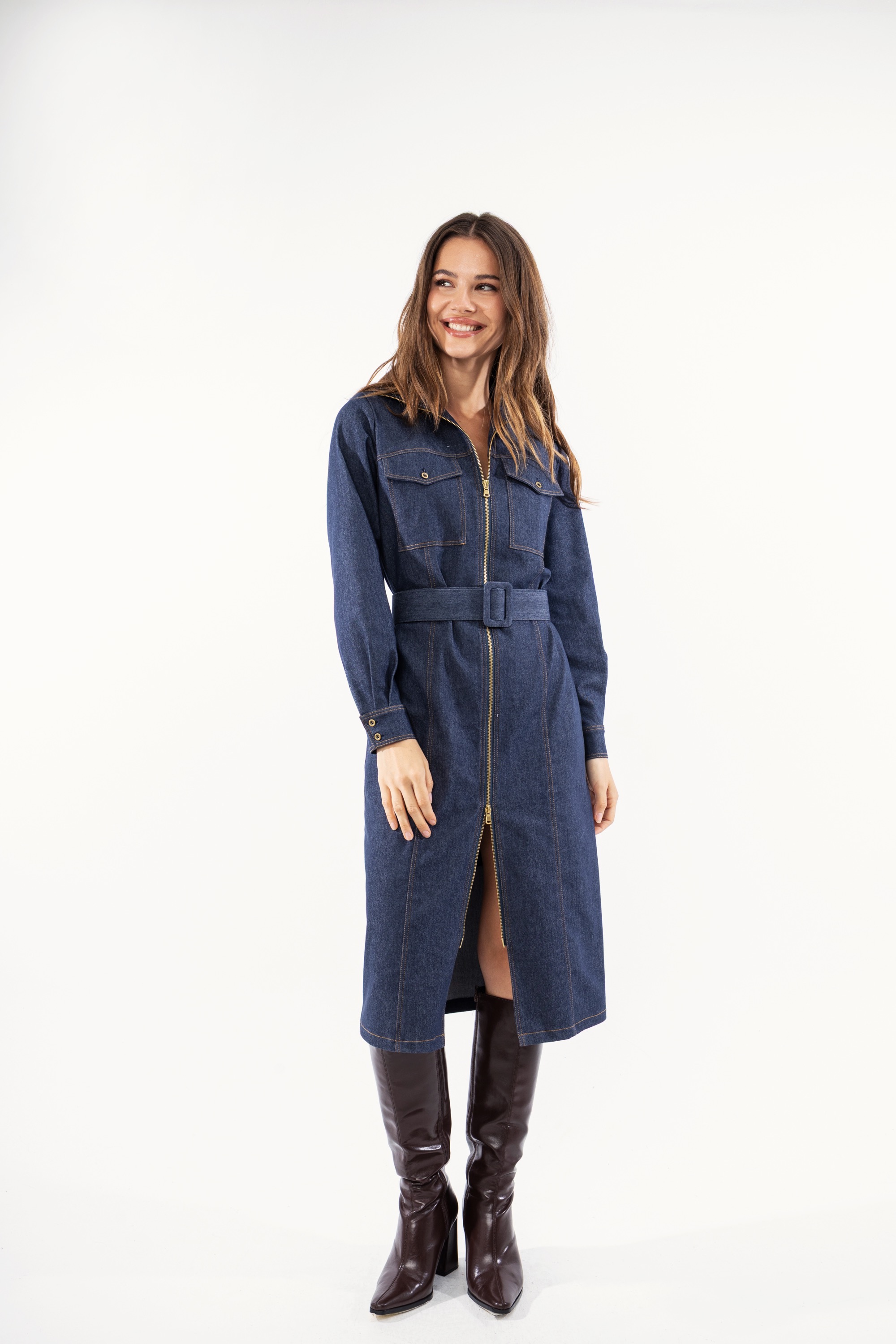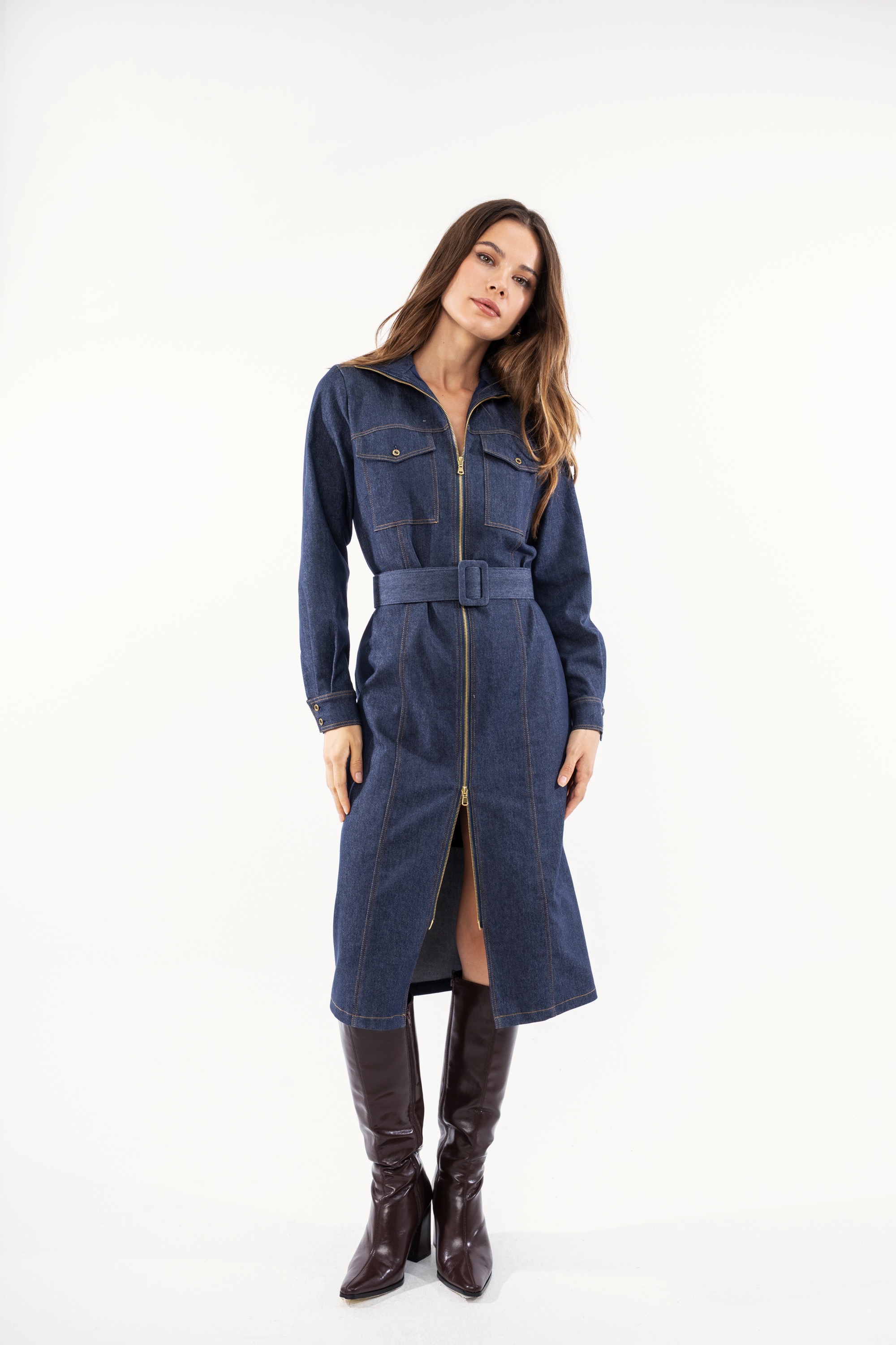 Γυναικείο φόρεμα midi για ένα άκρως εντυπωσιακό denim look. Είναι διαθέσιμο σε τζιν χρώμα, με εξωτερικές ραφές, φερμουάρ και εξωτερικές τσέπες.Διαθέτει ζώνη περιμετρικά. Μια διαχρονική δημιουργία που θα αναβαθμίσει το καθημερινό σας στιλ.