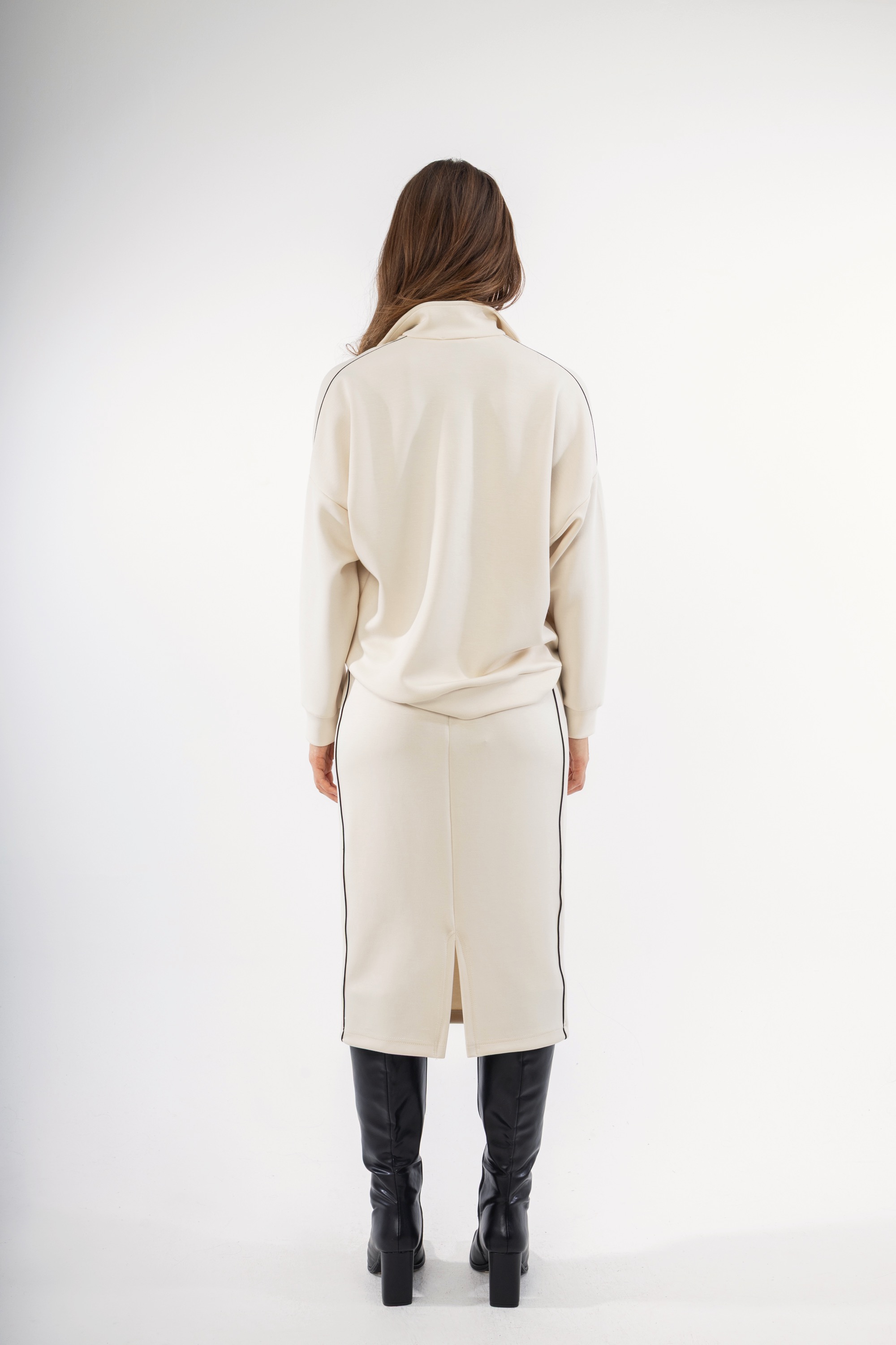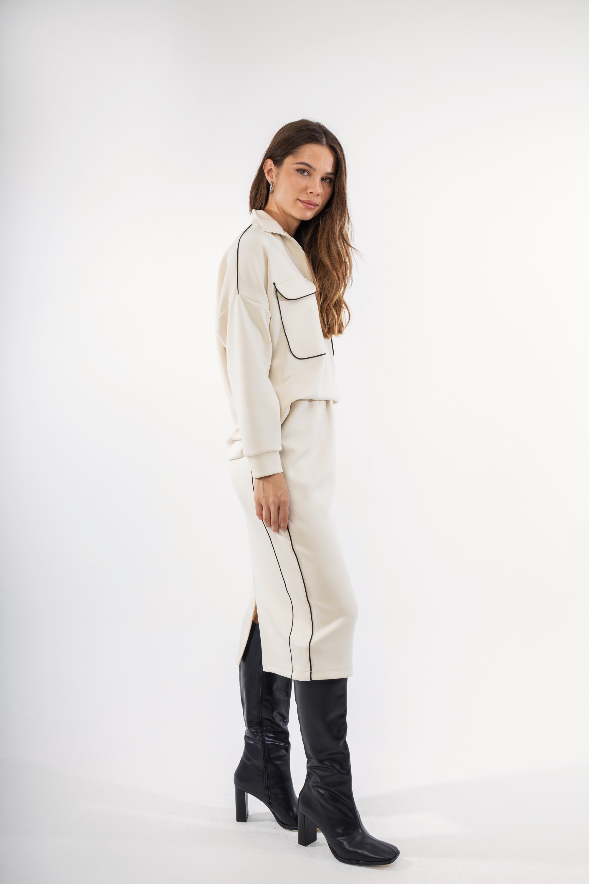 Γυναικεία φούστα μίντι, εφαρμοστή σε εκρού χρώμα. Με μαύρες λεπτομέρειες στα πλαινά μέρη και σκίσιμο στο πίσω μέρος. Μια τέλεια επιλογή που μπορεί να φορεθεί για ένα πρωινό casual look αλλά και για μια χαλαρή απογευματινή βόλτα. Συνδυάστε το με το αντίστοιχο φούτερ και δημιουργήστε ένα υπέροχο outfit.