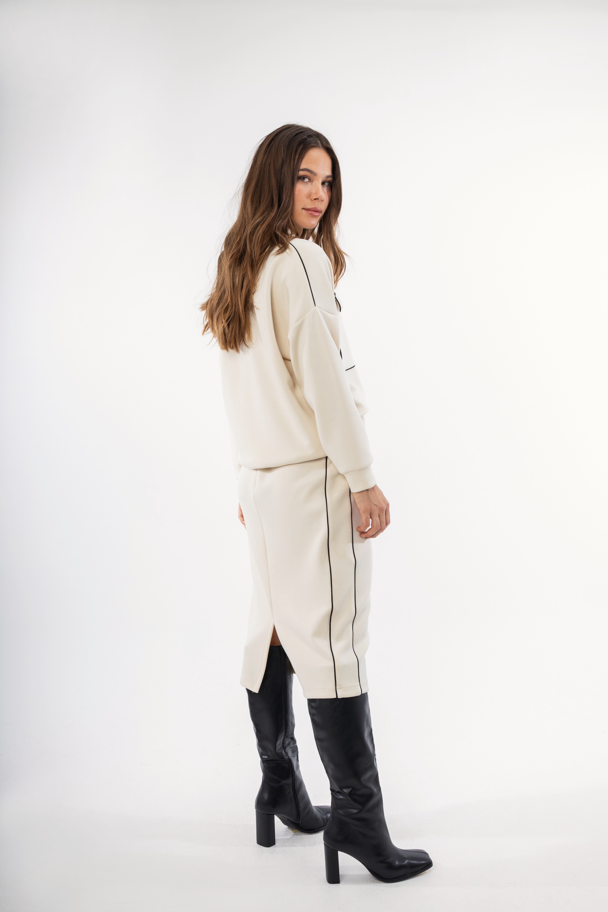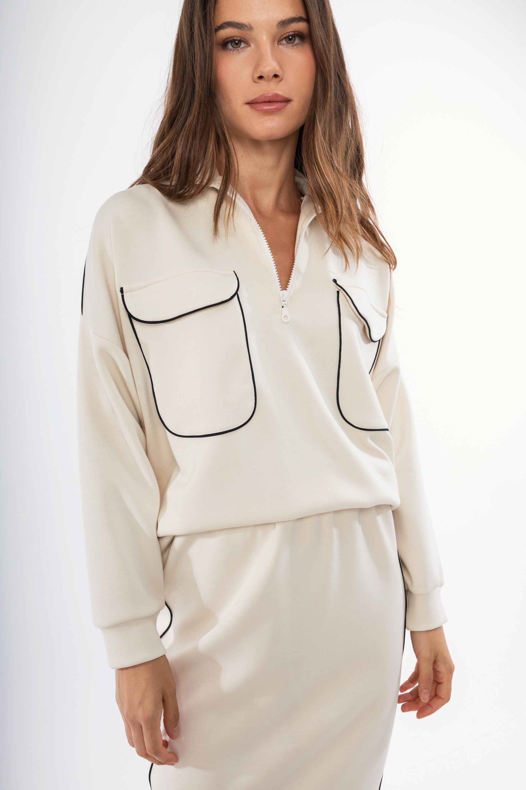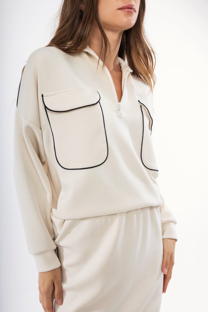 Γυναικείο εκρού φούτερ με φερμουάρ, τσέπες και εξωτερικές ραφές. Διαθέτει λεπτομέρειες από γραμμές μαύρες για να σας χαρίσει μια μοντέρνα πινελία σε ένα μονόχρωμο σχέδιο. Μια χειμερινή δημιουργία που μπορεί να φορεθεί με πολλά σύνολα από το πρωί ως το βράδυ. Συνδυάστε το με την αντίστοιχη φούστα ή παντελόνι για ένα υπέροχο αποτέλεσμα.