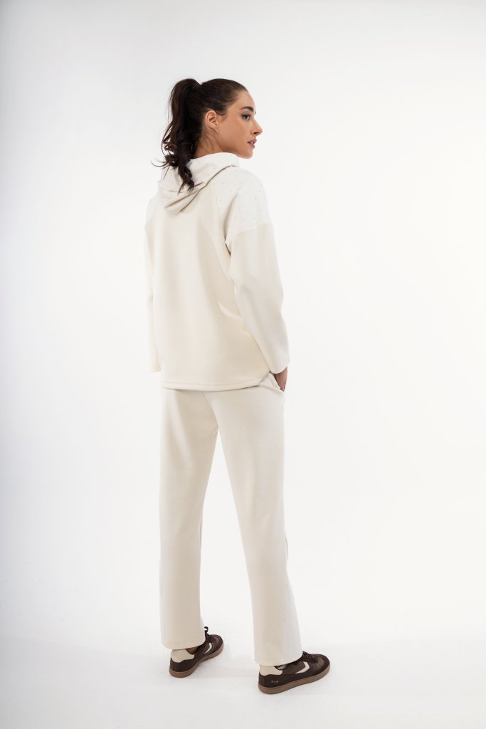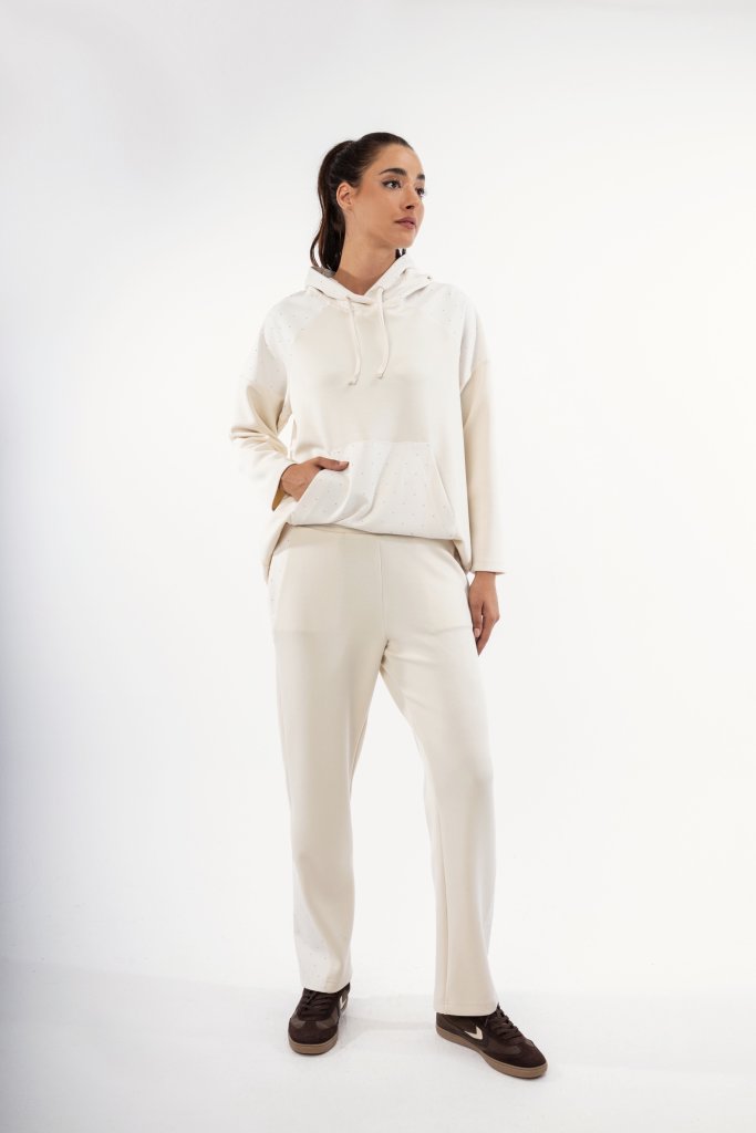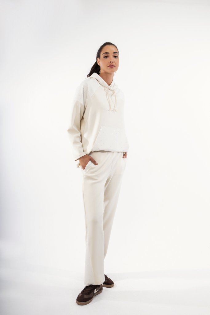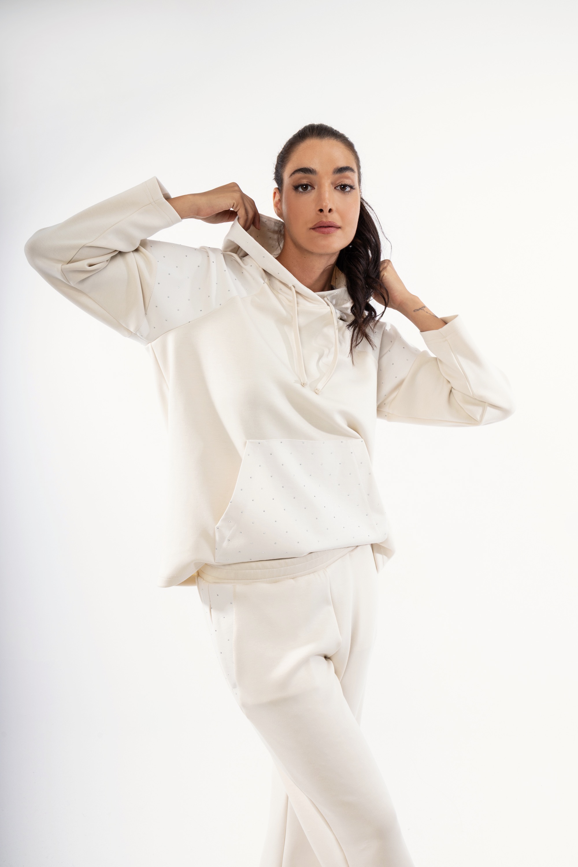 Γυναικείο εκρού φούτερ με strass, τσέπη και κουκουλα. Άνετο και ευρύχωρο. Μια χειμερινή δημιουργία που μπορεί να φορεθεί με πολλά σύνολα από το πρωί ως το βράδυ. Συνδυάστε το με το αντίστοιχο παντελόνι για ένα υπέροχο αποτέλεσμα.