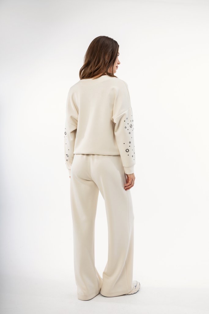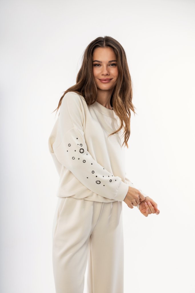 Γυναικείο εκρού φούτερ με τρουκς και στρογγυλή λαιμόκοψη. Άνετο και ευρύχωρο. Μια χειμερινή δημιουργία που μπορεί να φορεθεί με πολλά σύνολα από το πρωί ως το βράδυ. Συνδυάστε το με το αντίστοιχο παντελόνι για ένα υπέροχο αποτέλεσμα.