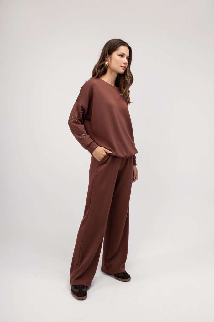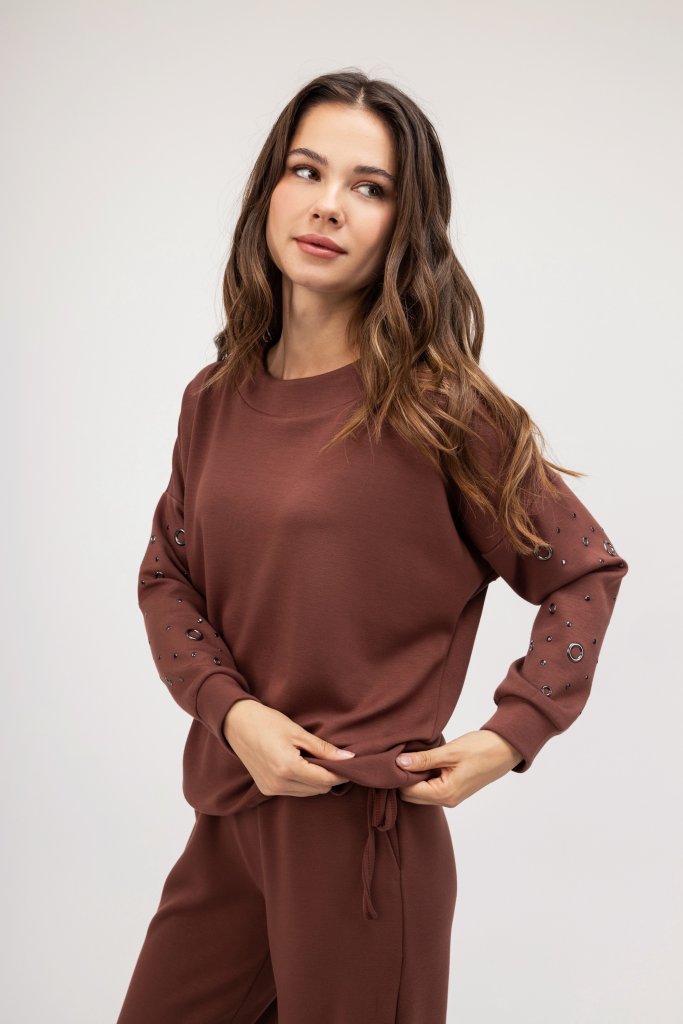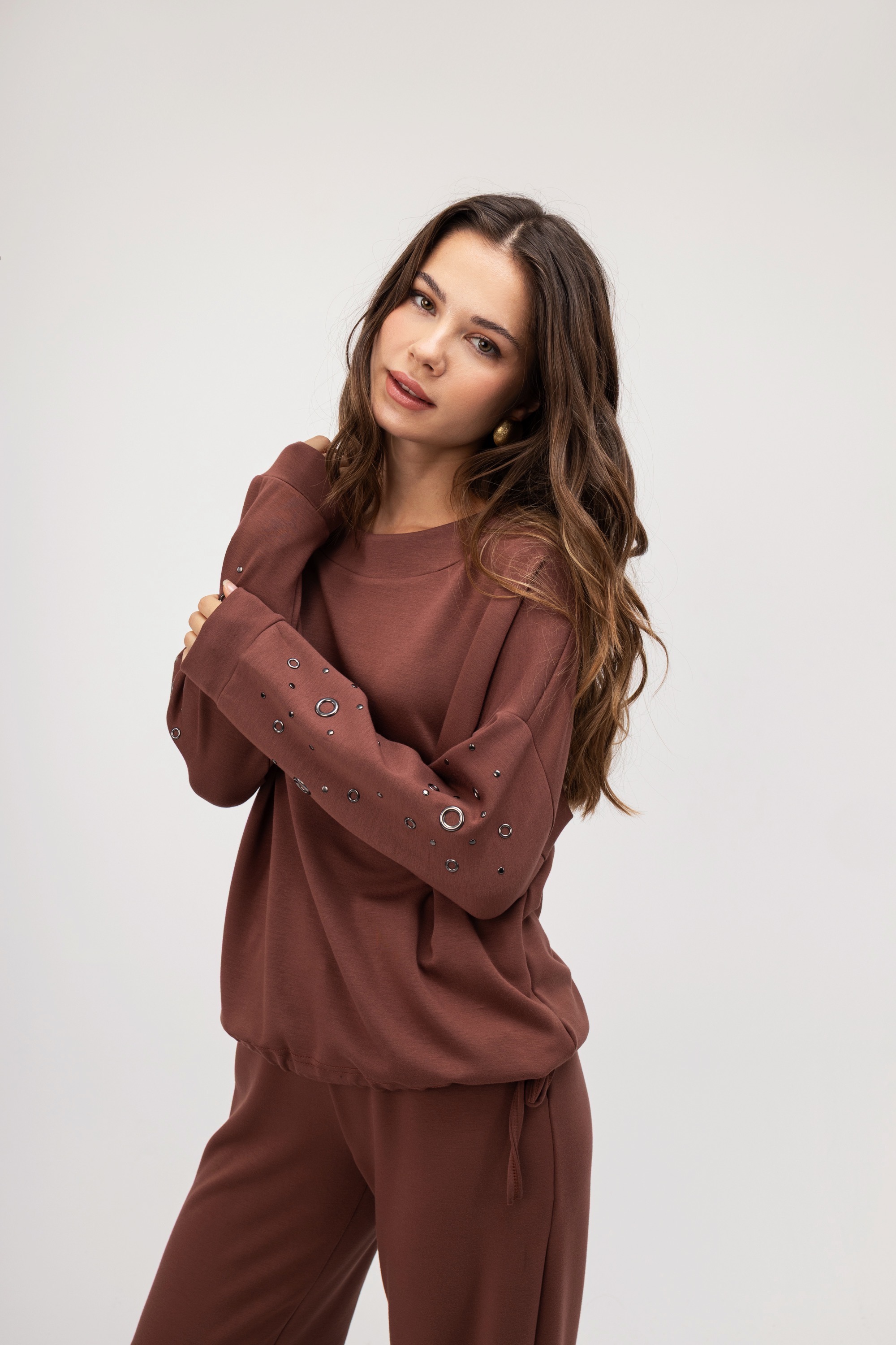 Γυναικείο κανελί φούτερ με τρουκς και στρογγυλή λαιμόκοψη. Άνετο και ευρύχωρο. Μια χειμερινή δημιουργία που μπορεί να φορεθεί με πολλά σύνολα από το πρωί ως το βράδυ. Συνδυάστε το με το αντίστοιχο παντελόνι για ένα υπέροχο αποτέλεσμα.