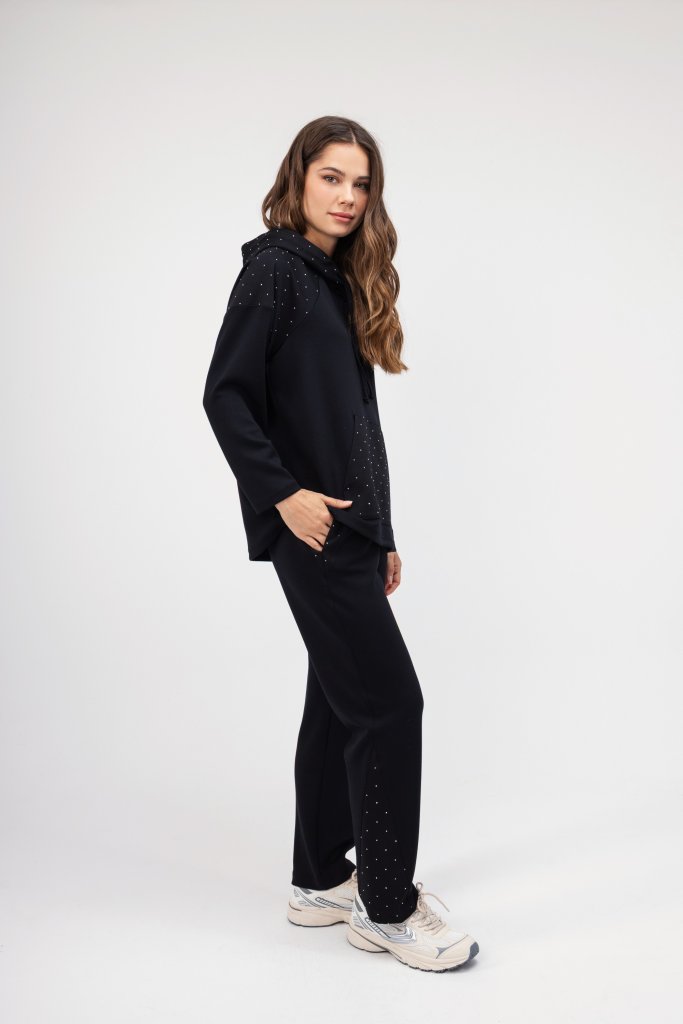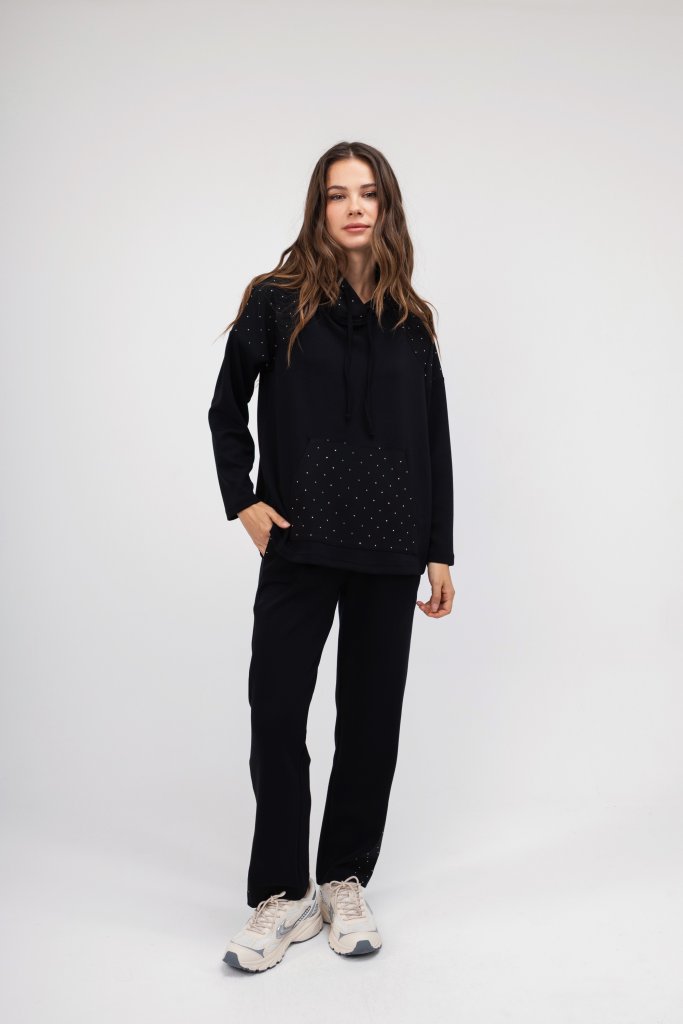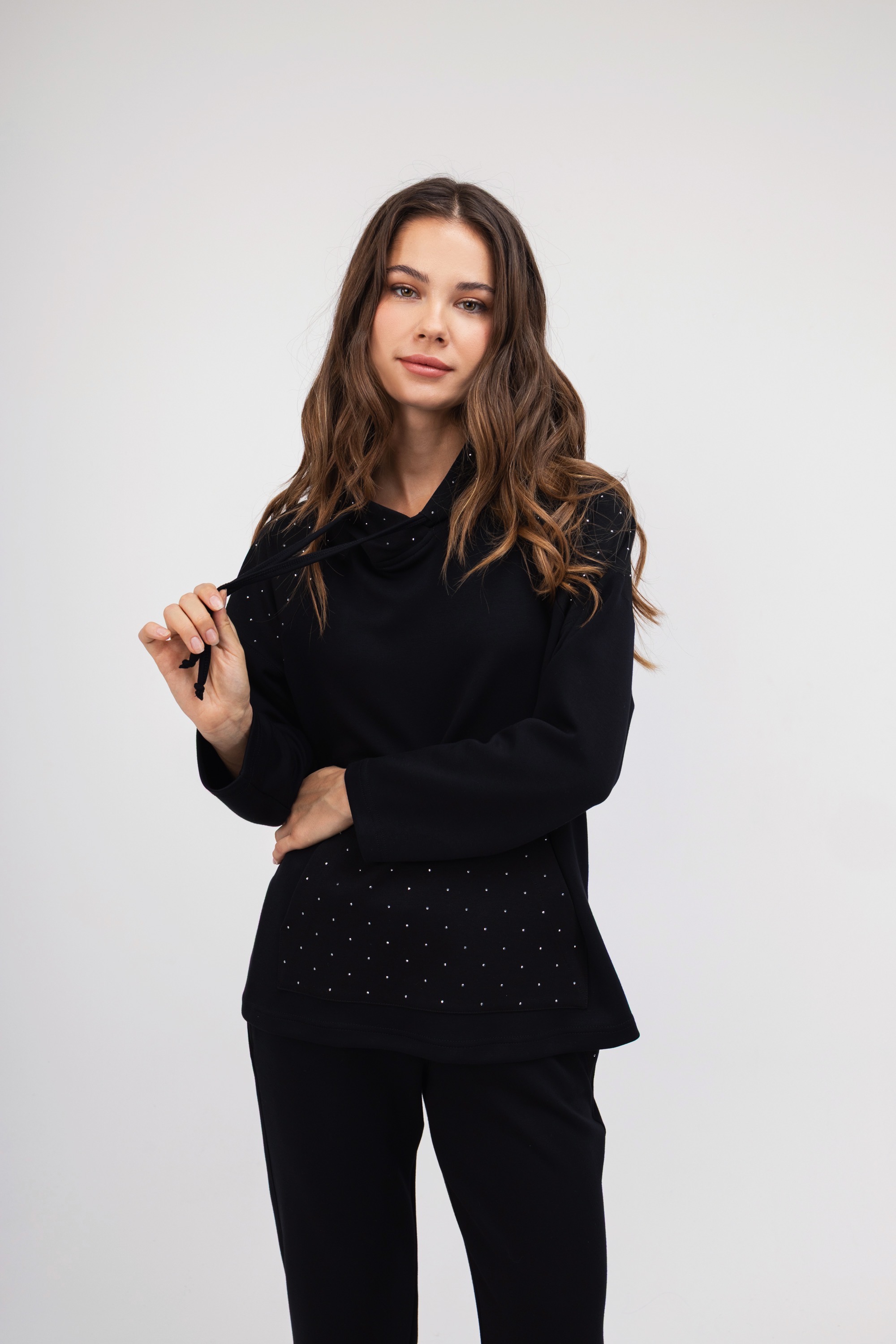 Γυναικείο μαύρο φούτερ με strass, τσέπη και κουκουλα. Άνετο και ευρύχωρο. Μια χειμερινή δημιουργία που μπορεί να φορεθεί με πολλά σύνολα από το πρωί ως το βράδυ. Συνδυάστε το με το αντίστοιχο παντελόνι για ένα υπέροχο αποτέλεσμα.