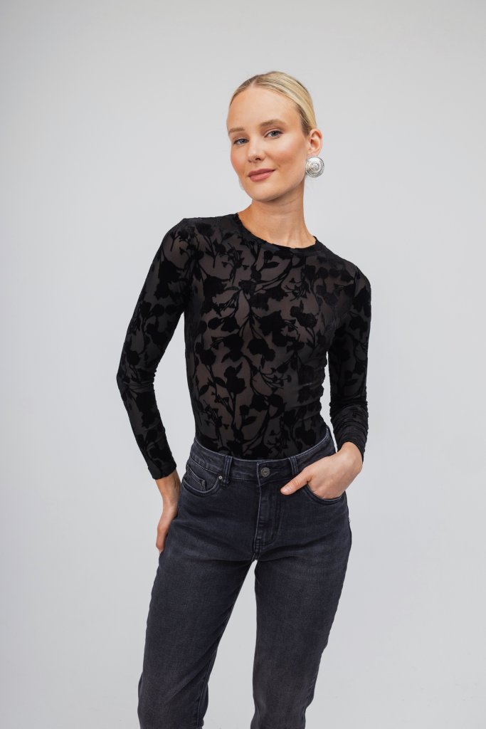 Μαύρο κορμάκι εφαρμοστό με βελουτέ διακριτικές floral λεπτομέρειες σε γήινες αποχρώσεις. Ανανεώστε το βραδινό σας look με αυτό το σχέδιο και ξεχωρίστε σε κάθε σας εμφάνιση.