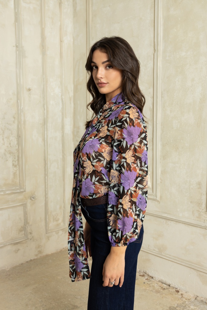Πουκαμίσα με γεωμετρικά σχέδια και φιόγκο στο λαιμό ,στις αποχρώσεις του μωβ και του εκάι.