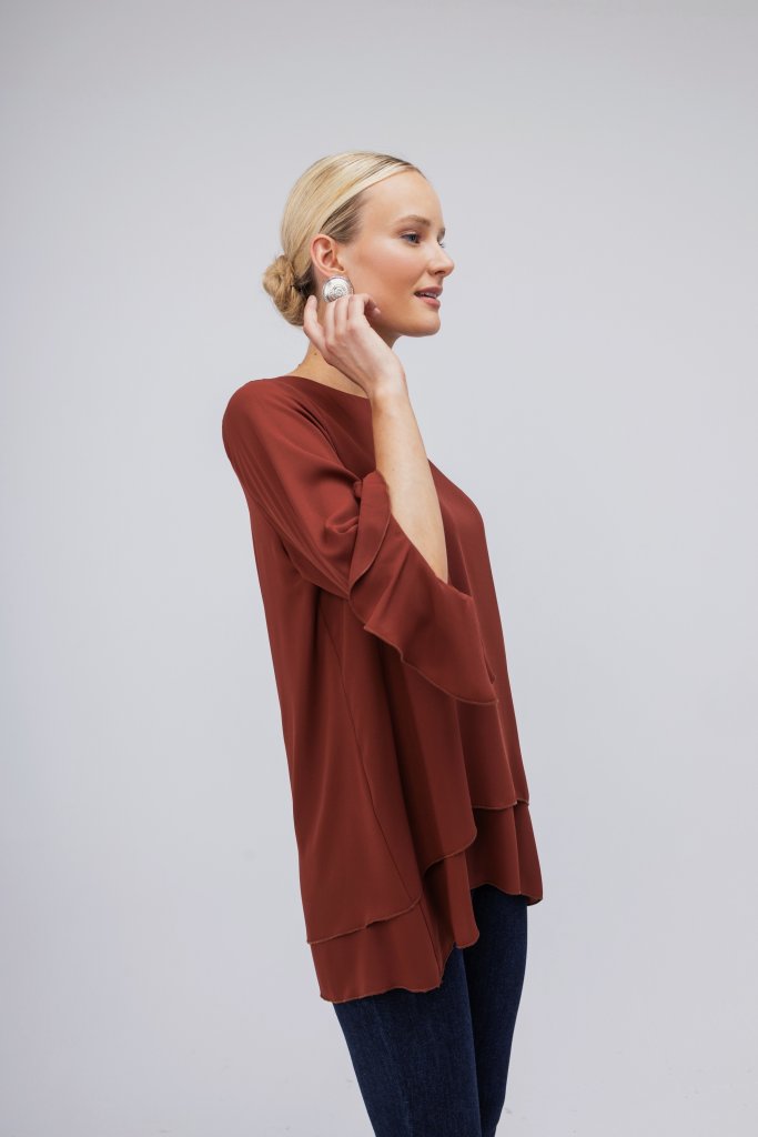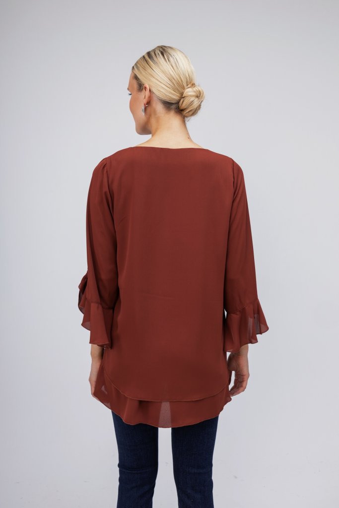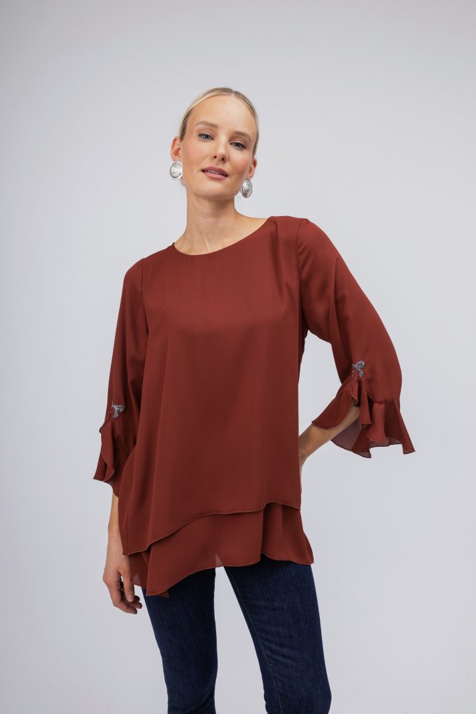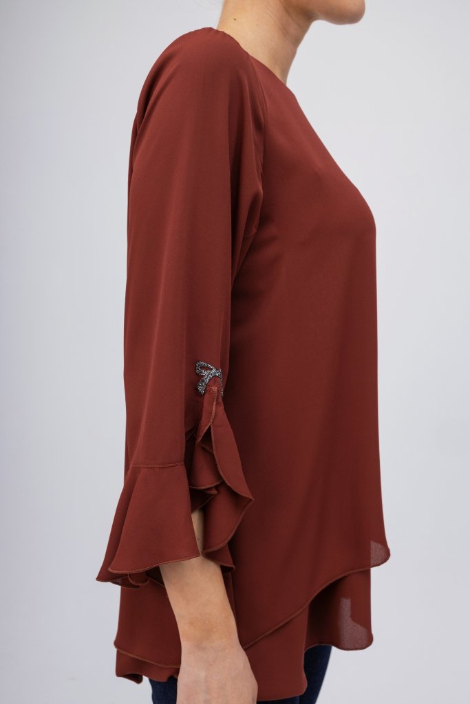 Γυναικεία μπλούζα σε εκάι χρώμα με διακοσμητικό φιογκάκι στα μανίκια και βολάν. Το συγκεκριμένο σχέδιο διαθέτει oversized γραμμή και μπορεί να φορεθεί από το πρωί ως το βράδυ.