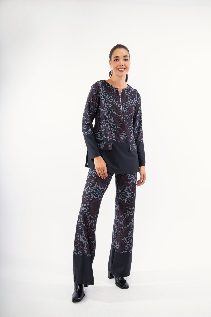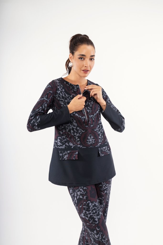 Γυναικεία μπλούζα εμπριμέ με μπορντώ σχέδια από λαχούρια. Διαθέτει φερμουάρ, διακοσμητικές τσέπες και μπλε λεπτομέρειες. Ανανεώστε τη χειμερινή σας συλλογή με αυτή τη μοντέρνα μπλούζα. Συνδυάστε και την αντίστοιχη παντελόνα και δημιουργήστε ένα υπέροχο σετ που θα ξεχωρίσει σε κάθε σας βήμα.