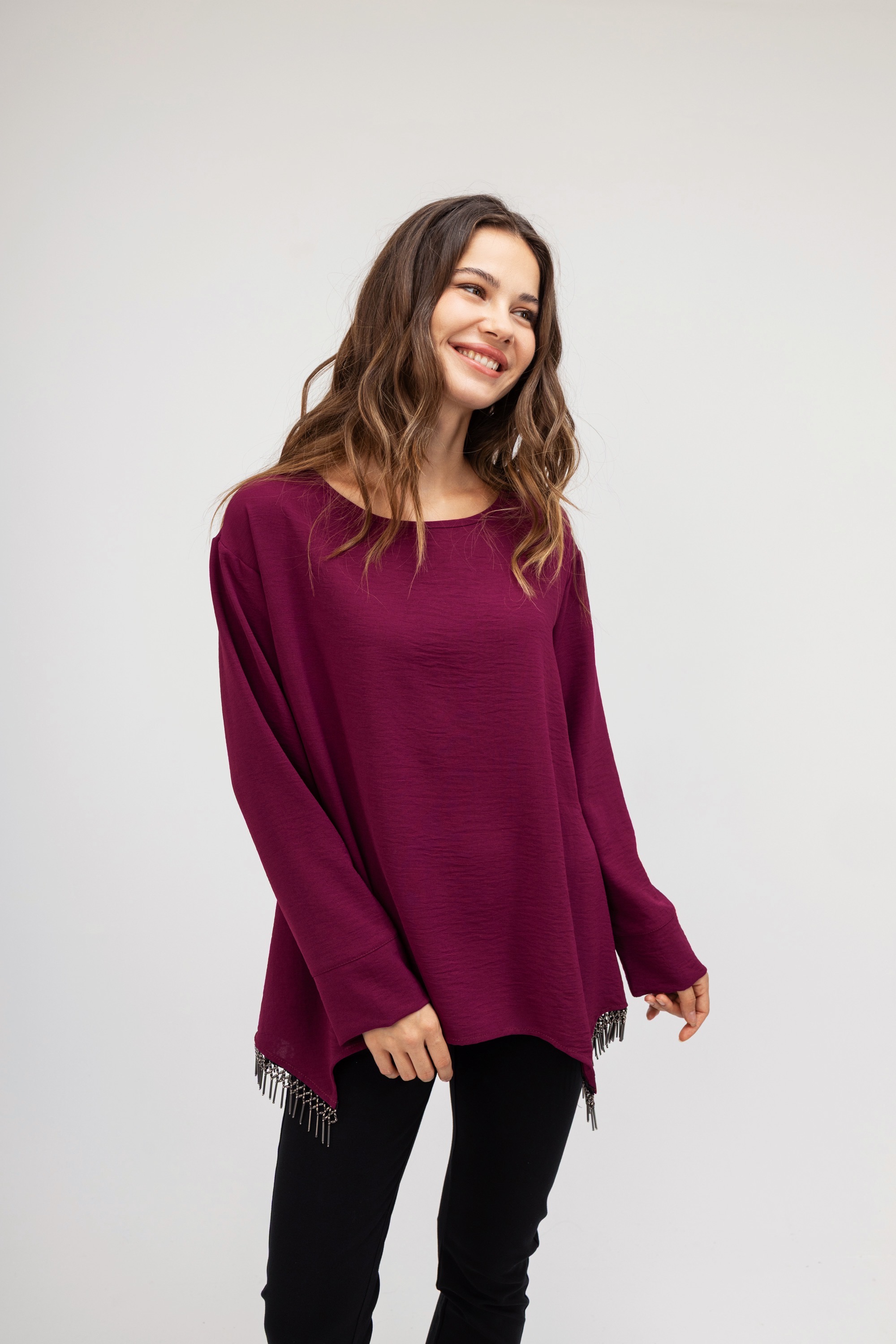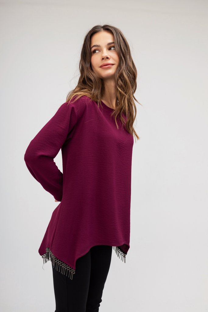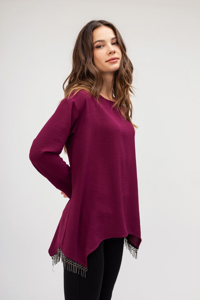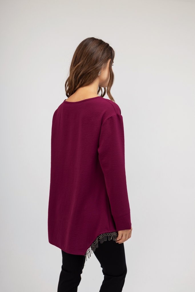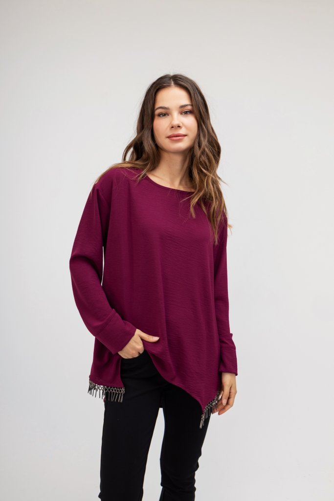 Γυναικεία μπλούζα σε χρώμα ματζέντα με εντυπωσιακά κρόσσια στο τελειώμα . Διαθέτει στρογγυλή λαιμόκοψη. Μια καθημερινή μπλούζα που θα σας χαρίσει μια ξεχωριστή λάμψη στις εμφανίσεις σας.