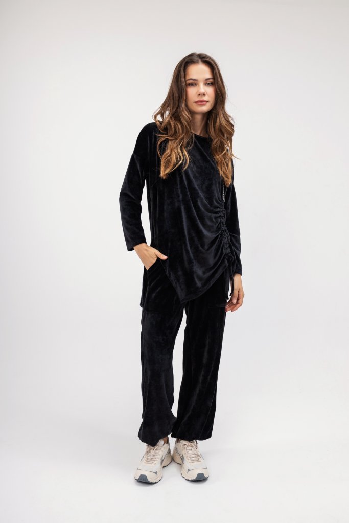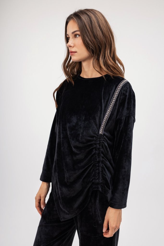 Γυναικεία μπλούζα μαύρη βελουτέ με σούρα και κορδόνι. Διαθέτει εξαιρετικά απαλή υφή και μεταλλικές λεπτομέρειες. Ένα σχέδιο για να ολοκληρώσετε το casual στιλ σας με τον καλύτερο τρόπο. Συνδυάστε την με το αντίστοιχο παντελόνι και αναβαθμίστε το look σας.