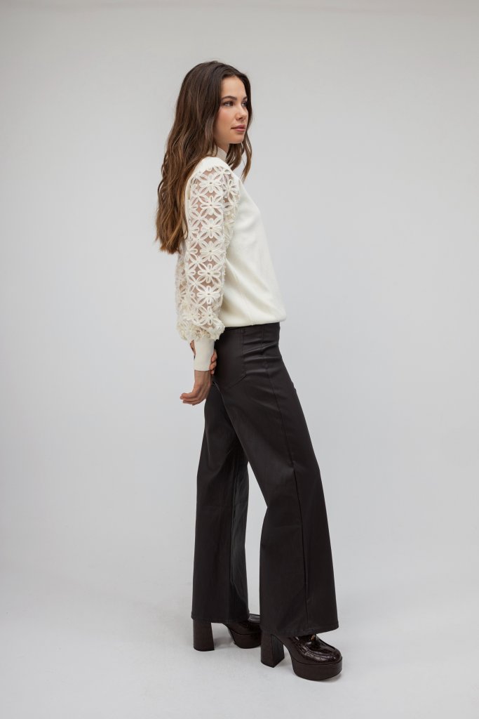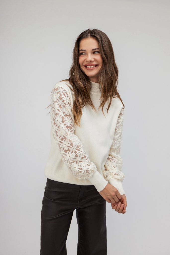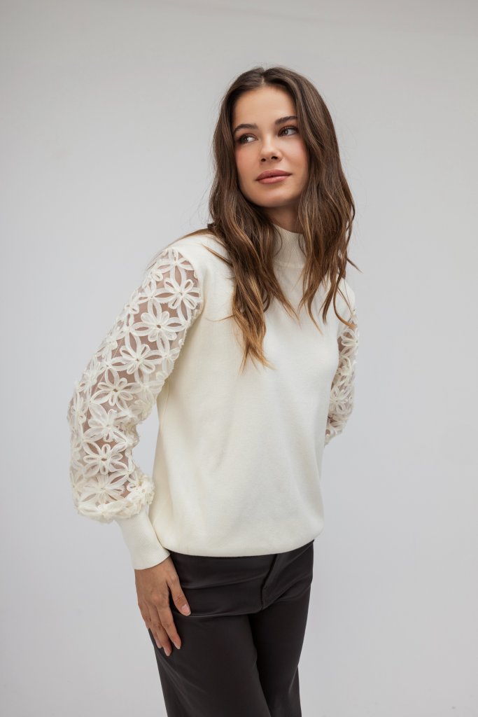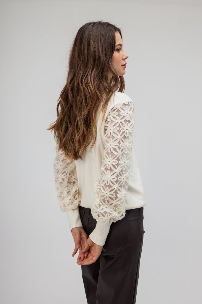 Εντυπωσιακή γυναικεία μπλούζα ζιβάγκο λευκή με διαφάνεια στα μανίκια τα οποία είναι διακοσμημένα με λουλούδια. Μια κομψή και ιδιαίτερη δημιουργία που θα σας χαρίσει λάμψη και στυλ σε κάθε σας βήμα.