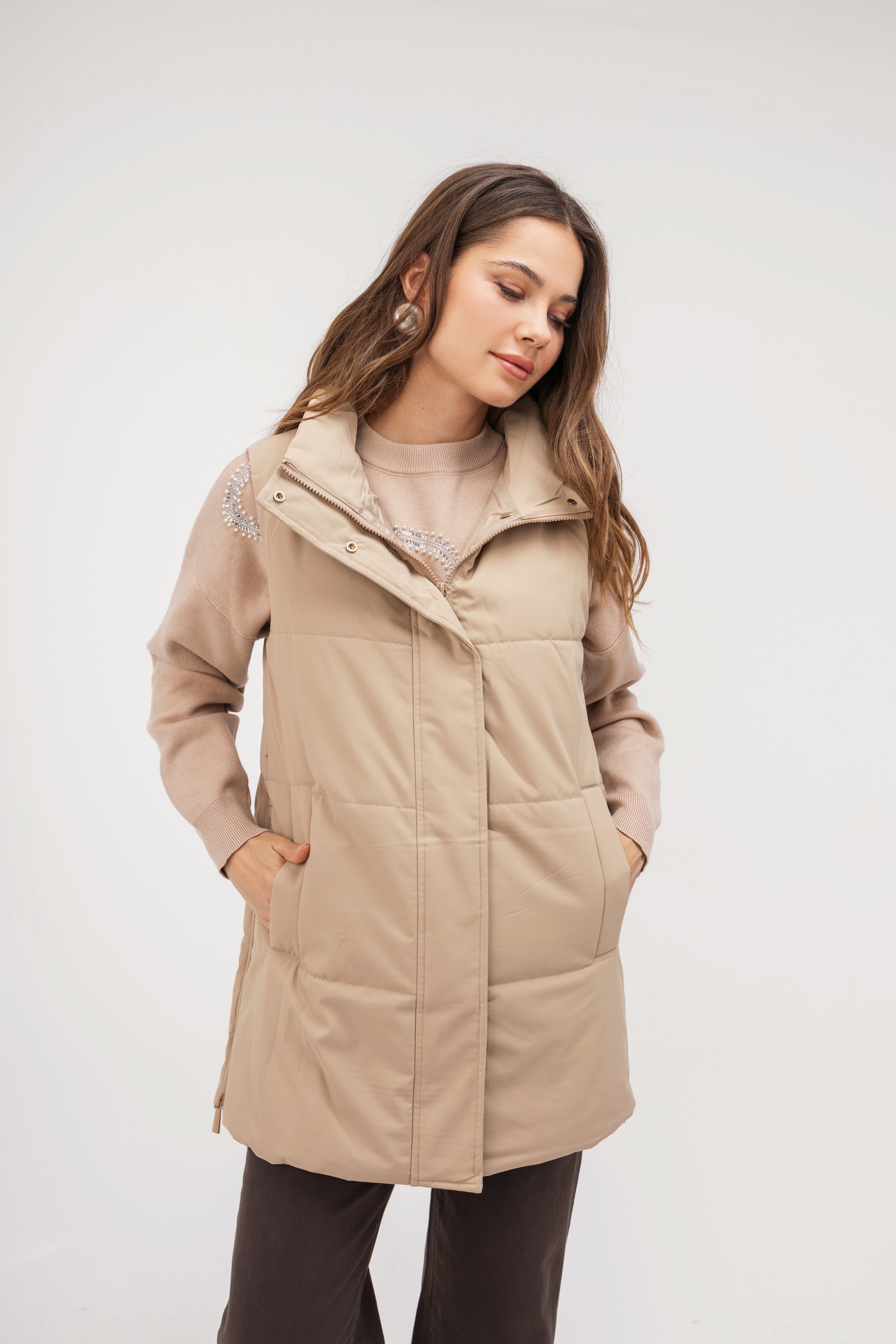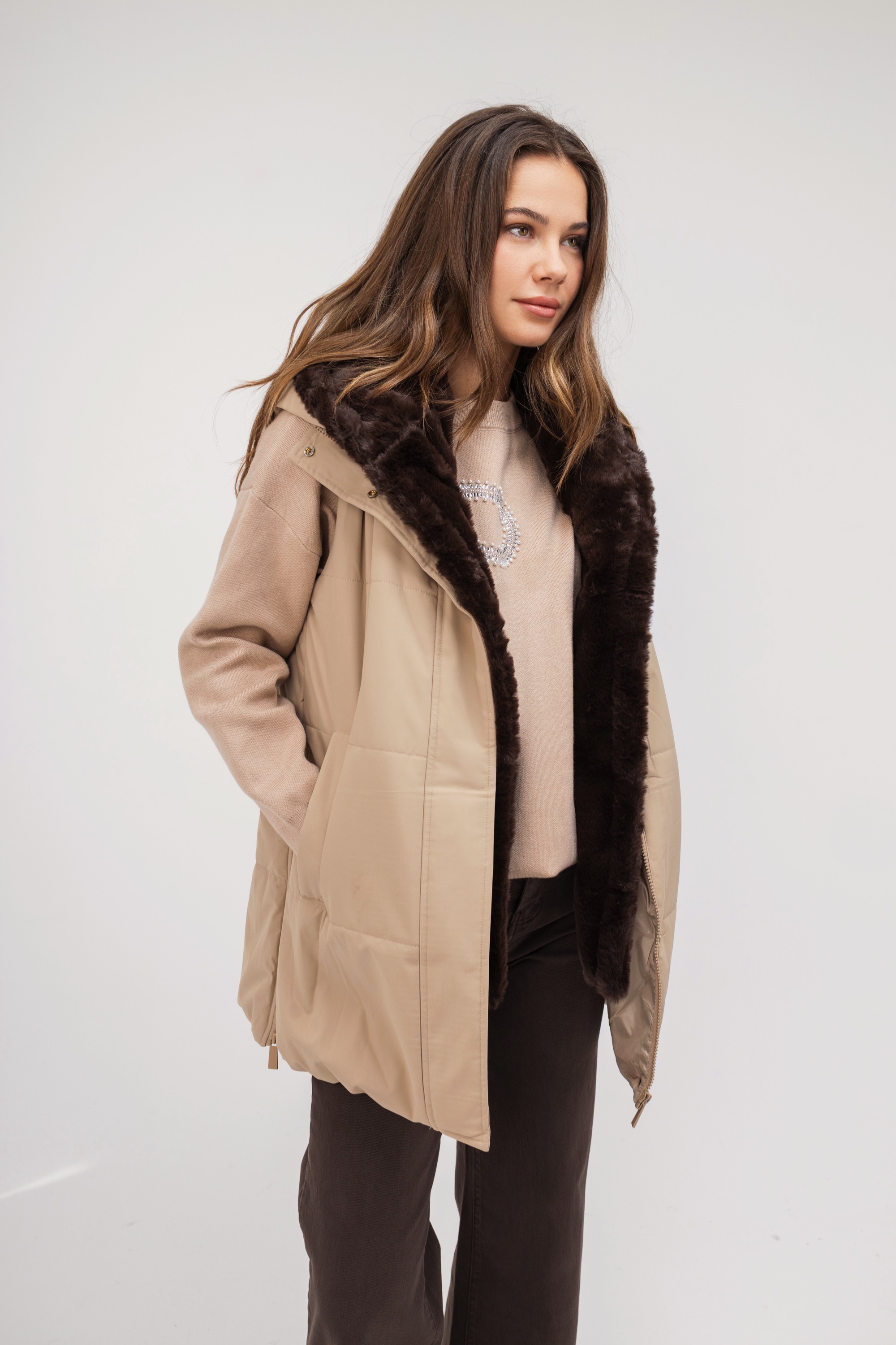 Γυναικείο μπουφάν αμάνικο από ύψηλής ποιότητας υλικά και απόσπώμενη οικολογική γούνα για να σας χαρίσει στυλ και ζεστασία σε κάθε εμφάνιση. Κλείσιμο με κουμπιά και λειτουργικό φερμουάρ.