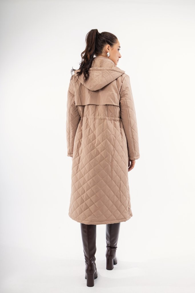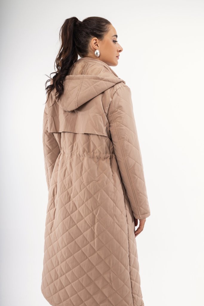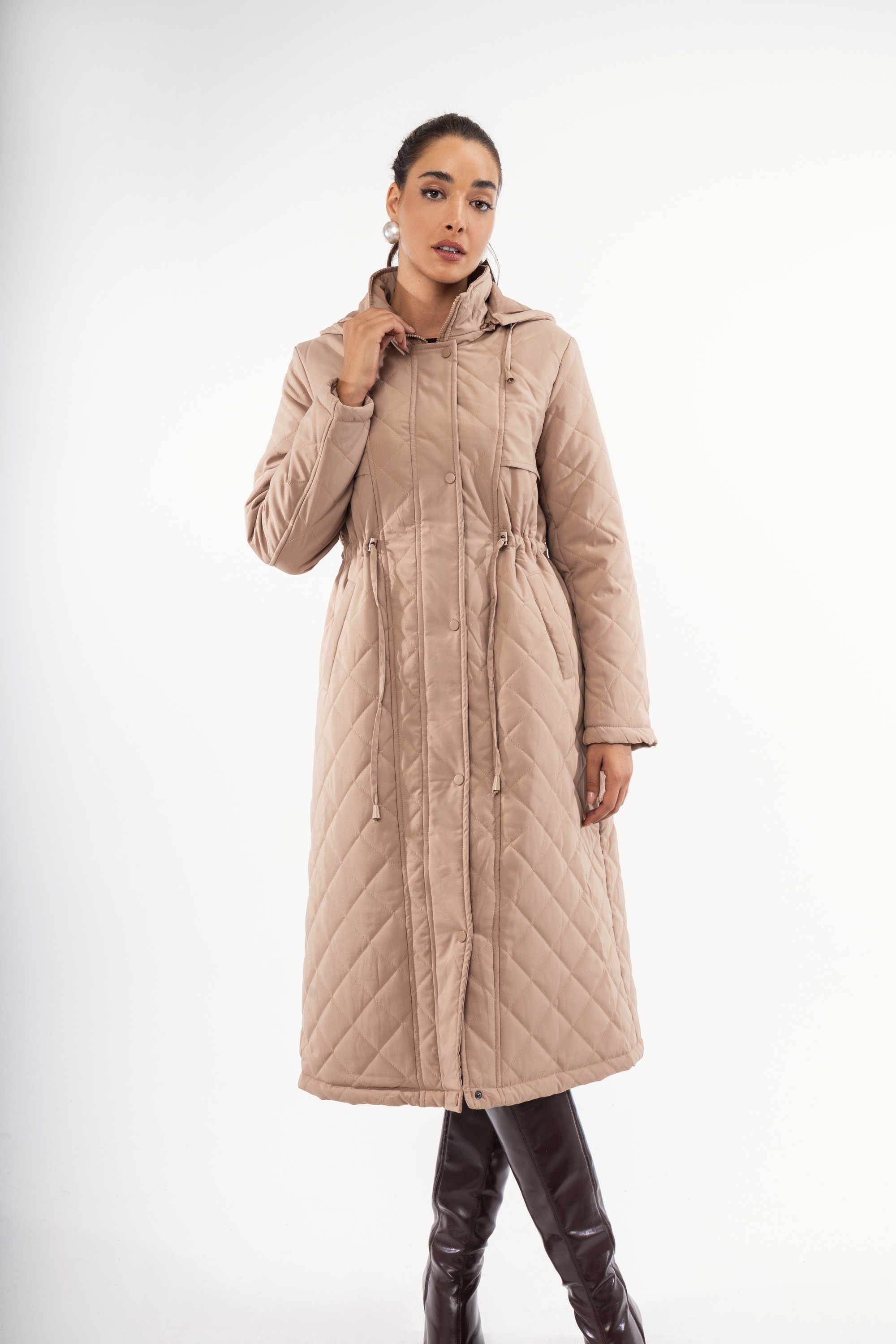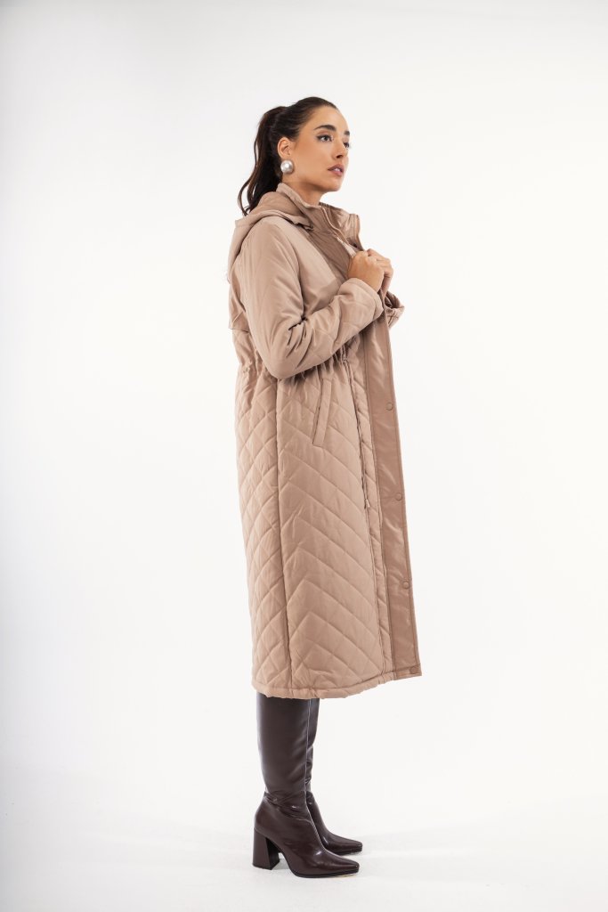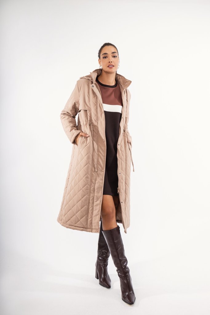 Γυναικείο μπεζ μπουφάν μακρύ σε καπιτονέ σχέδιο. Κλείσιμο με λειτουργικό φερμουάρ και κουμπιά. Διαθέτει κουκούλα και τσέπες. Μια μονόχρωμη και απλή επιλογή που μπορεί να συνδυαστεί με πολλά σύνολα από το πρωί ως το βράδυ και να σας κρατήσει κομψές και ζεστές.