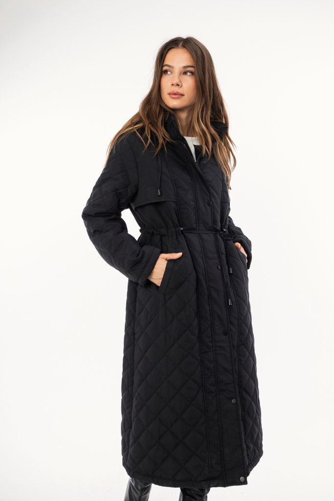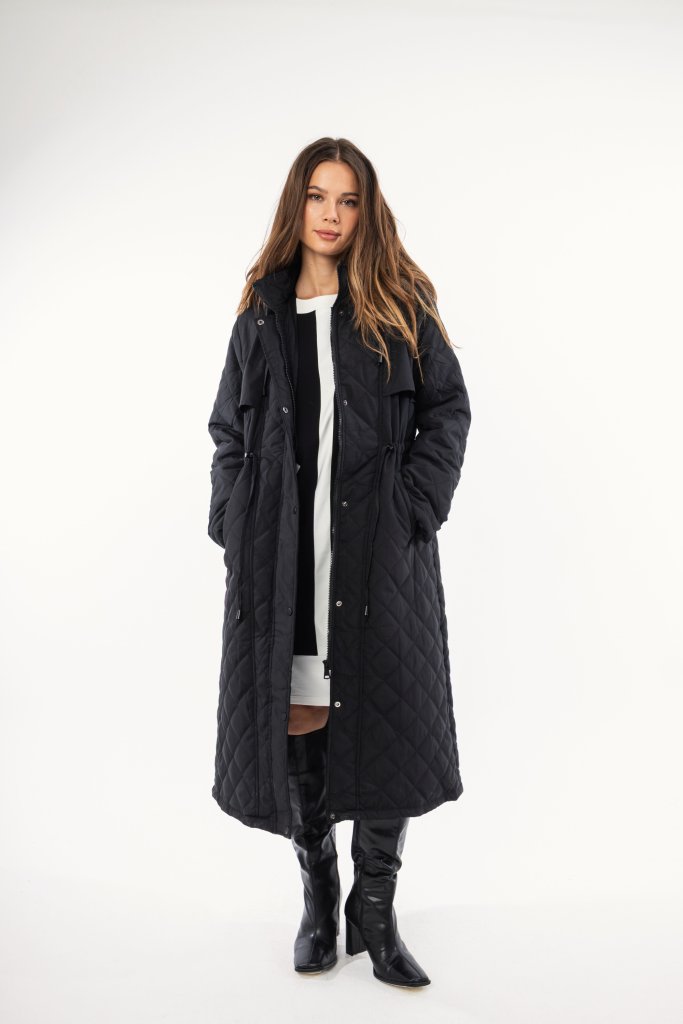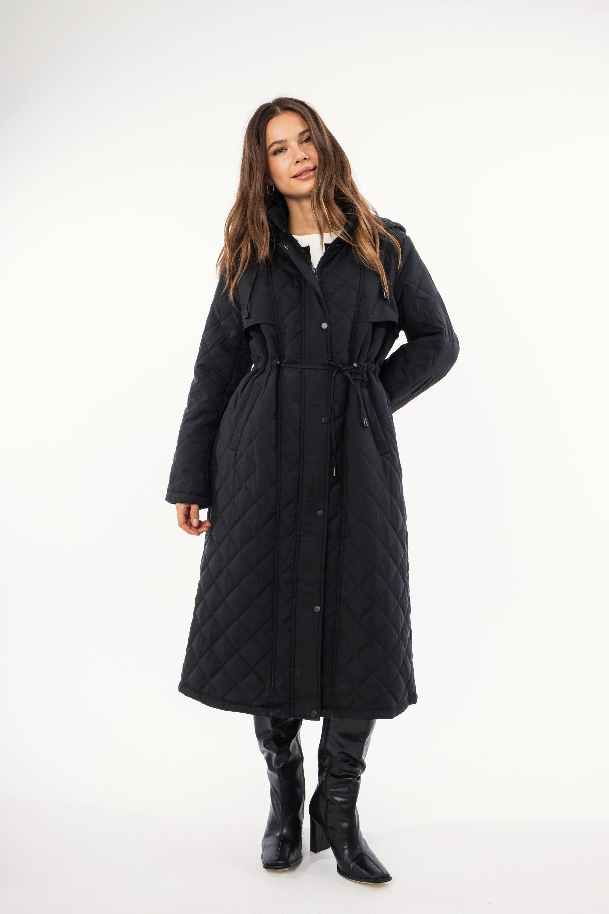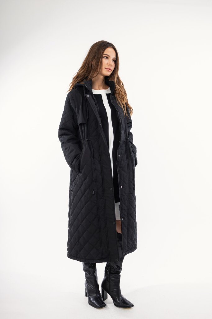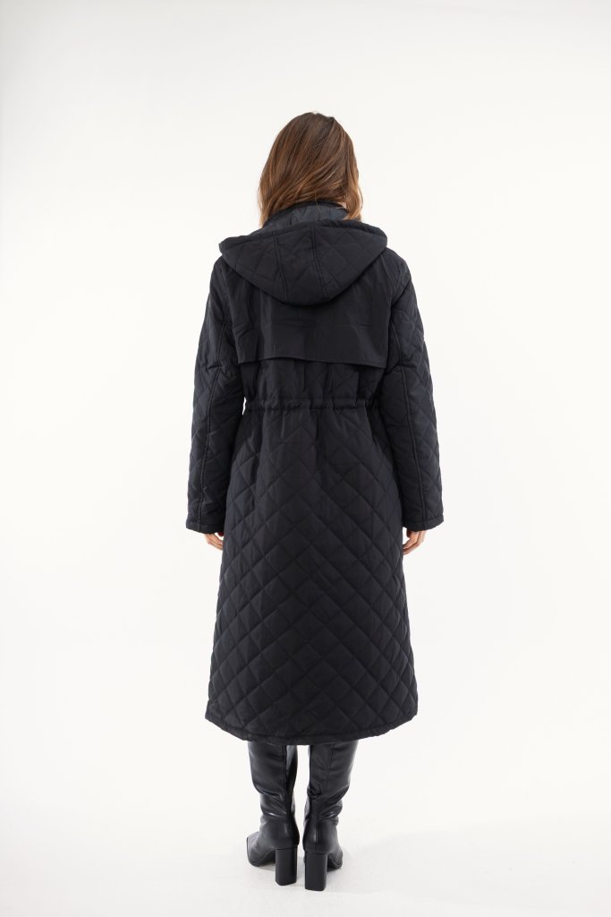 Γυναικείο μαύρο μπουφάν σε καπιτονέ σχέδιο. Κλείσιμο με λειτουργικό φερμουάρ και κουμπιά. Διαθέτει κουκούλα και τσέπες. Μια μονόχρωμη και απλή επιλογή που μπορεί να συνδυαστεί με πολλά σύνολα από το πρωί ως το βράδυ και να σας κρατήσει κομψές και ζεστές.