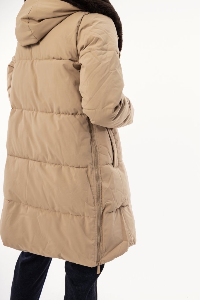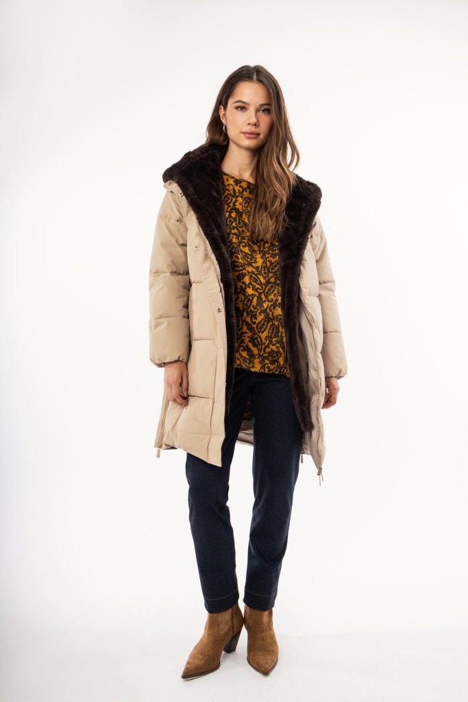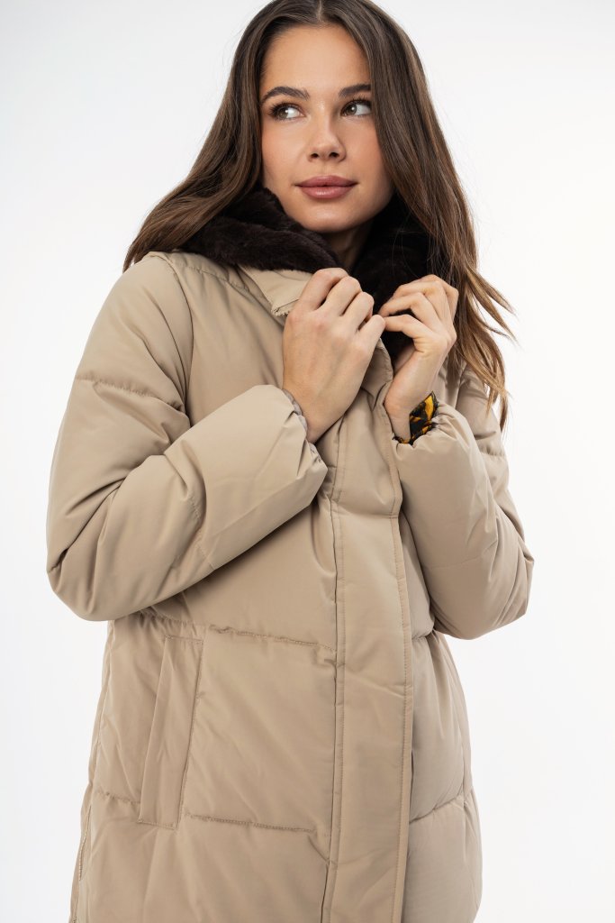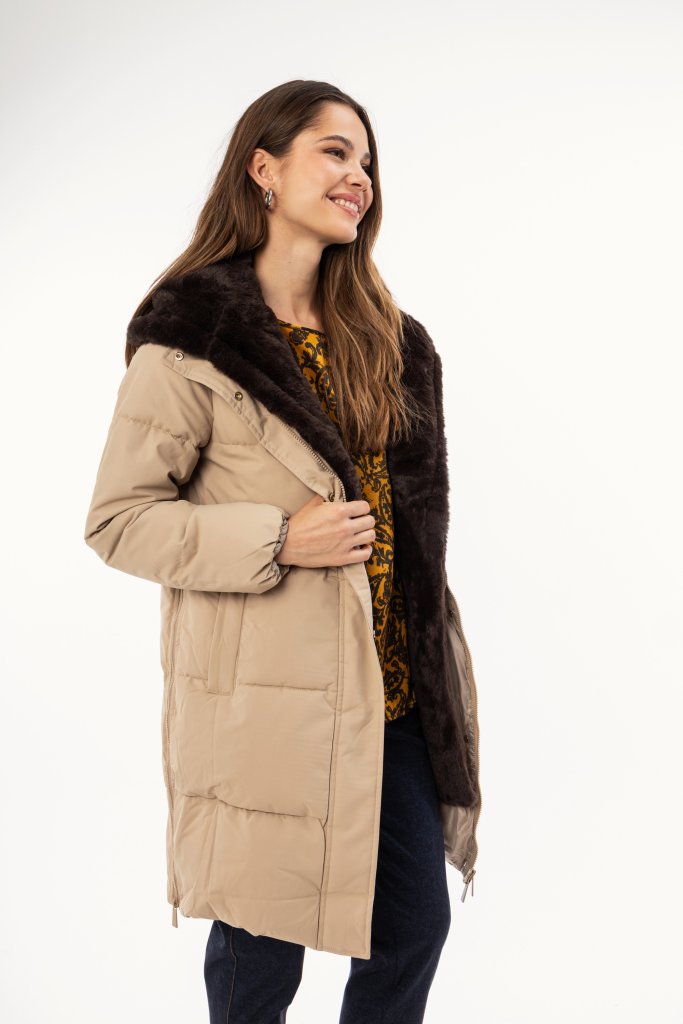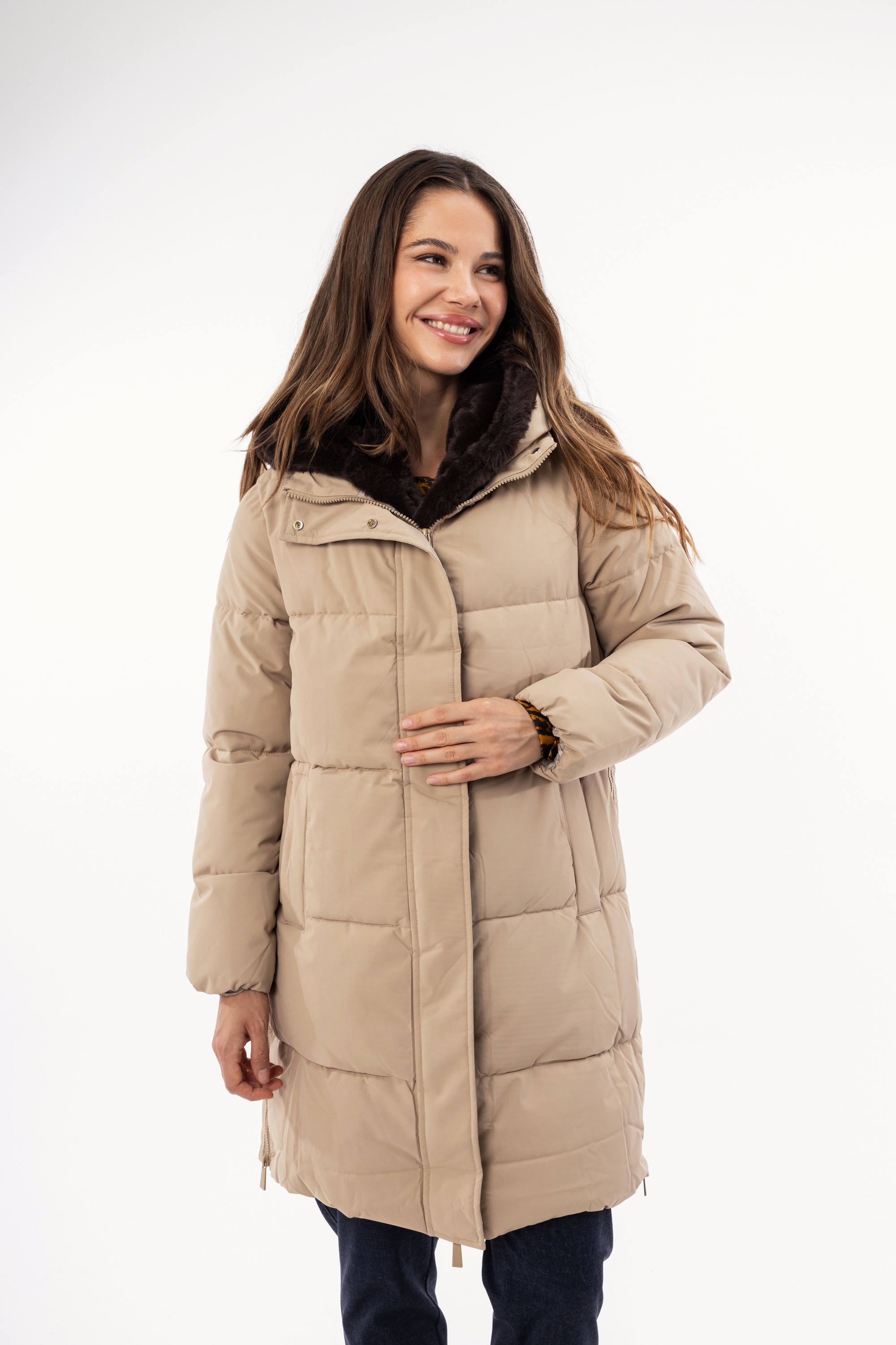 Γυναικείο μπεζ μπουφάν με εσωτερική καφέ οικολογική γούνα. Κλείσιμο με λειτουργικό φερμουάρ και κουμπιά. Διαθέτει κουκούλα και τσέπες. Μια δημιουργία για κάθε στιγμή της ημέρας που είναι ιδανική να σας κρατήσεις ζεστές και ασφαλής τις κρύες μέρες του χειμώνα.