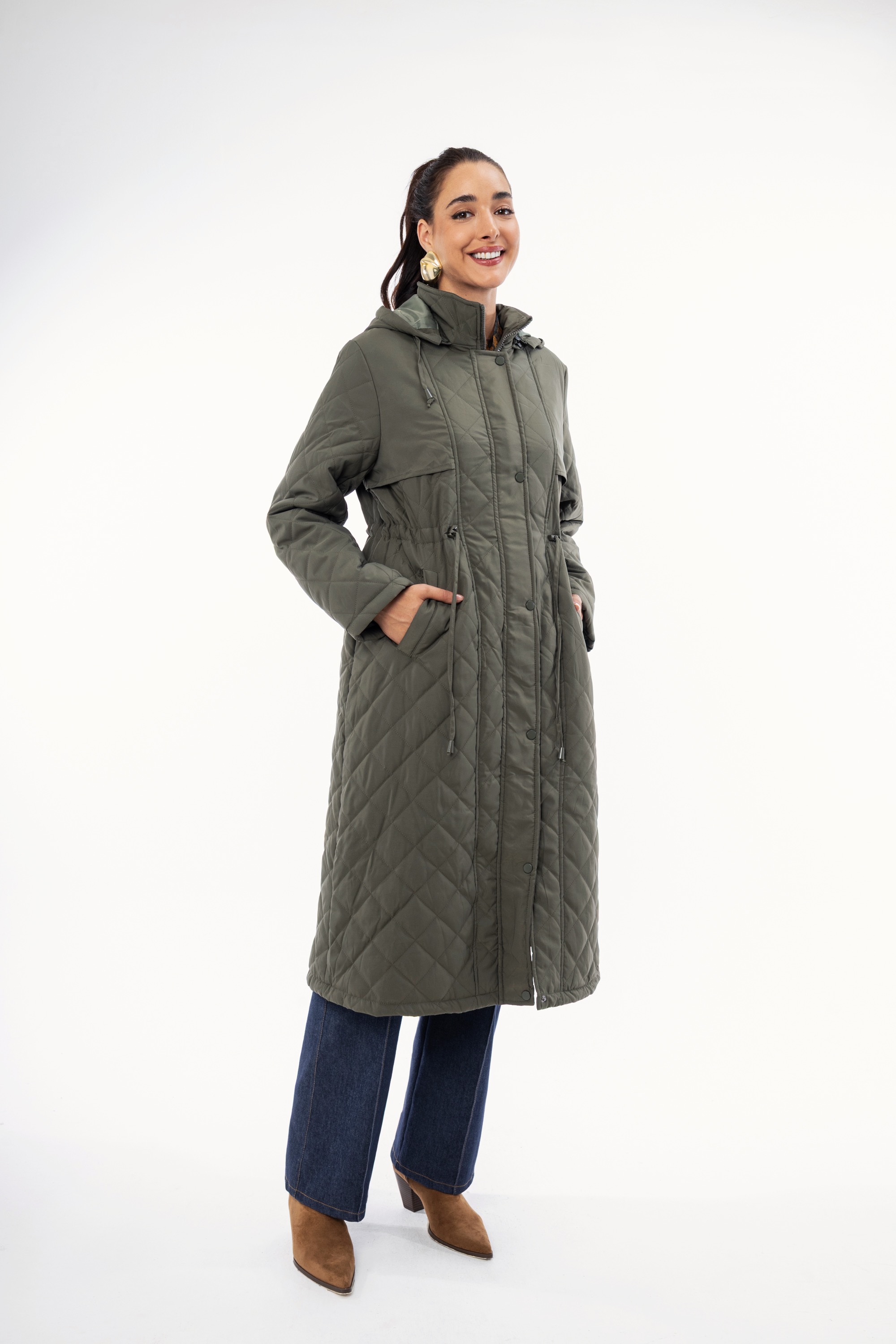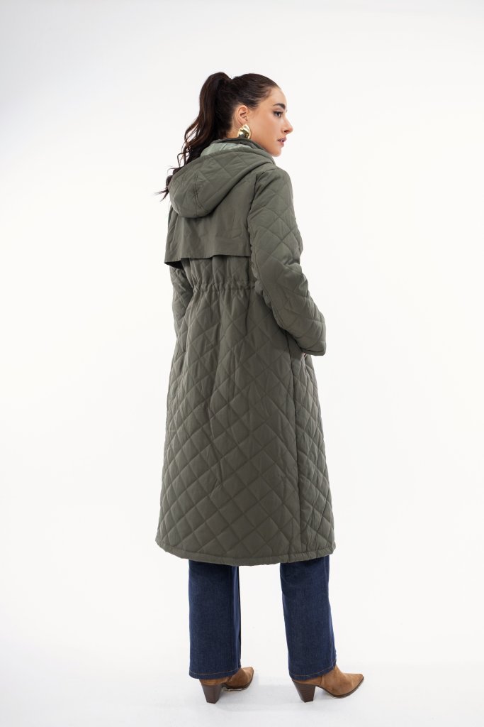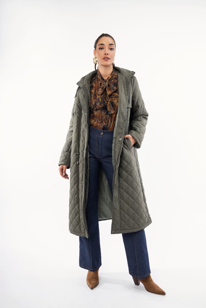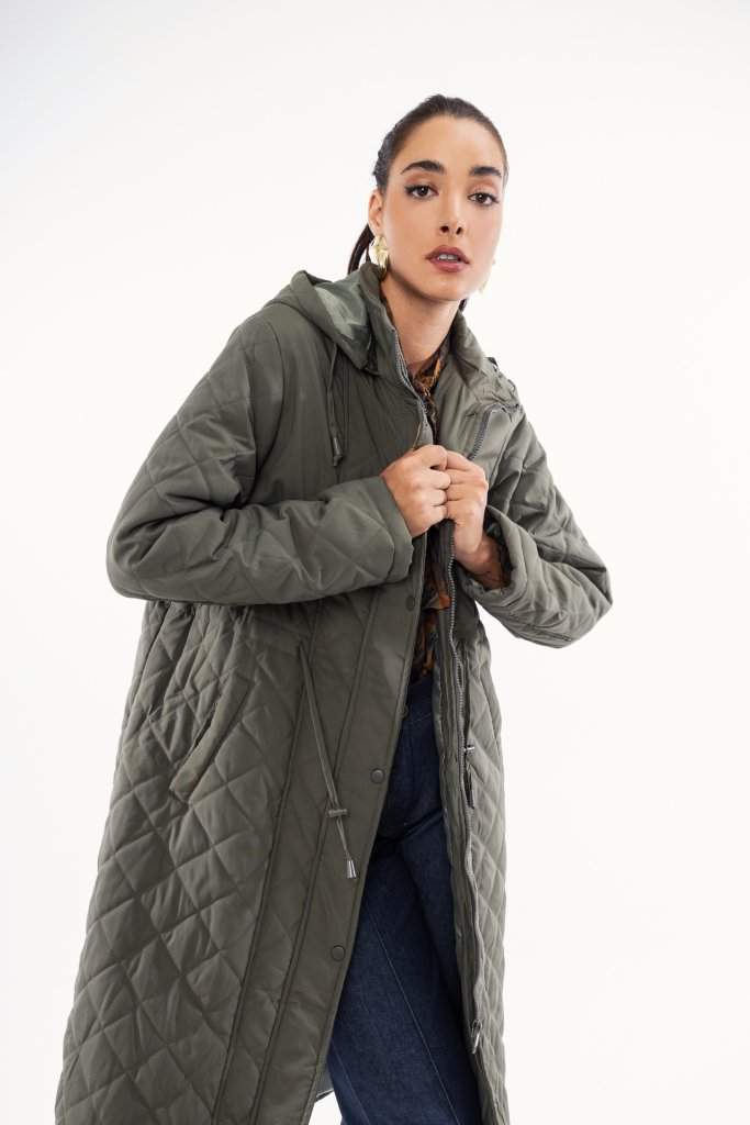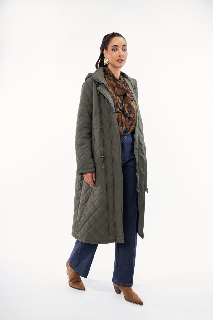 Γυναικείο χακί μπουφάν μακρύ σε καπιτονέ σχέδιο. Κλείσιμο με λειτουργικό φερμουάρ και κουμπιά. Διαθέτει κουκούλα και τσέπες. Μια μονόχρωμη και απλή επιλογή που μπορεί να συνδυαστεί με πολλά σύνολα από το πρωί ως το βράδυ και να σας κρατήσει κομψές και ζεστές.