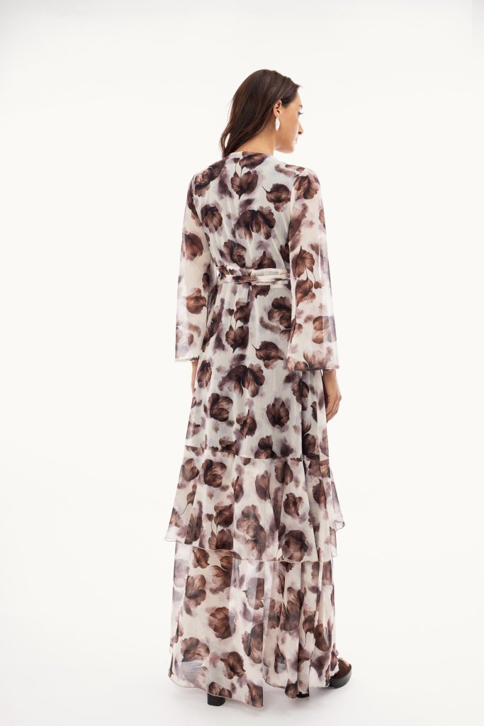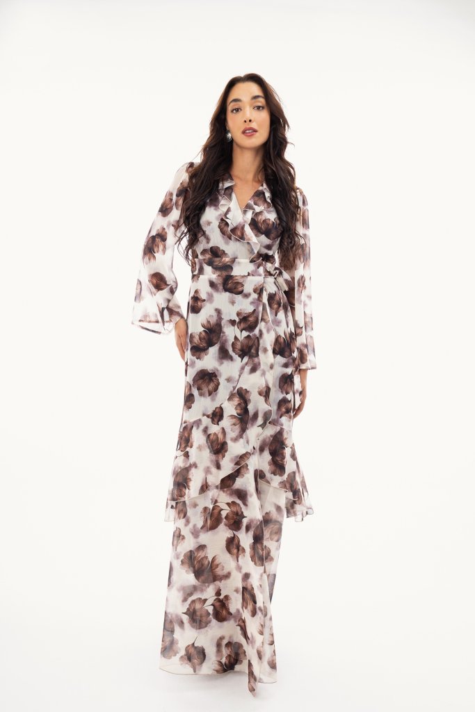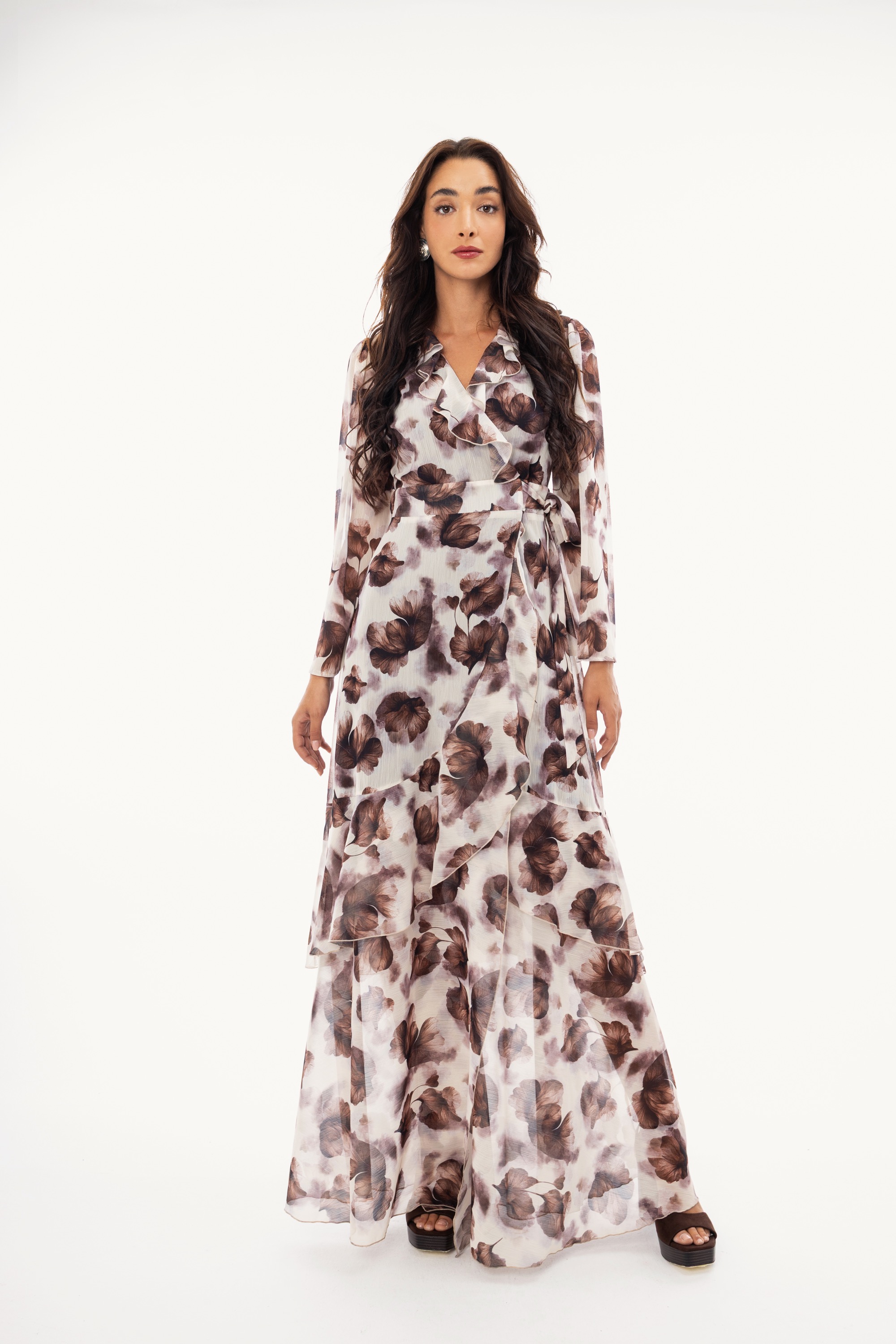 Φόρεμα κρουαζέ σε καφέ χρώμα με φραμπαλά και φλοράλ μοτίβο. Ένα ιδιαίτερα εντυπωσιακό σχέδιο που θα γίνει το αγαπημένο σας κομμάτι για τις βραδινές σας εξόδους. Κομψό και μοντέρνο που θα τραβήξει όλα τα βλέμματα πάνω σας.