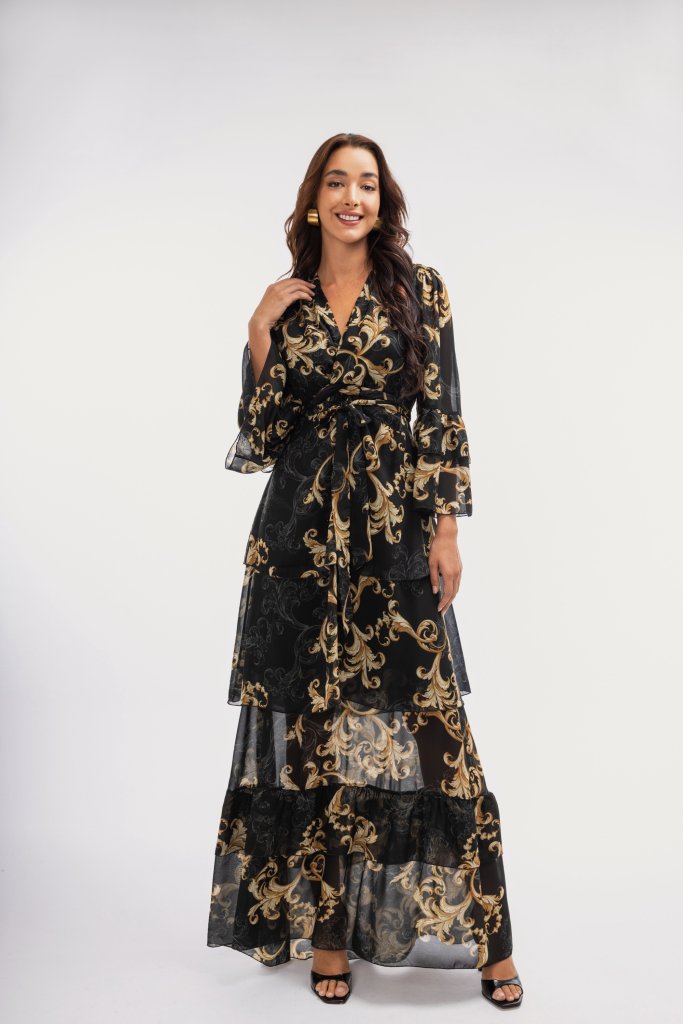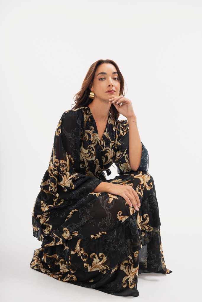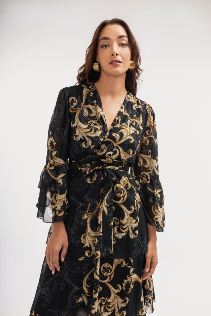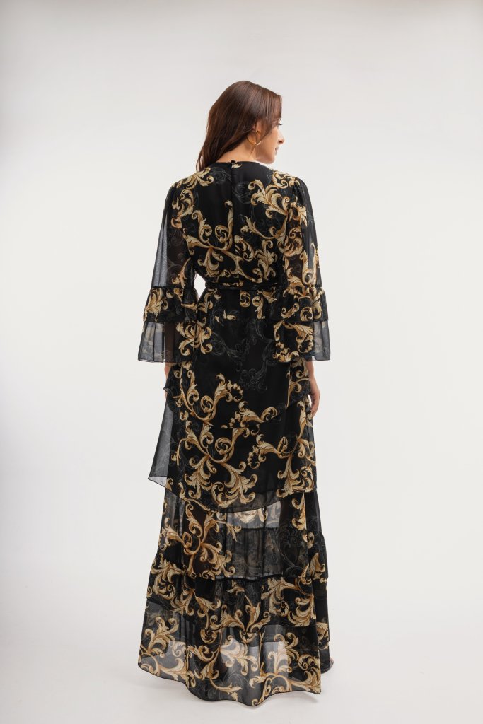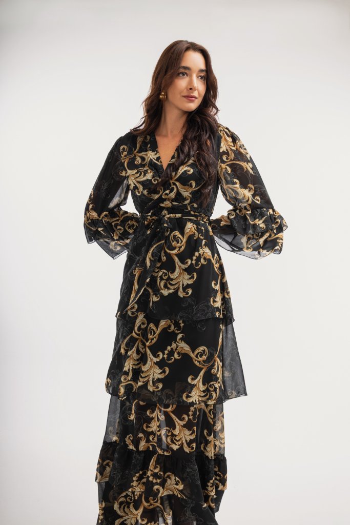 Φόρεμα maxi κρουαζέ με δέσιμο στο πλάι εμπριμέ μαύρο