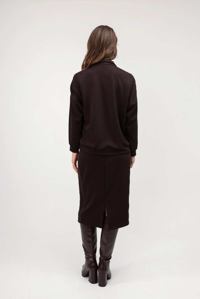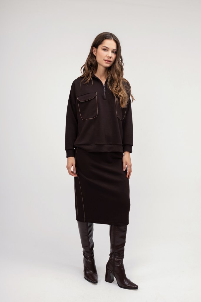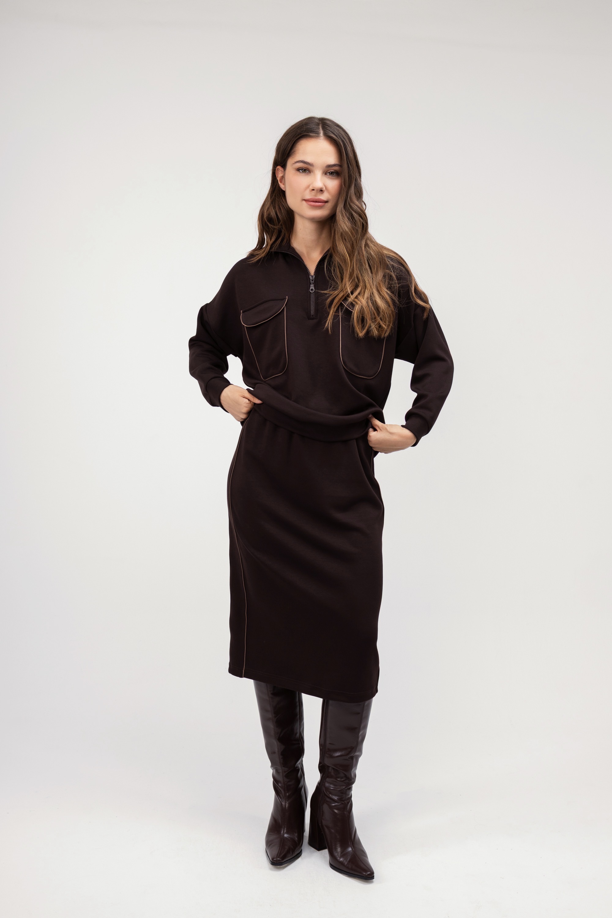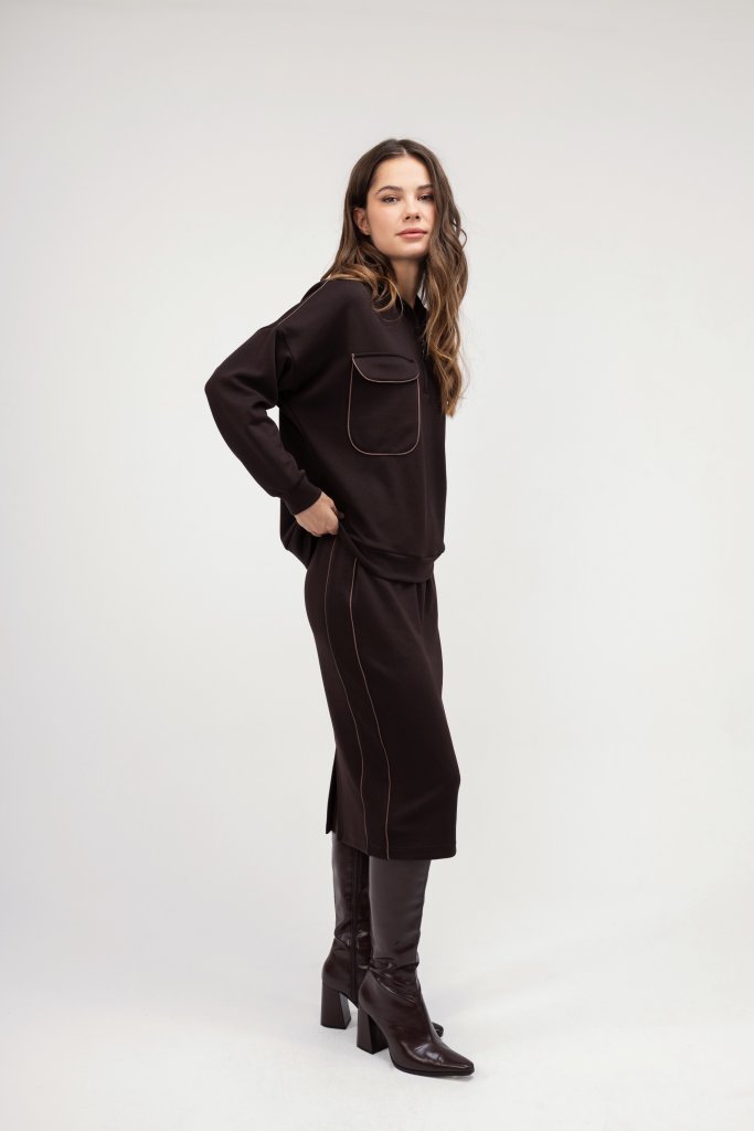 Γυναικεία φούστα μίντι, εφαρμοστή σε καφέ χρώμα. Με μαύρες λεπτομέρειες στα πλαινά μέρη και σκίσιμο στο πίσω μέρος. Μια τέλεια επιλογή που μπορεί να φορεθεί για ένα πρωινό casual look αλλά και για μια χαλαρή απογευματινή βόλτα. Συνδυάστε το με το αντίστοιχο φούτερ και δημιουργήστε ένα υπέροχο outfit.