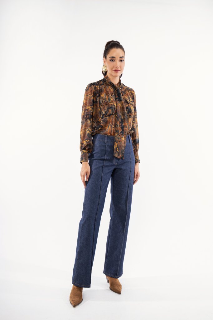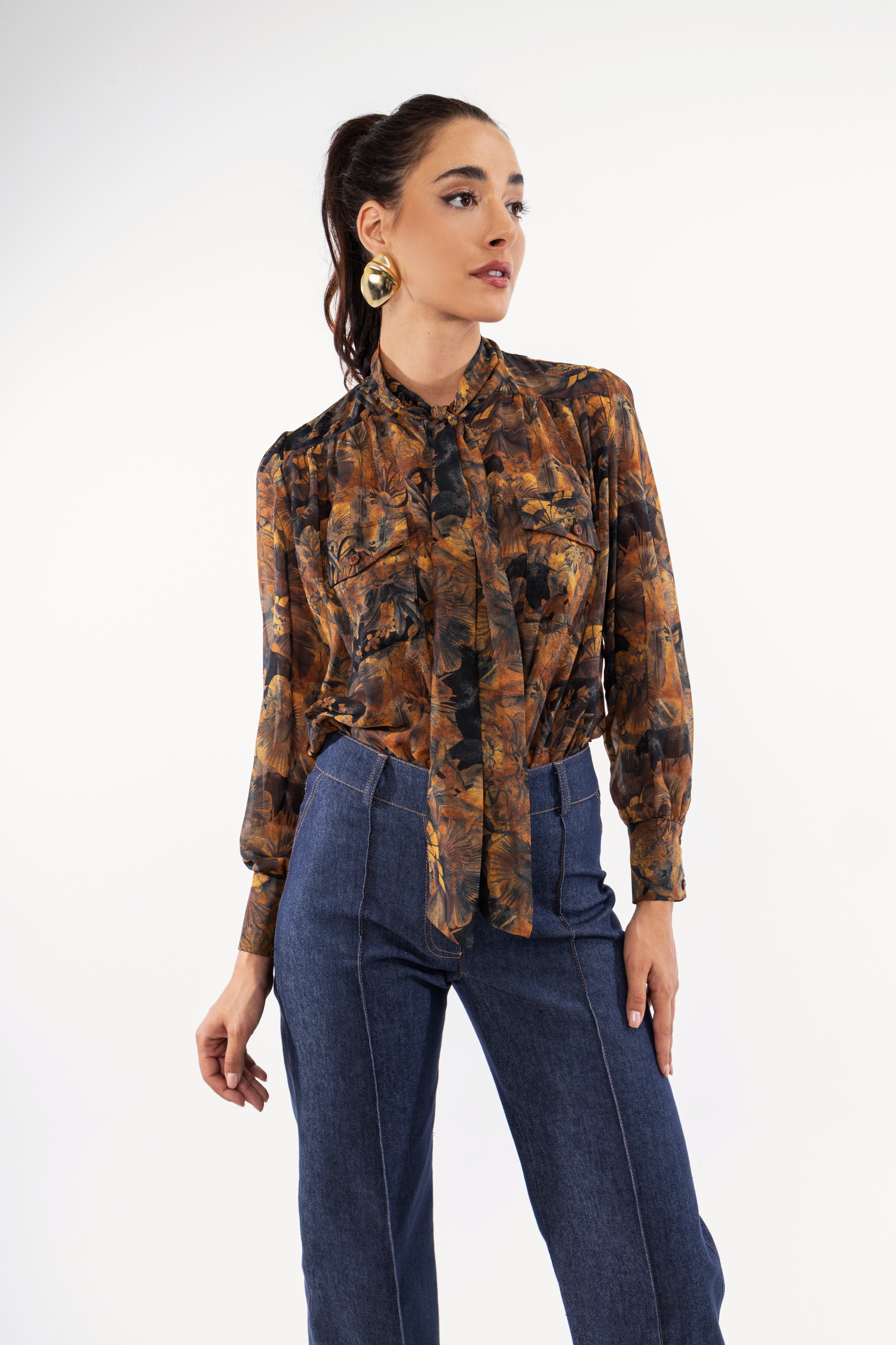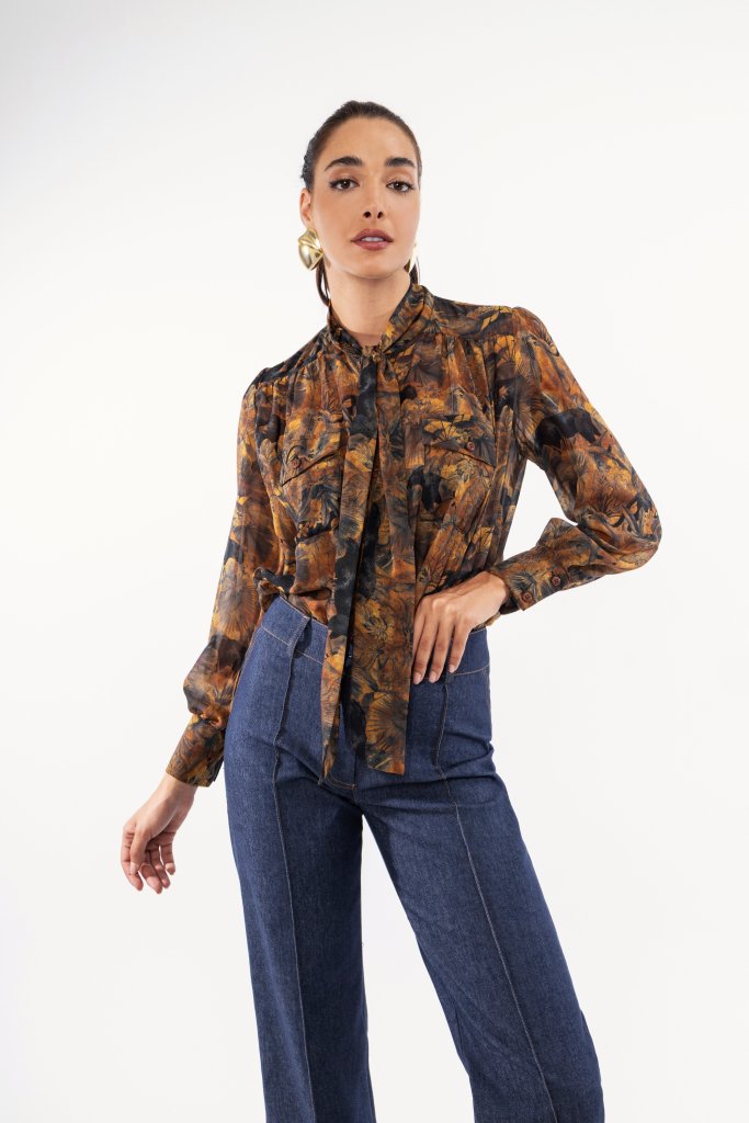 Πουκάμισο σε κίτρινο χρώμα το οποίο είναι εμπριμέ, έχει ιδιαίτερο δέσιμο στον λαιμό και διαθέτει δύο μικρές τσέπες στο μπροστινό μέρος.