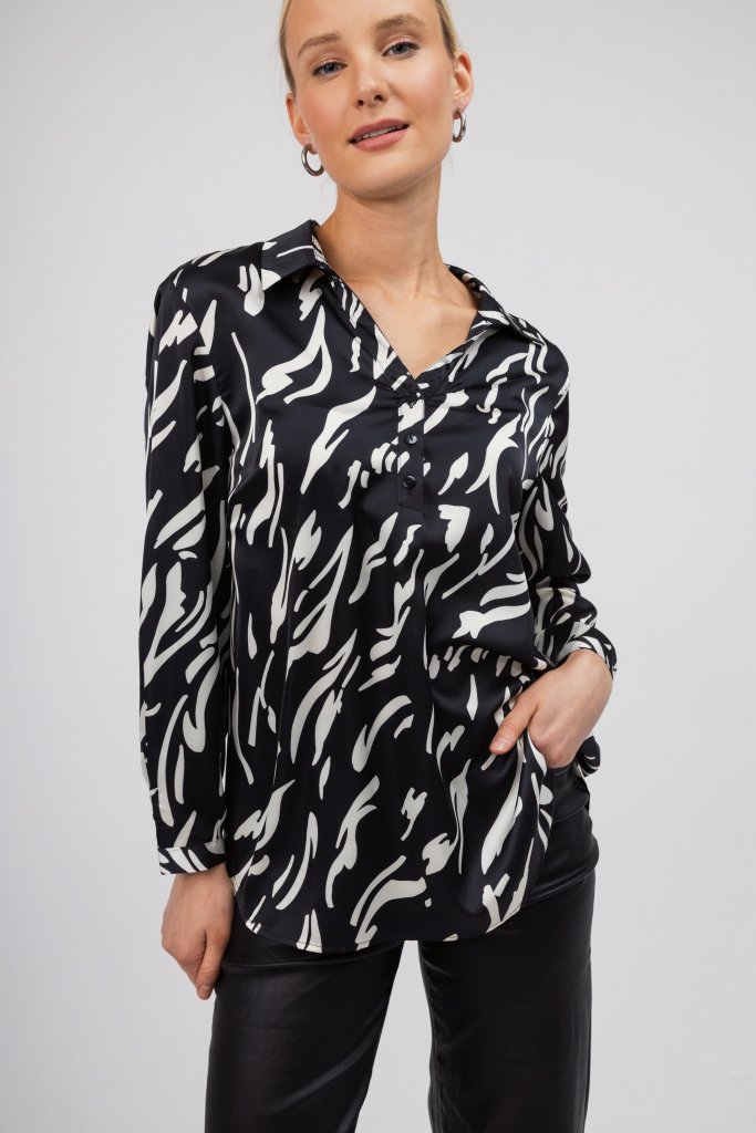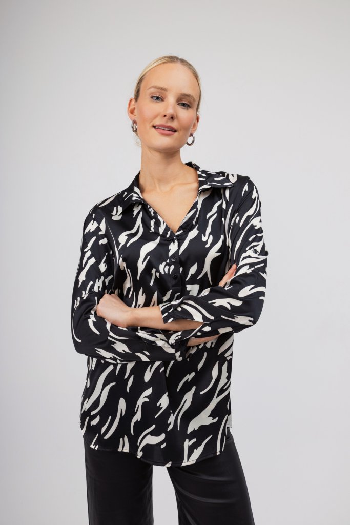 Γυναικείο Πουκάμισο μαύρο με λευκά σχέδια στο μήκος του. Διαθέτει γιακά και κλείνει με κουμπιά. Μια μοντέρνα επιλογή που μπορεί να συνδυαστεί με ένα denim look αλλά και με ένα πιο επίσημομ ντύσιμο. To συγκεκριμένο σχέδιο έχει φαρδιά γραμμή.