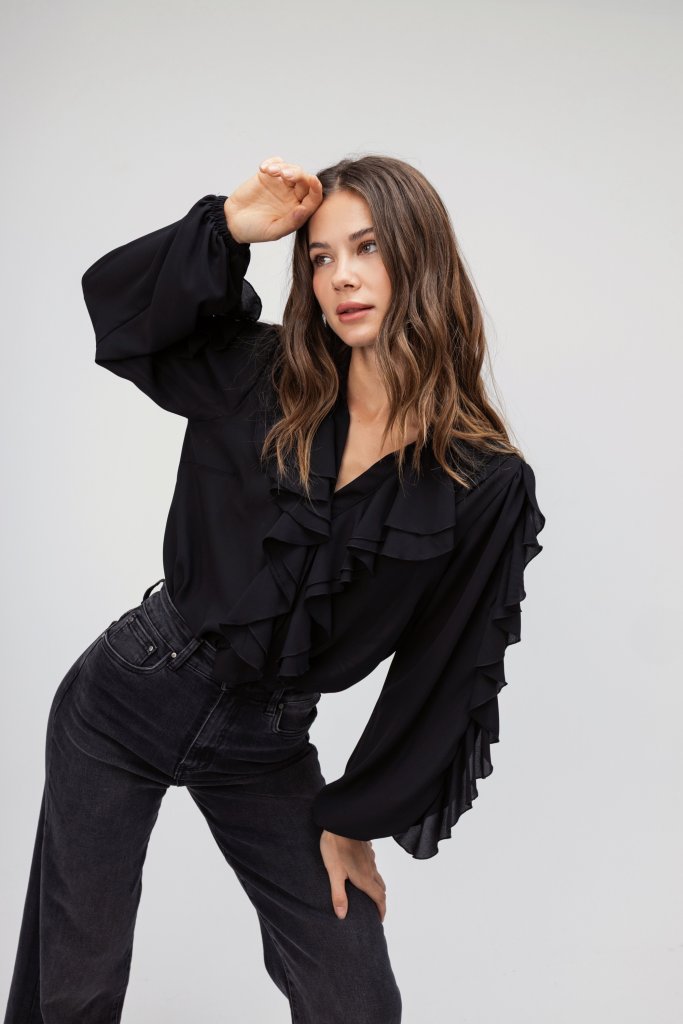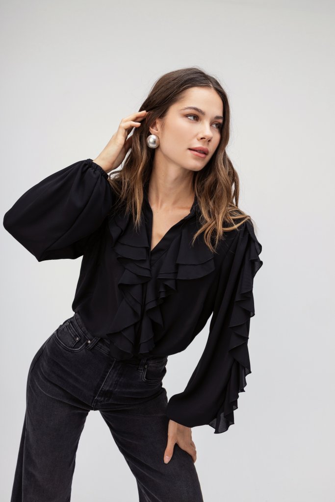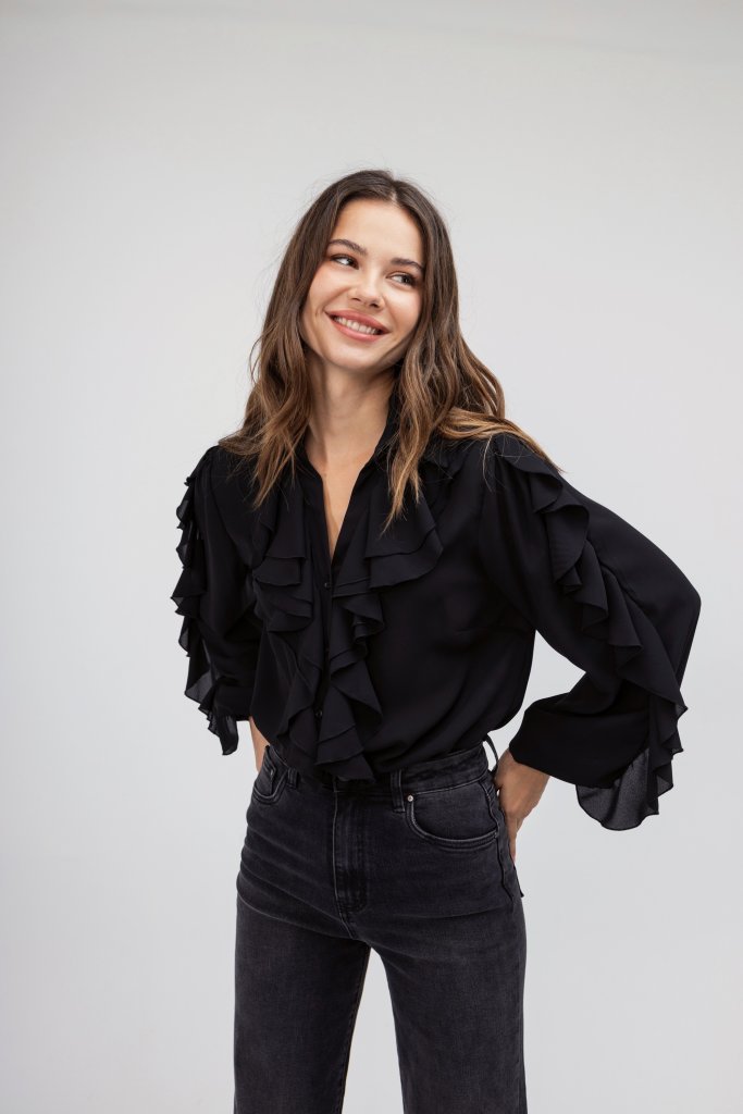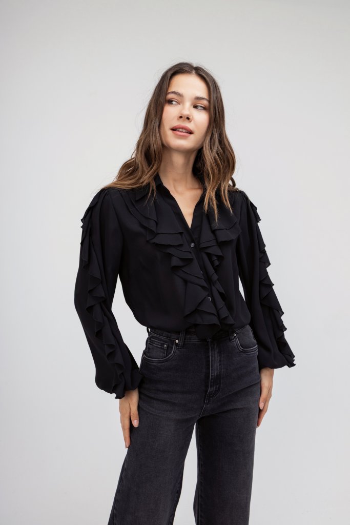 Γυναικείο πουκάμισο σε κλασικό μαύρο χρώμα, διακοσμημένο με βολάν στην ίδια απόχρωση. Ένα άκρως εντυπωσιακό σχέδιο που θα σας χαρίσει το απόλυτο καθημερινό office look.