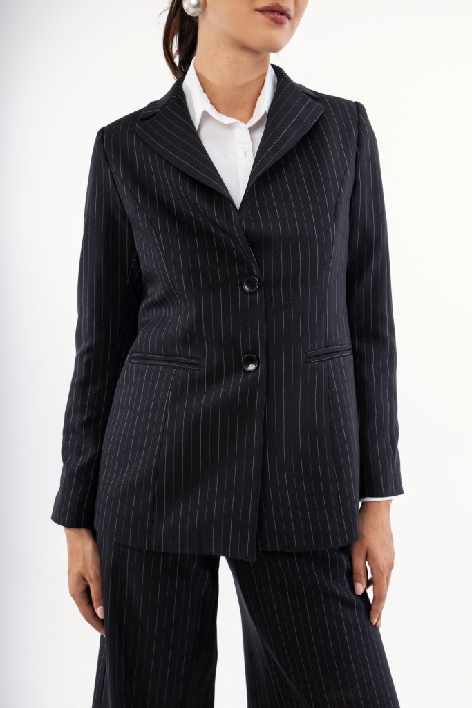 Γυναικείο σακάκι ριγέ σε μαύρη απόχρωση με γιακά και κουμπιά. Διαθέτει εξωτερικές ραφές και διακοσμητικές τσέπες. Διαχρονικό και κομψό που θα λατρέψετε. Συνδυάστε το με το αντίστοιχο παντελόνι και δημιουργήστε ένα σύνολο που θα συζητηθεί.