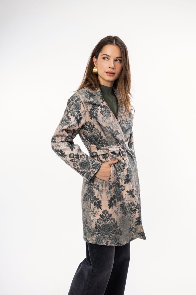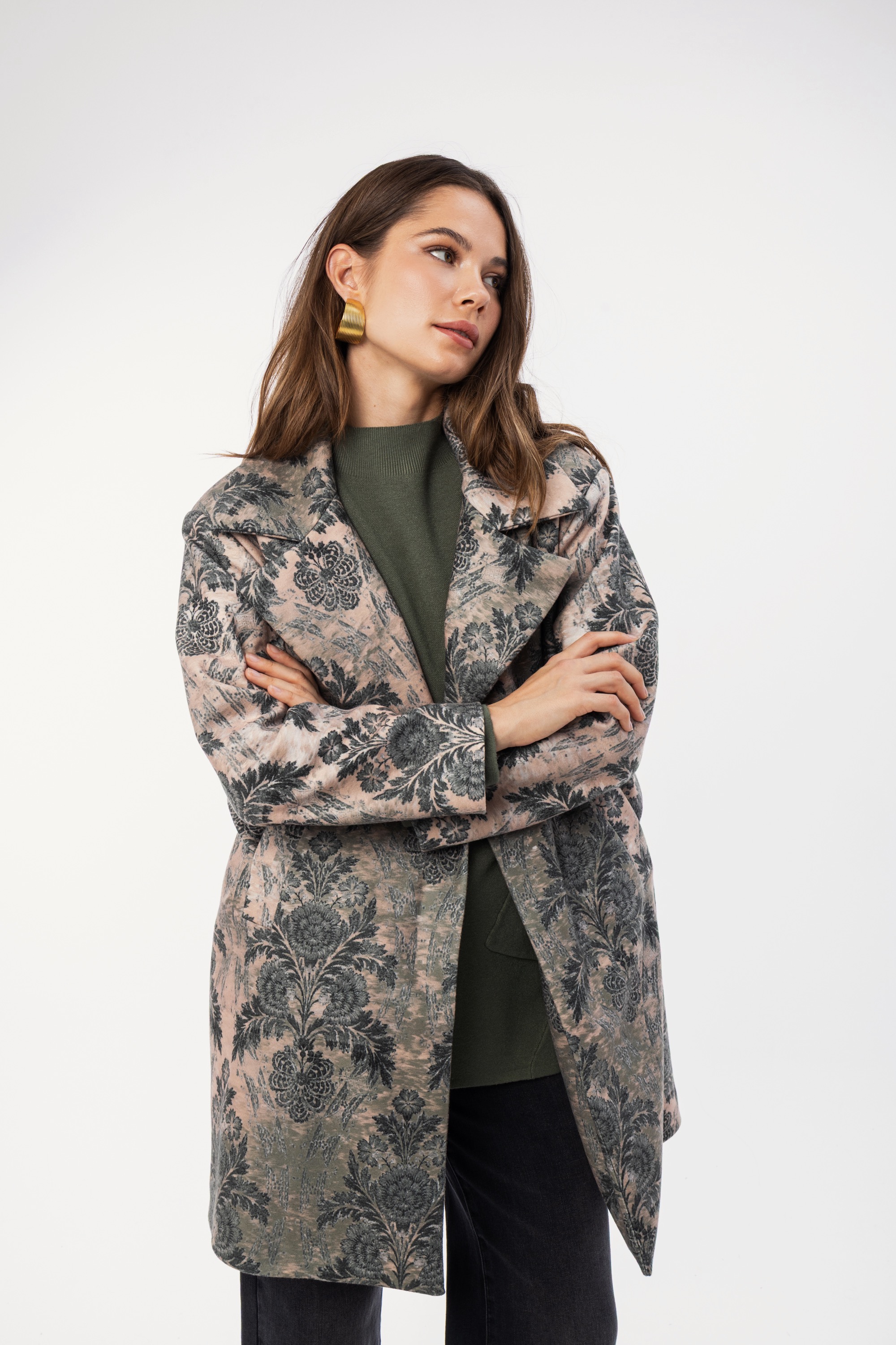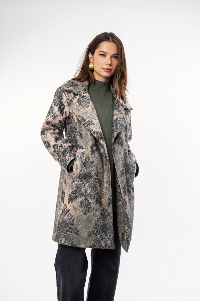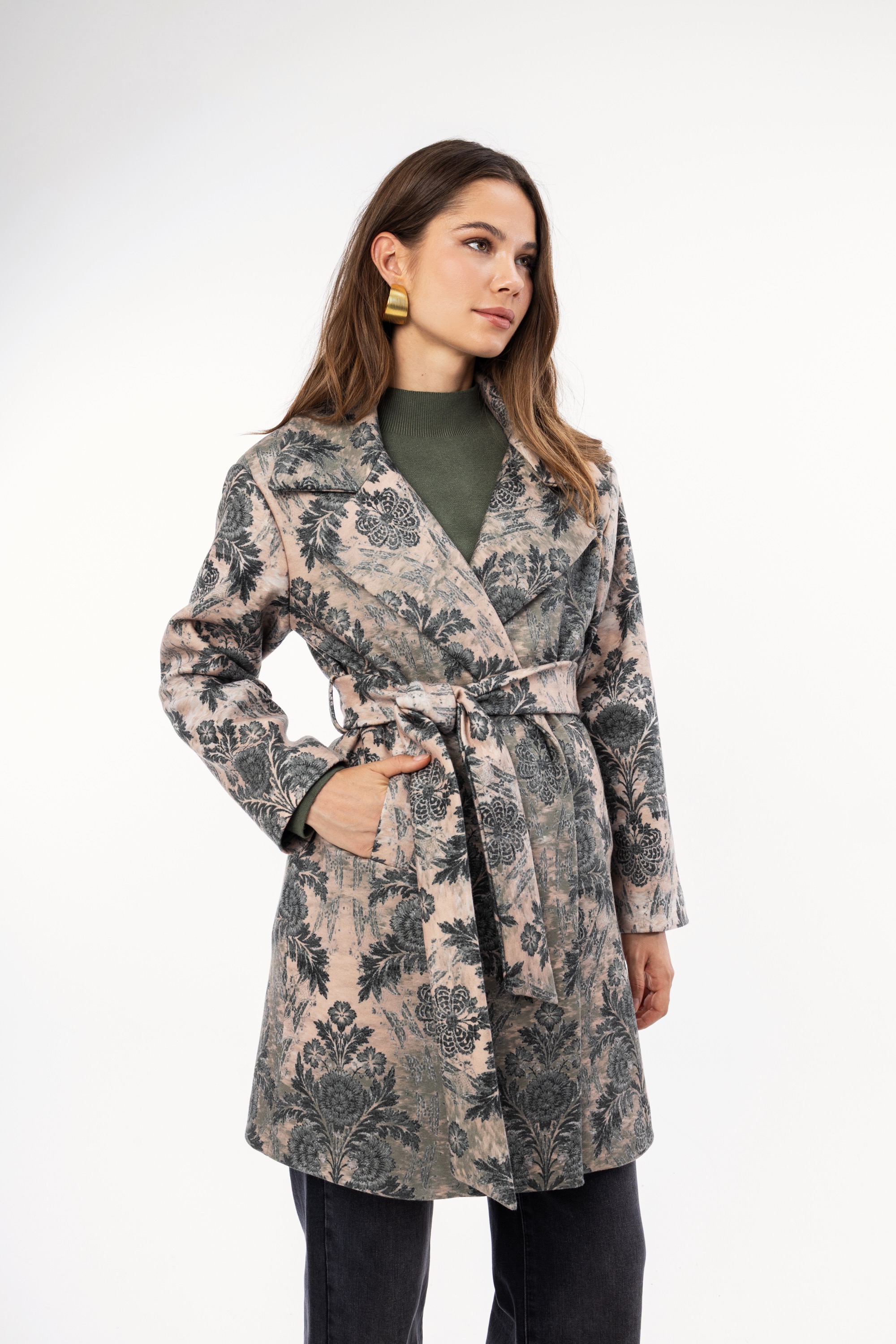 Μοντέρνο γυναικείο παλτό με μπεζ βάση και φλοράλ πράσινα σχέδια σε όλο το μήκος του. Διαθέτει τσέπες στα πλαϊνά μέρη και περιμετρική ζώνη. Μια χειμερινή επιλογή που θα σας κρατήσει ζεστές και κομψές σε κάθε σας εμφάνιση.