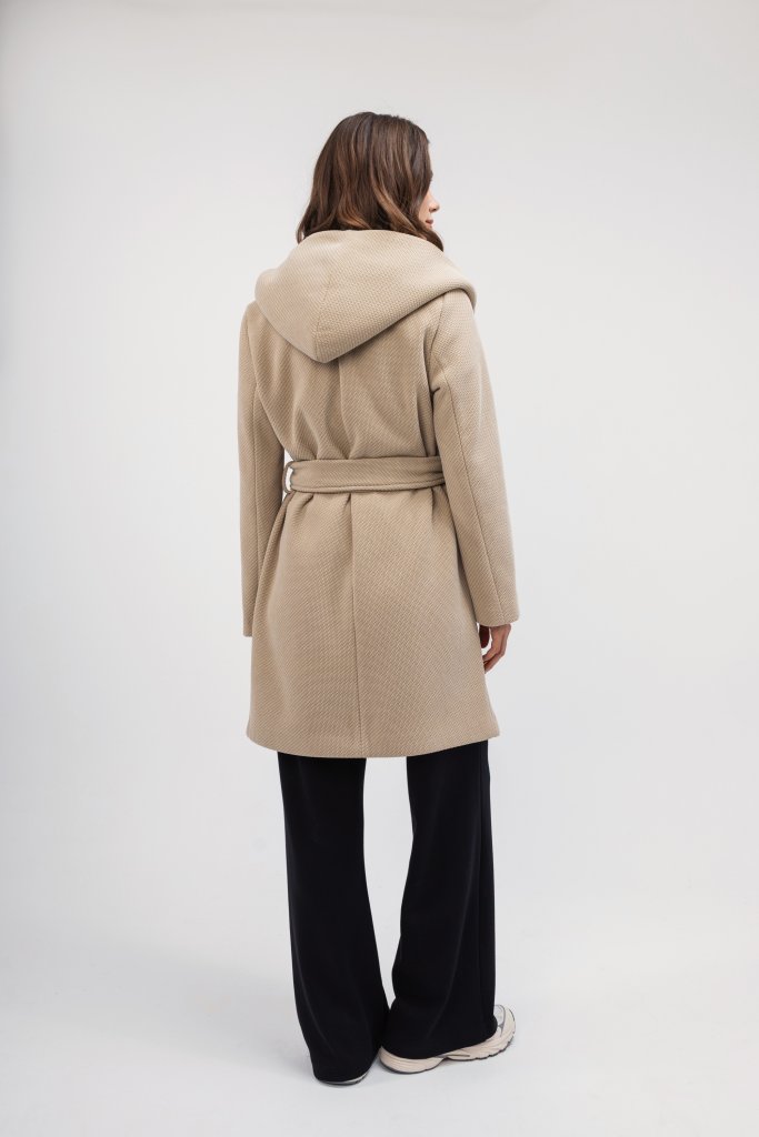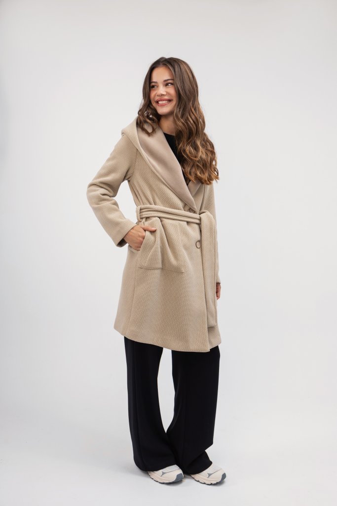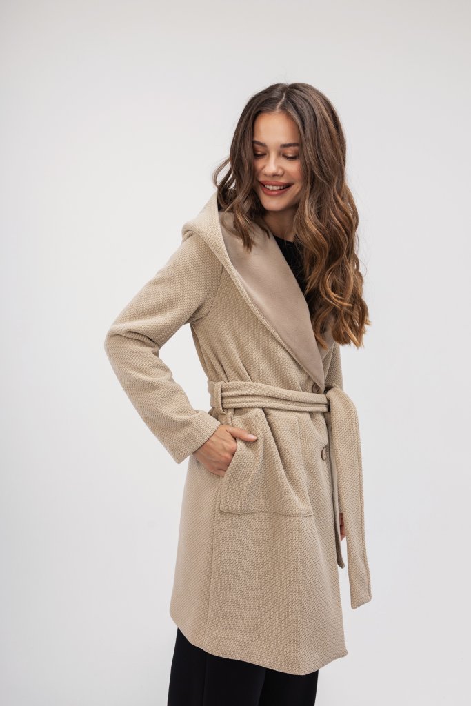 Γυναικείο παλτό σε μπεζ χρώμα από πολύ μαλακό ύφασμα. Διαθέτει κουμπιά, ζώνη και κουκούλα. Ένα μοντέρνο σχέδιο που θα λατρέψετε για τις κρύες ημέρες του χειμώνα.