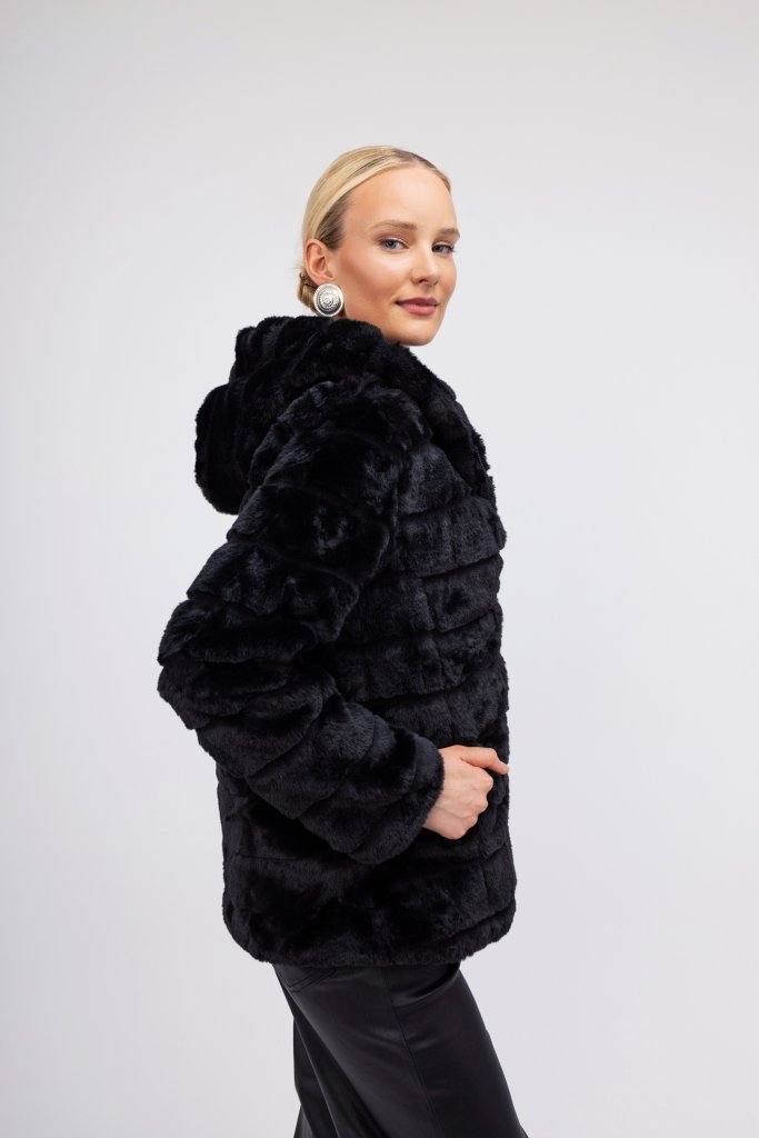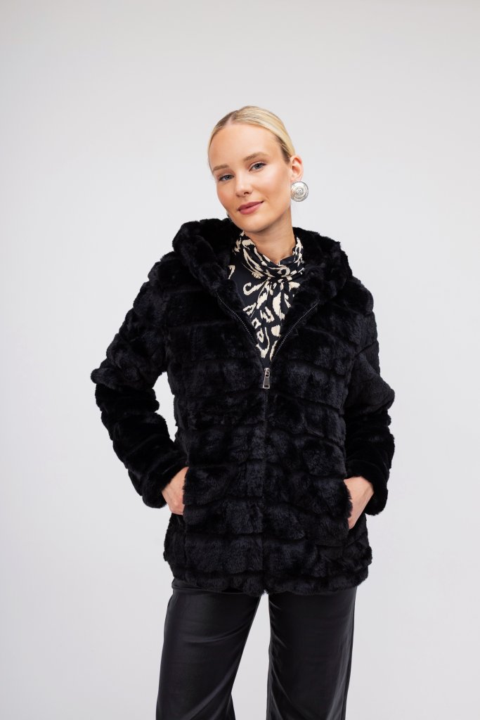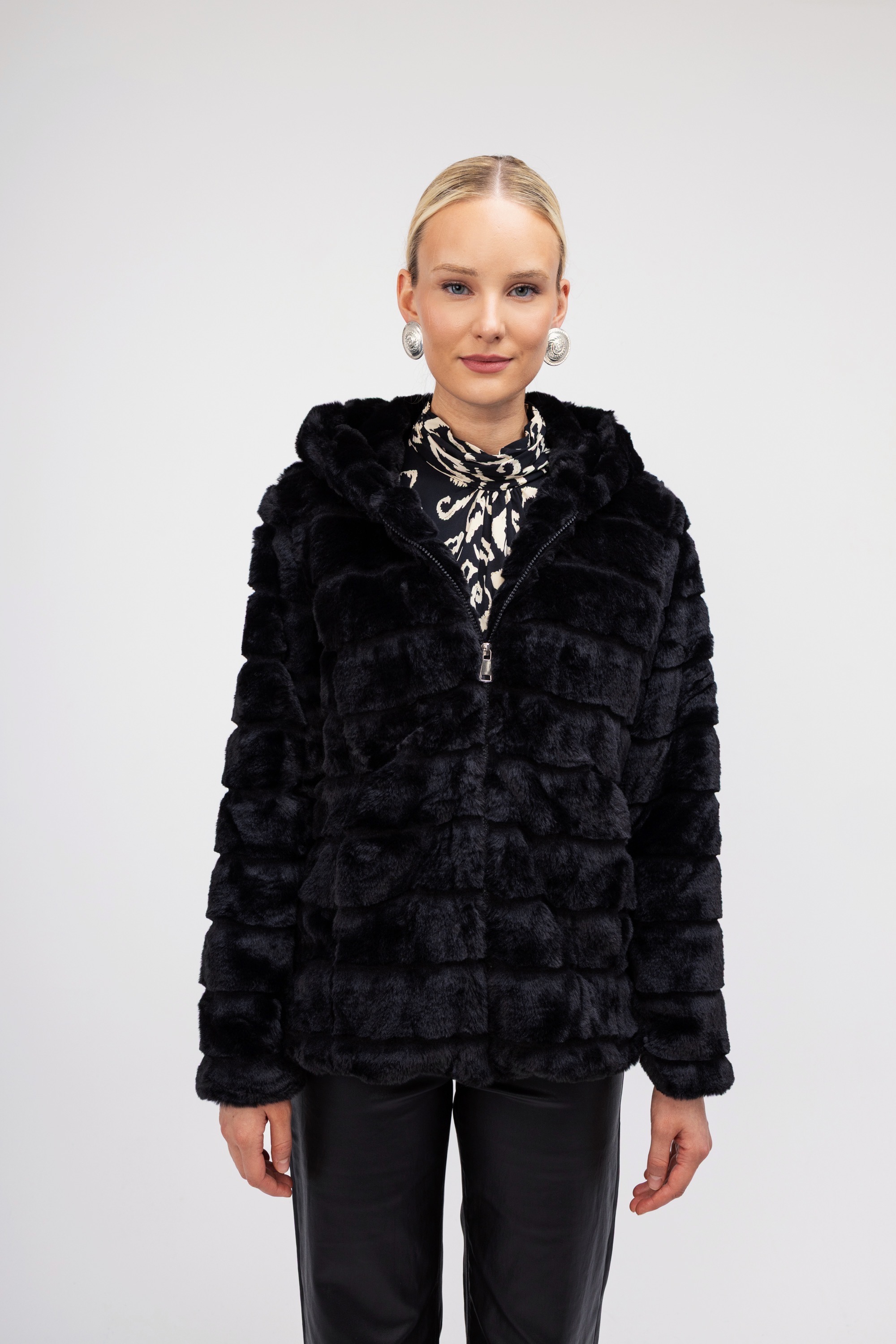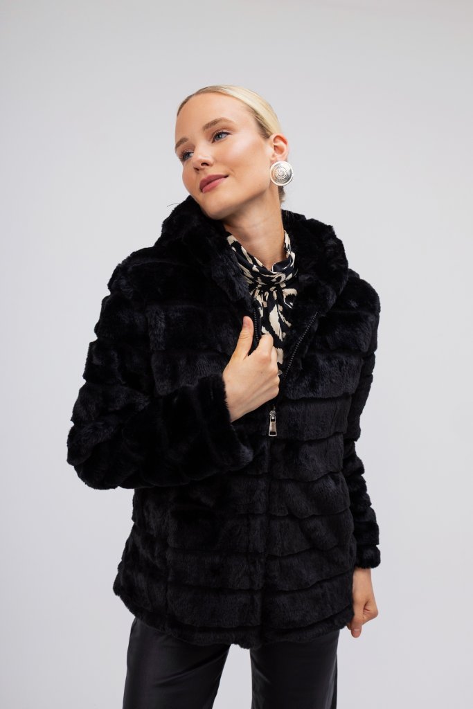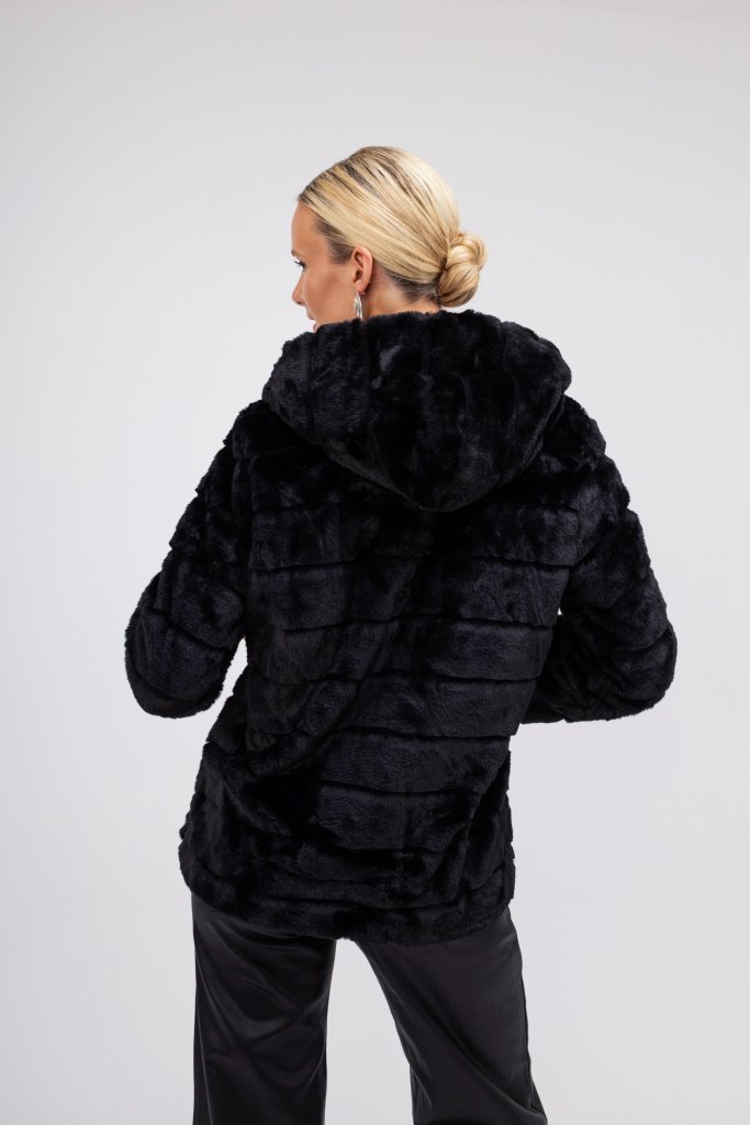 Πανωφόρι κοντό μαύρο με γιακά από οικολογική γούνα άριστης ποιότητας. Ένα σχέδιο για δυναμικές γυναίκες που αγαπούν τη μόδα και το στυλ.