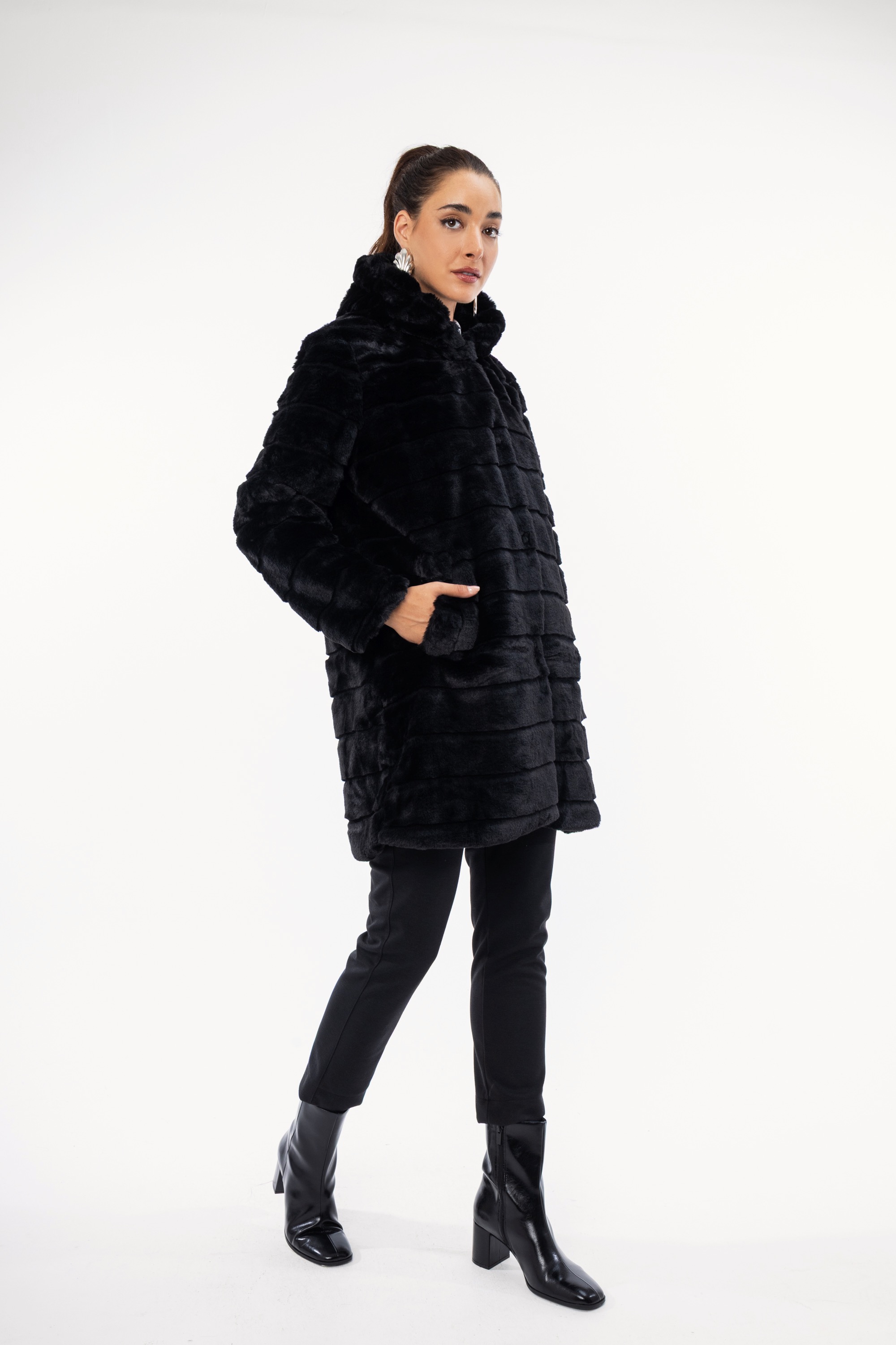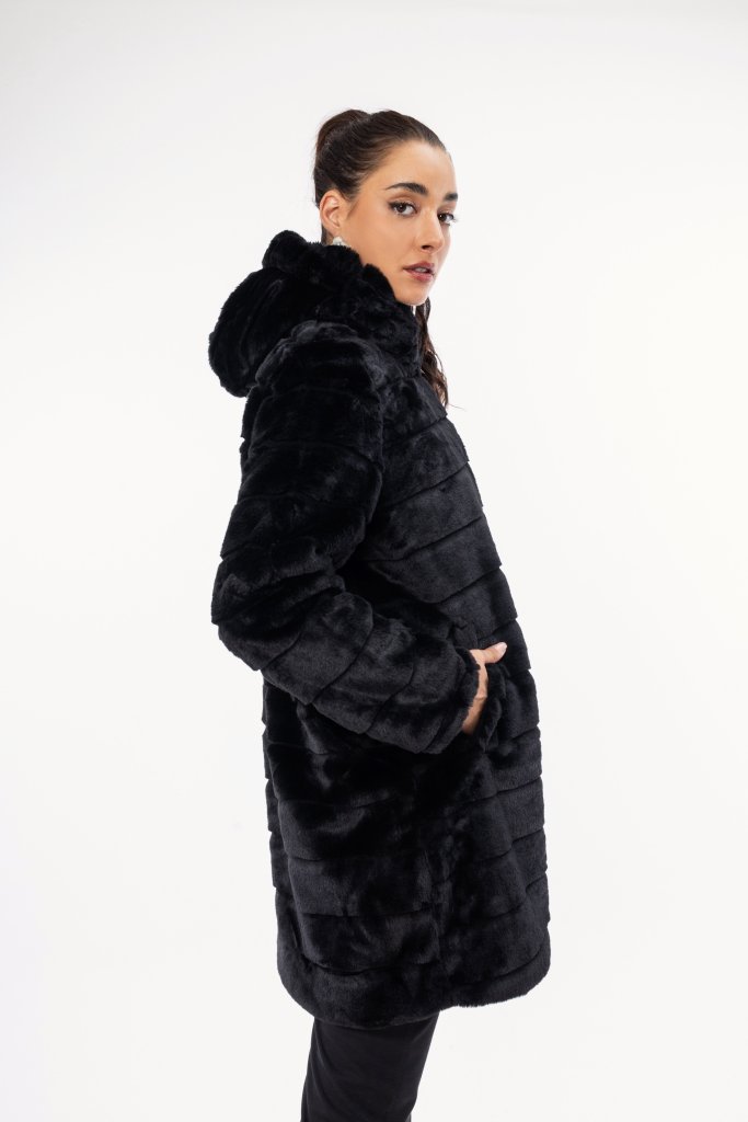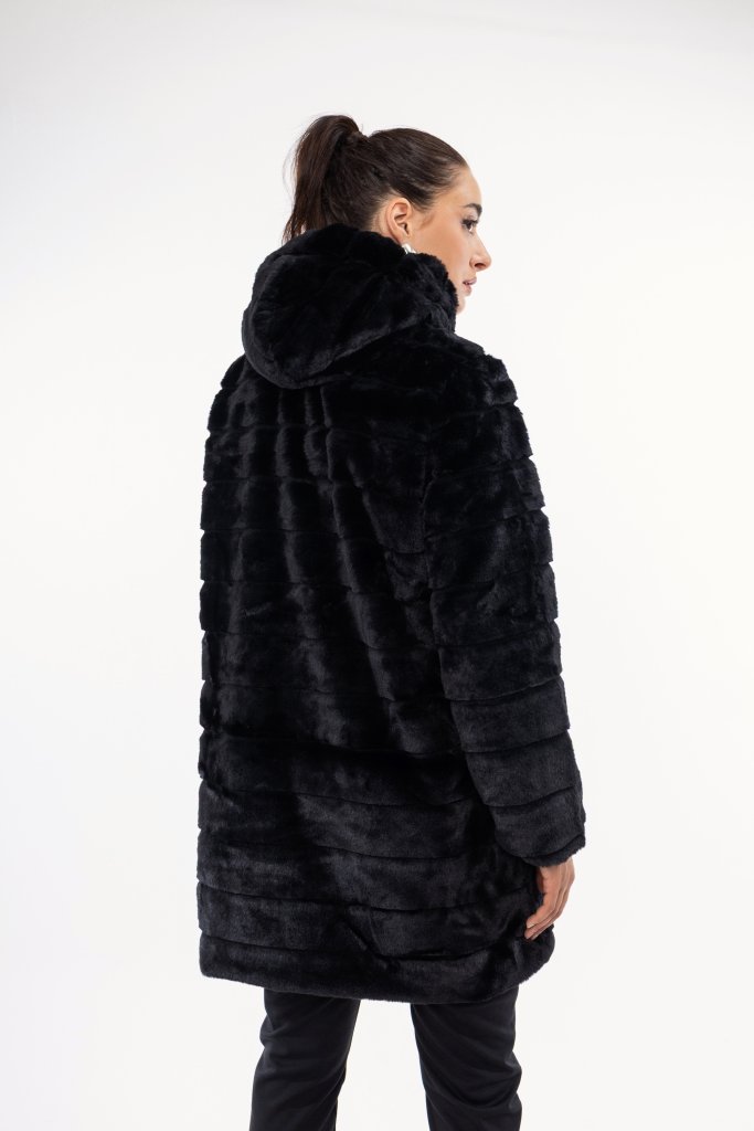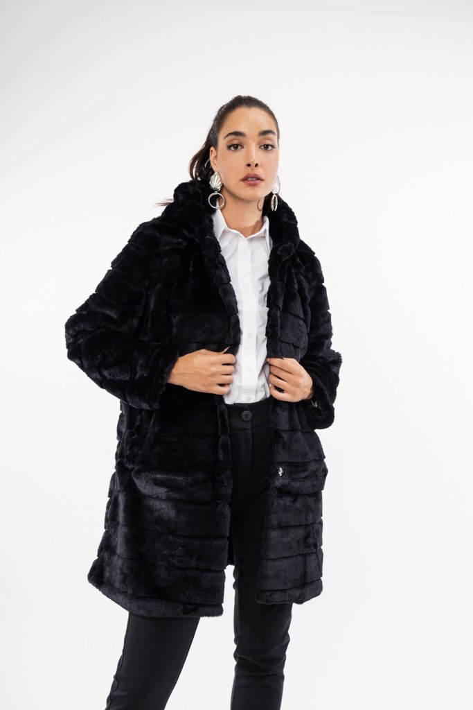 Γυναικείο πανωφόρι σχεδιασμένο από οικολογική γούνα μαύρη με κουκούλα. Κλείσιμο με κουμπιά. Ένα ζεστό και μοντέρνο σχέδιο που θα ανανεώσει τη χειμερινή σας συλλογή και θα σας χαρίσει κομψό στιλ.