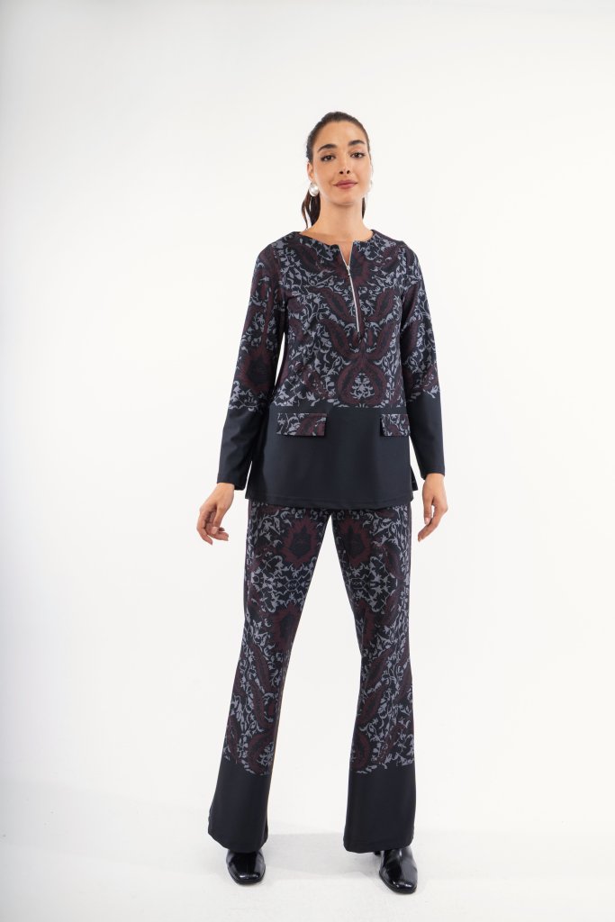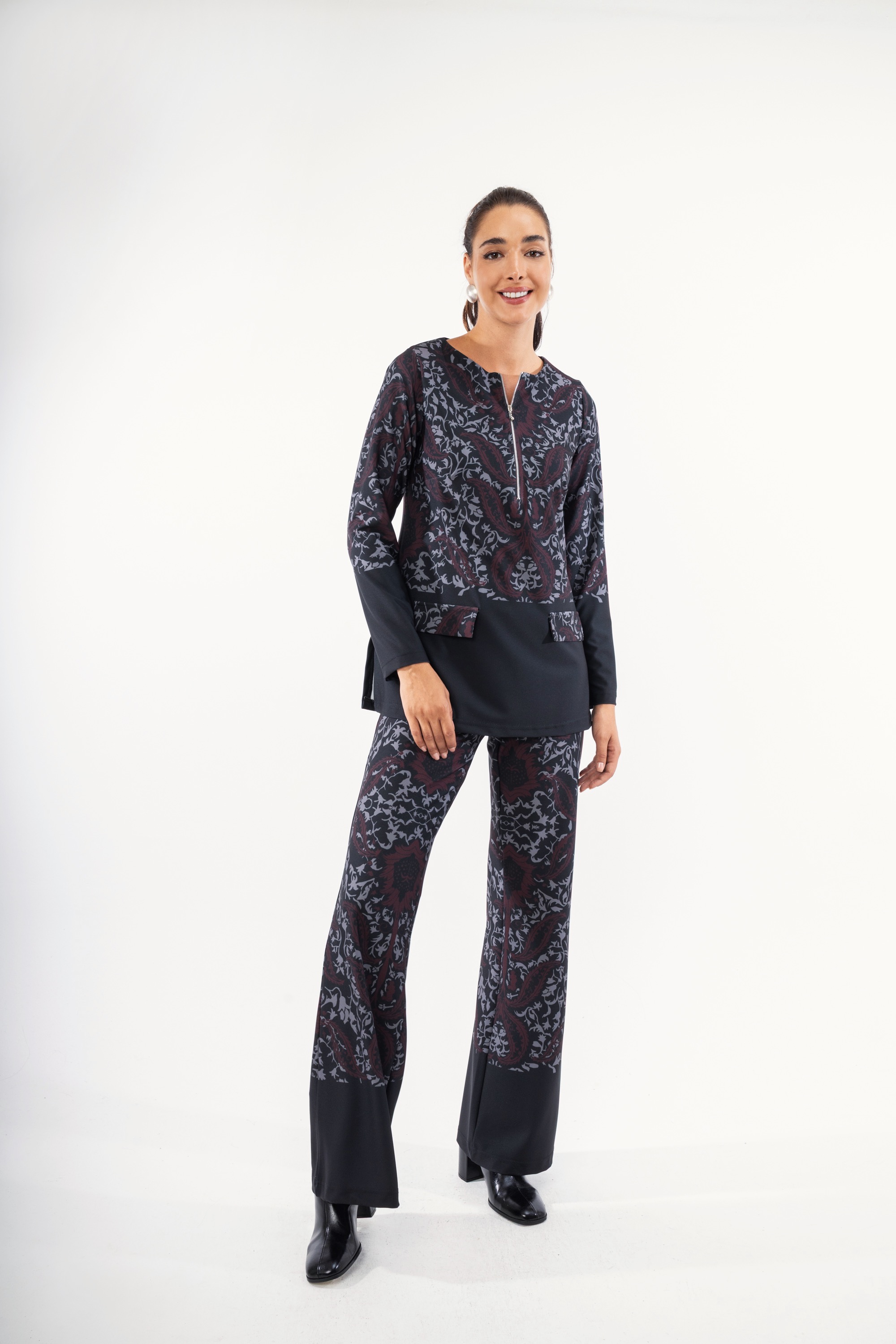 Γυναικεία παντελόνα εμπριμέ με μπορντώ σχέδια από λαχούρια. Διαθέτει καμπάνα τελειώμα και μπλε λεπτομέρειες. Ανανεώστε τη χειμερινή σας συλλογή με αυτή τη μοντέρνα παντελόνα. Συνδυάστε και την αντίστοιχη μπλούζα και δημιουργήστε ένα υπέροχο σετ που θα ξεχωρίσει σε κάθε σας βήμα.