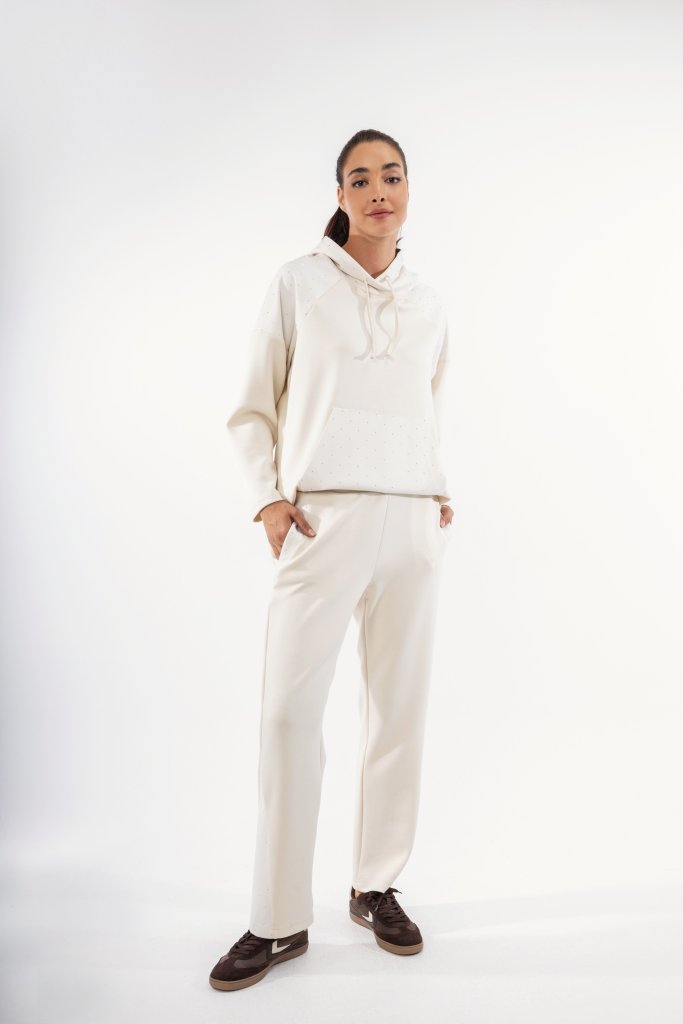 Γυναικείο εκρού παντελόνι από απαλό ύφασμα τύπου φούτερ. Διαθέτει τσέπες και strass. Ένα άνετο σχέδιο που θα σας λύσει τα χέρια σε πολλά outfit. Συνδυάστε το με το αντίστοιχο φούτερ και απογειώαστε το καθημερινό σας στιλ.