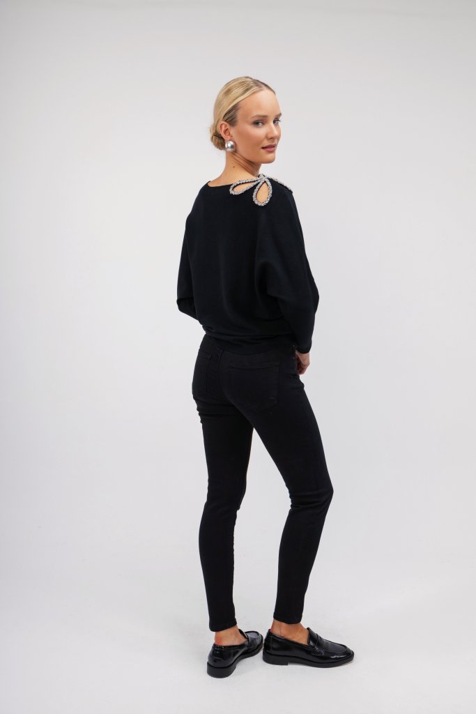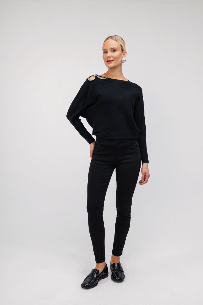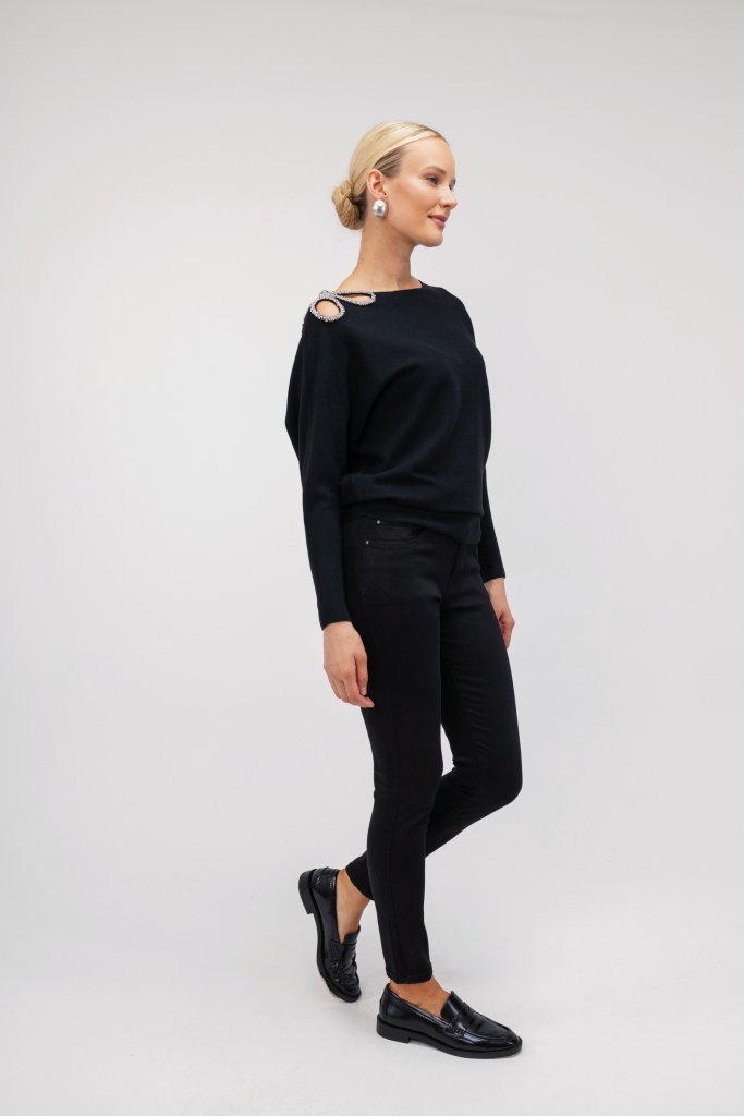 Βαμβακερό παντελόνι τύπου τζιν σε μαύρη απόχρωση και κλασική γραμμή. Κλείσιμο με κουμπί και φερμουάρ. Μια basic επιλογή που δεν πρέπει να λείπει από το καθημερινό σας look.