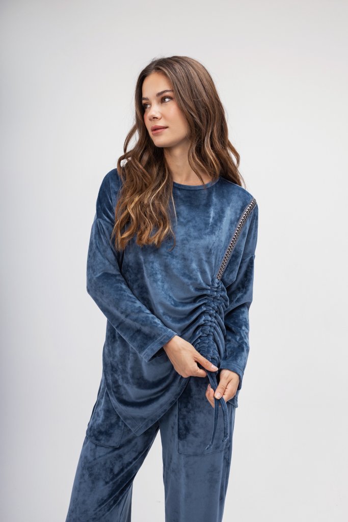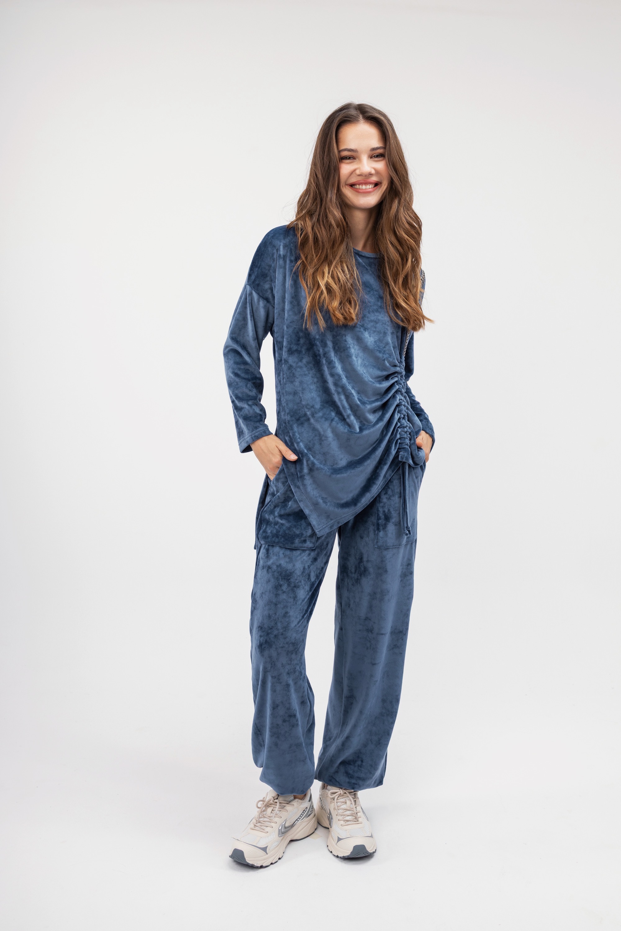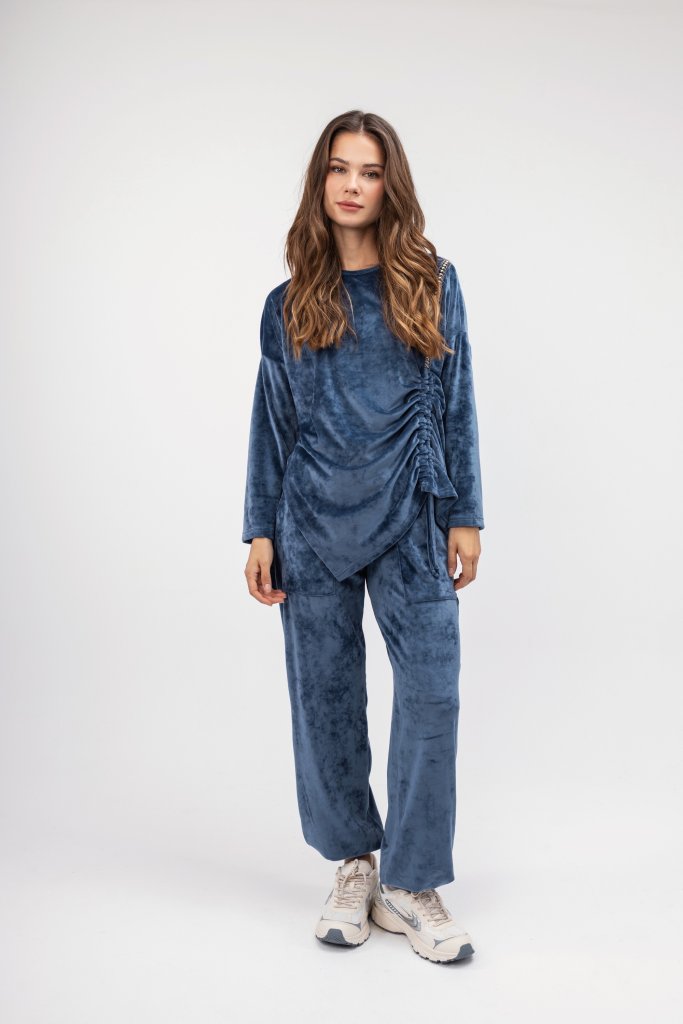 Γυναικείο παντελόνι σε απαλή υφή βελουτέ και μπλέ χρώμα. Διαθέτει μεγάλες τσέπες στα πλαινά μέρη. Ένα σχέδιο για μοναδικά καθημερινά look.
