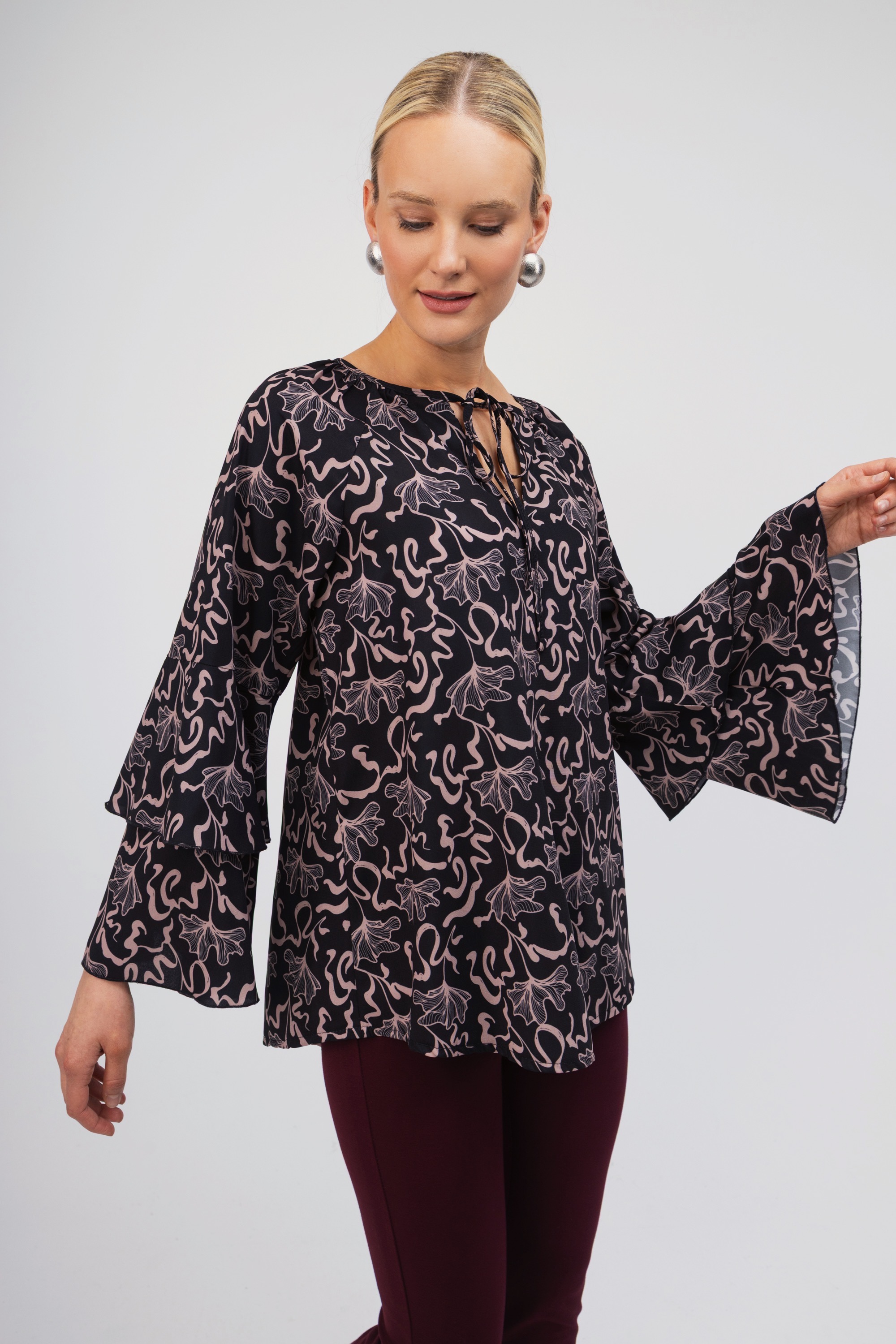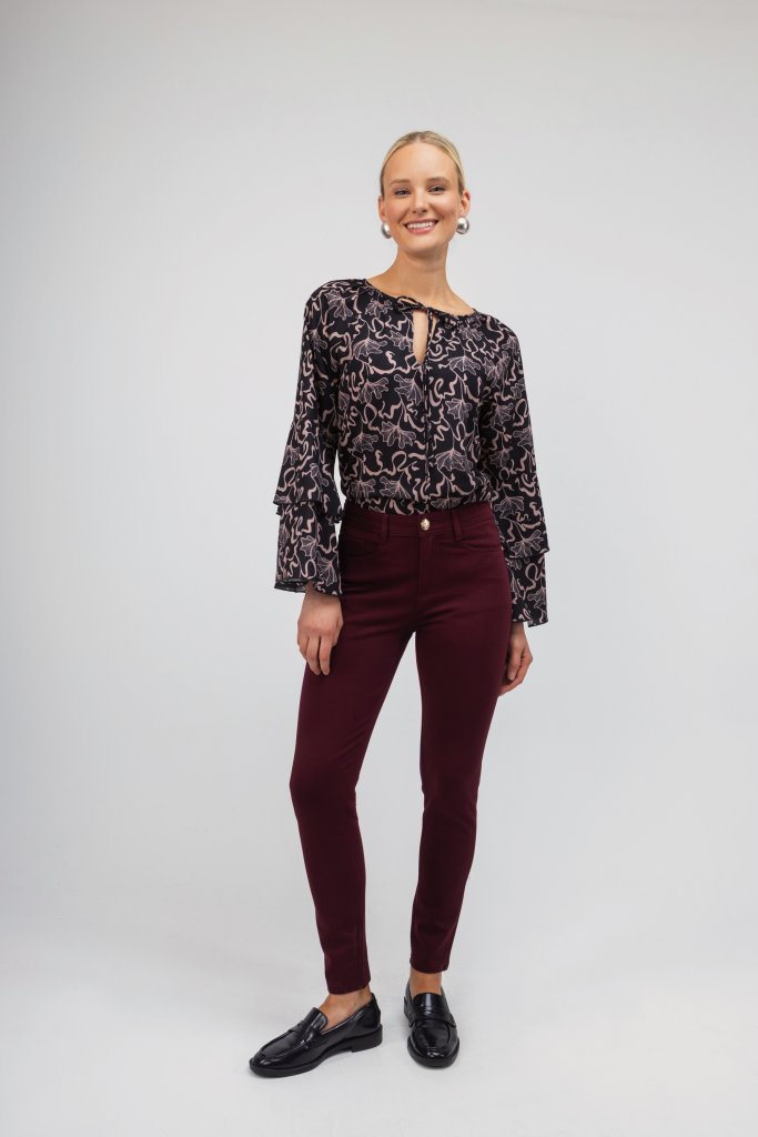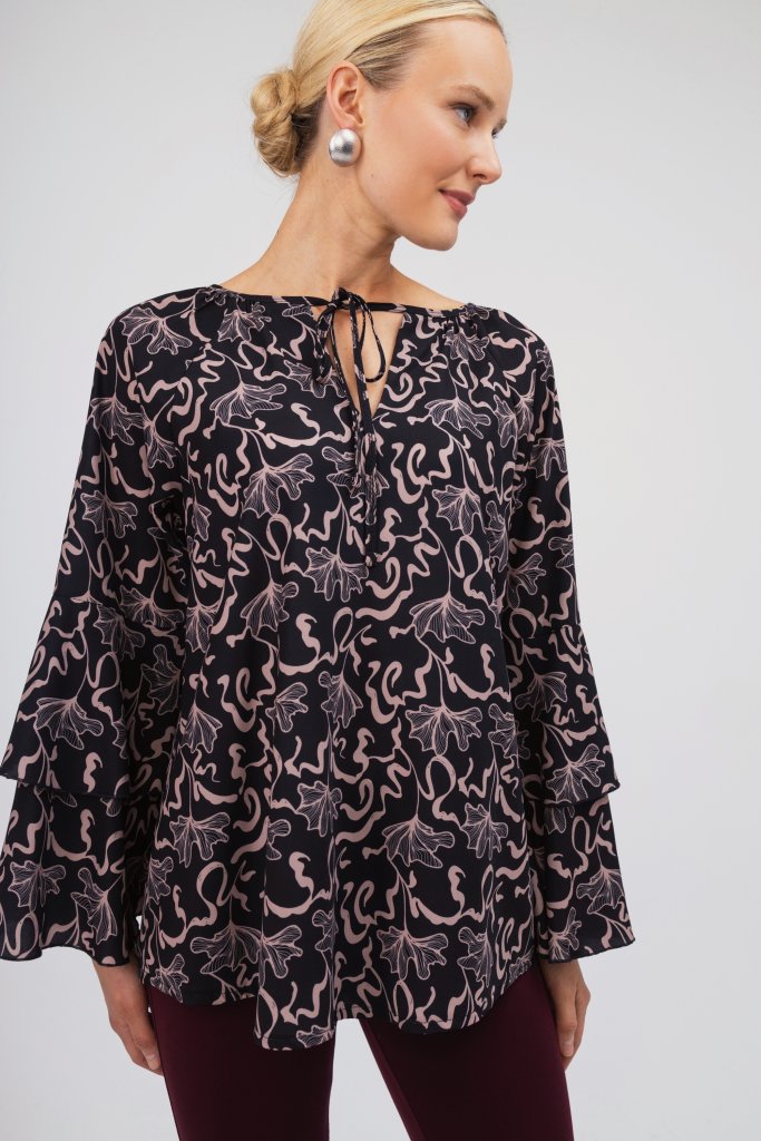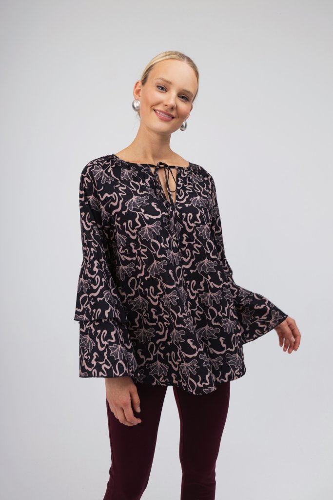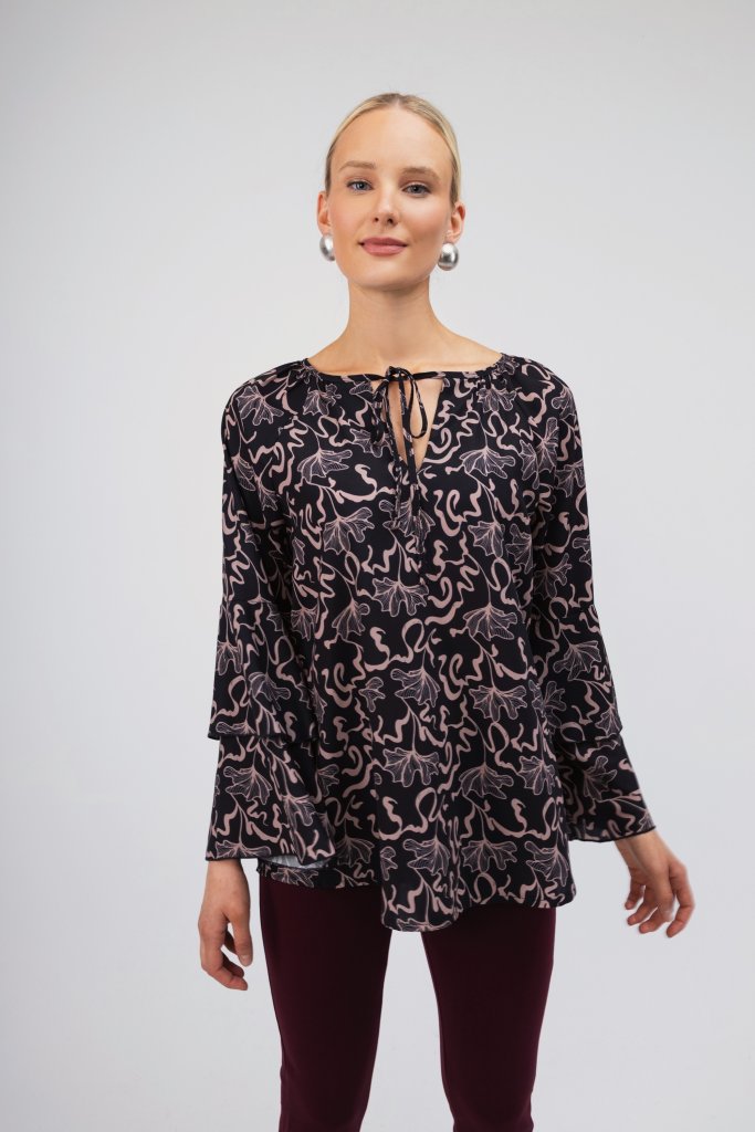 Άνετο πουκάμισο με σκούρη μπλε βάση και εντυπωσιακά εμπριμέ μπεζ σχέδια όπως και βολάν στα μανίκια. Διαθέτει δέσιμο με κορδονάκι στο λαιμό. Μια κομψή επιλογή που μπορεί να συνδυαστεί τέλεια με το office look σας αλλά και τις καθημερινές σας βόλτες.