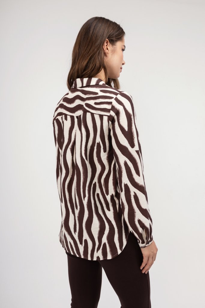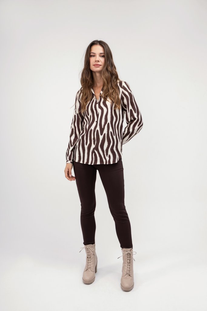 Γυναικείο πουκάμισο καφέ animal print για ένα κομψό look που θα τραβήξει όλα τα βλέμματα πάνω σας. Διαθέτει γιακά και κλείνει με κουμπιά. Μια υπέροχη δημιουργία ιδανική να φορεθεί σε κάθε στιγμή της ημέρας.