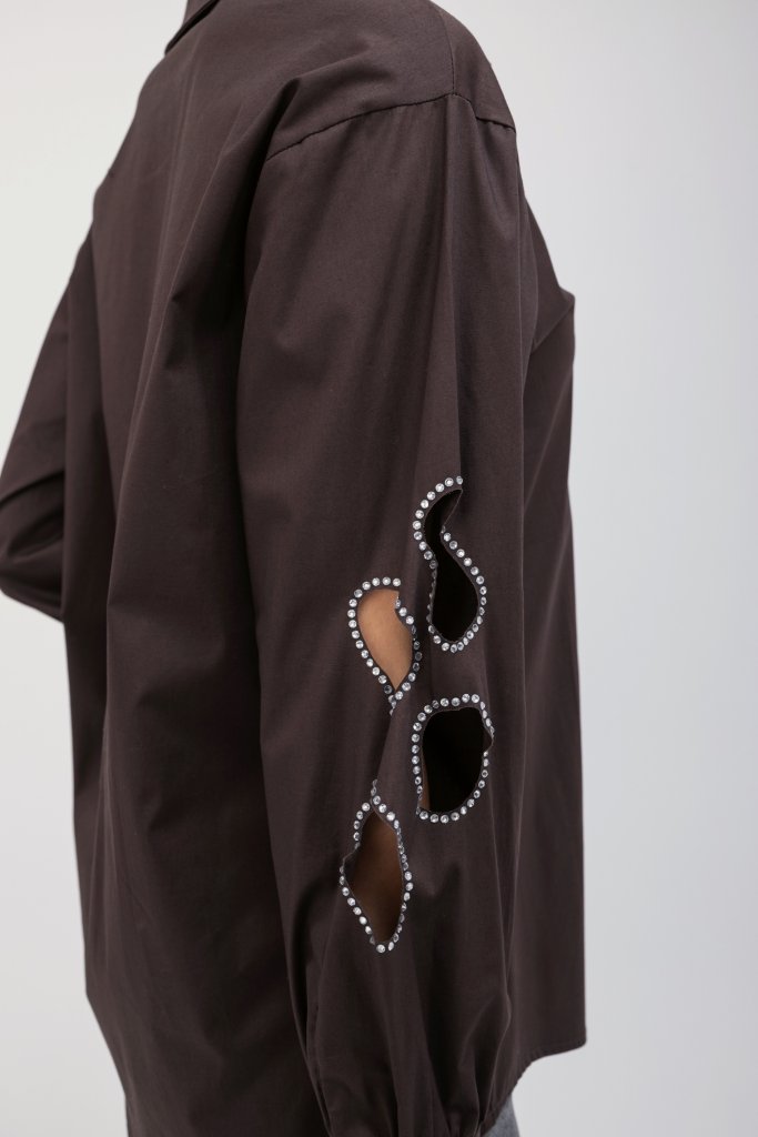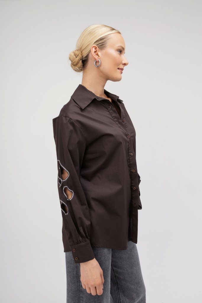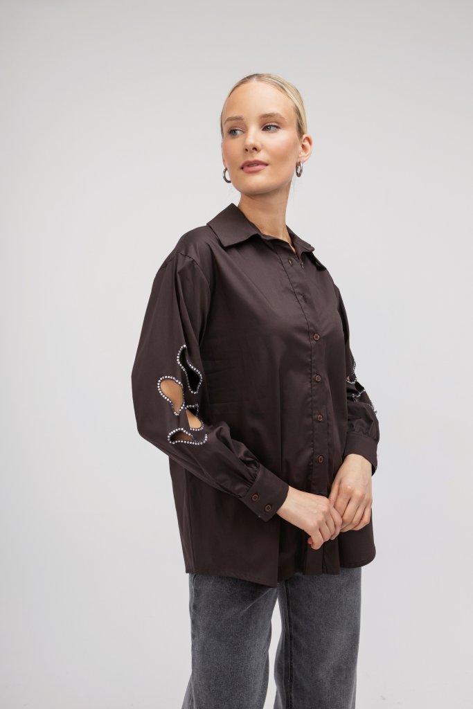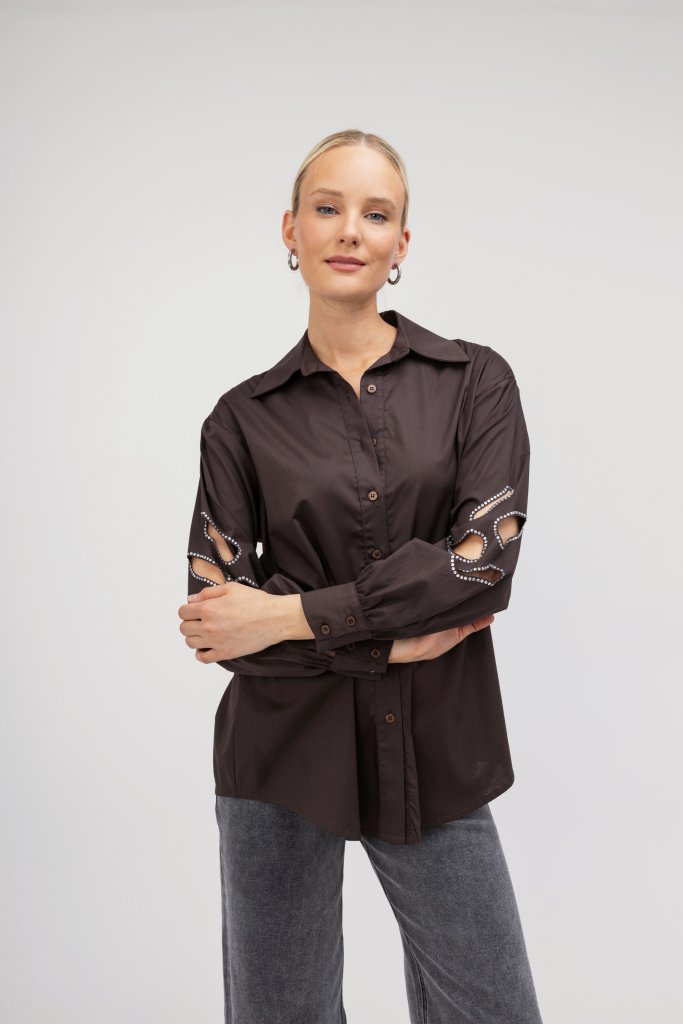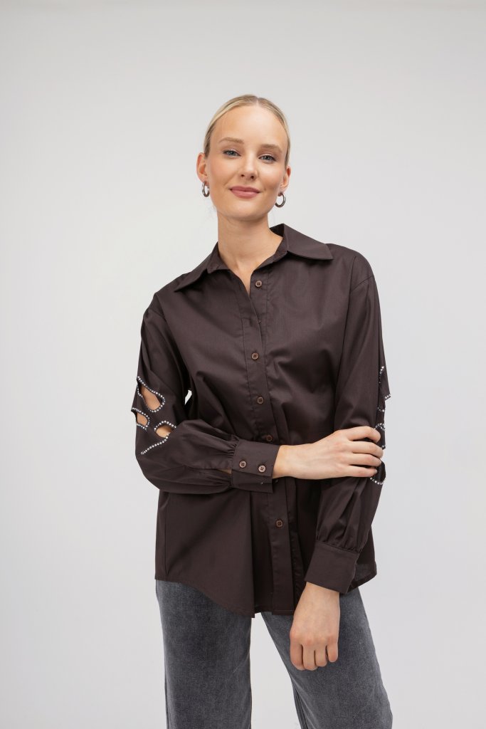 Καφέ γυναικείο πουκάμισο με εντυπωσιακά σχέδια στα μανίκια με ανοίγματα. Κλείσιμο με κουμπιά. Ένα διαχρονικό αλλά ταυτόχρονα και μοντέρνο σχέδιο που δεν πρέπει να λείπει από τη συλλογή σας.