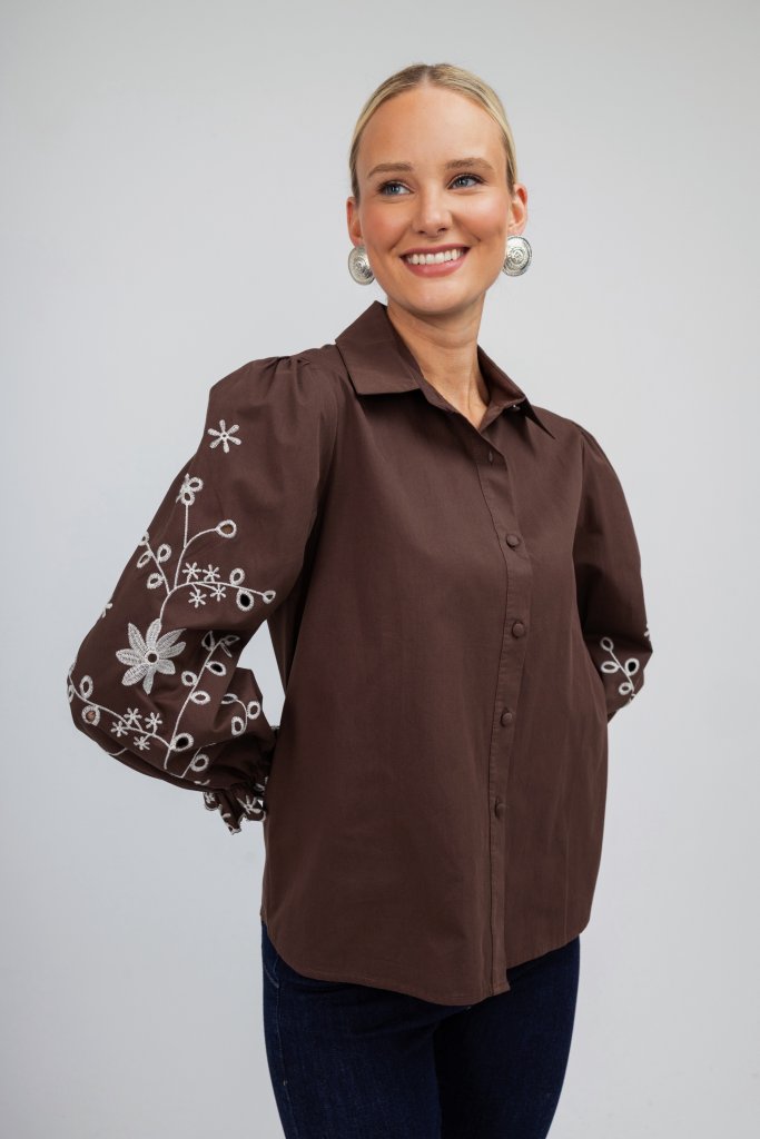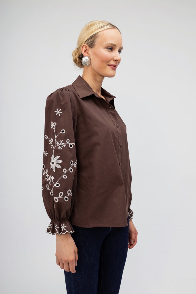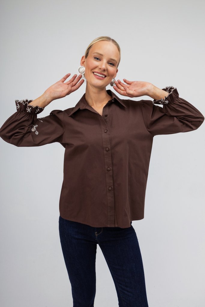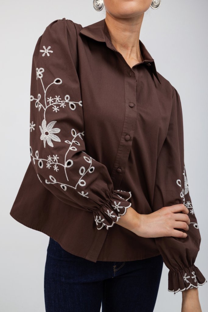 Γυναικείο πουκάμισο σε σκούρο καφέ χρώμα με λουλούδια και λάστιχο στο τελειώμα των μανικιών. Κλείσιμο με κουμπάκια. Ένα μοντέρνο σχέδιο που μπορεί να φορεθεί για ένα υπέροχο office look αλλά και για μια χαλαρή απογευματινή βόλτα.