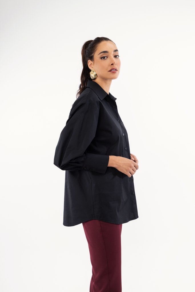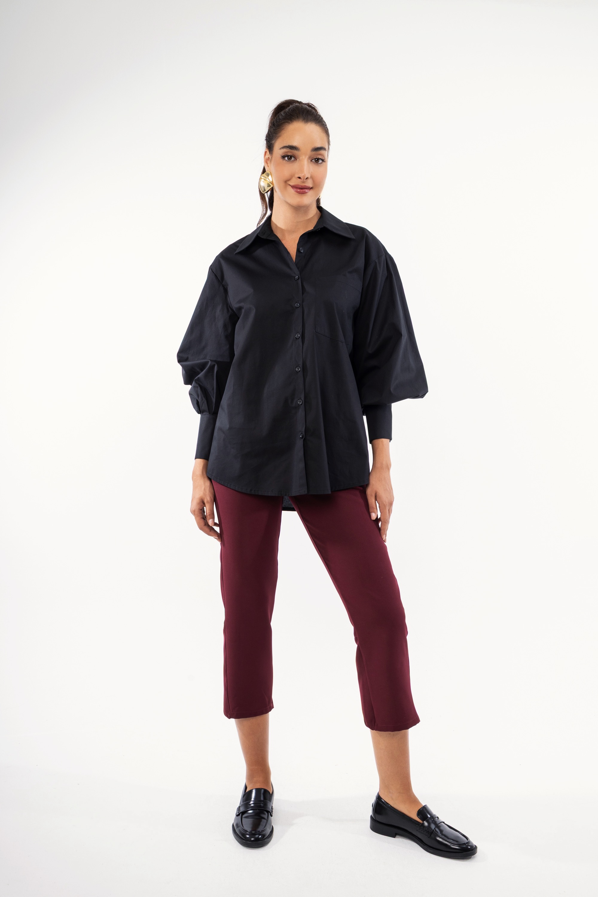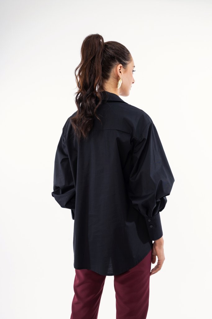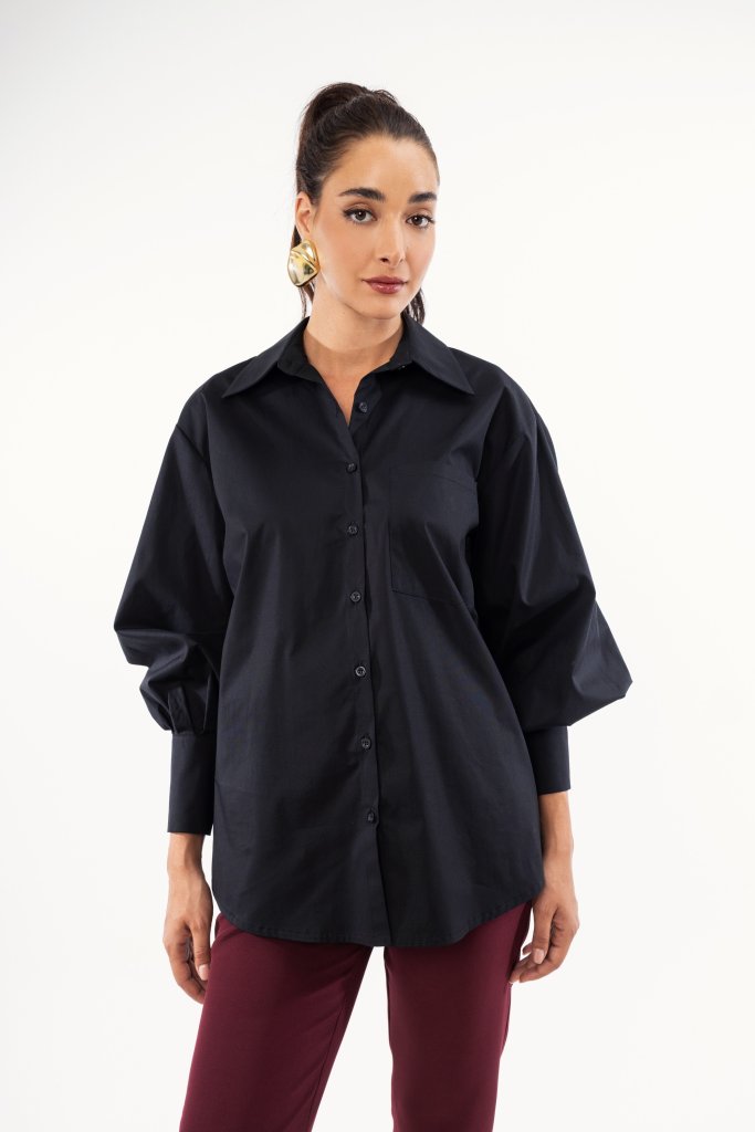 Γυναικείο πουκάμισο σε μαύρο χρώμα με εντυπωσιακά balloon μανίκια και πίετες. Κλείσιμο με κουμπιά και διαθέτει διακοσμημένη τσέπη στο αριστερο μέρος. Μια μονόχρωμη, chic επιλογή που δεν πρέπει να λείπει από τη γκαρνταρόμπα σας.