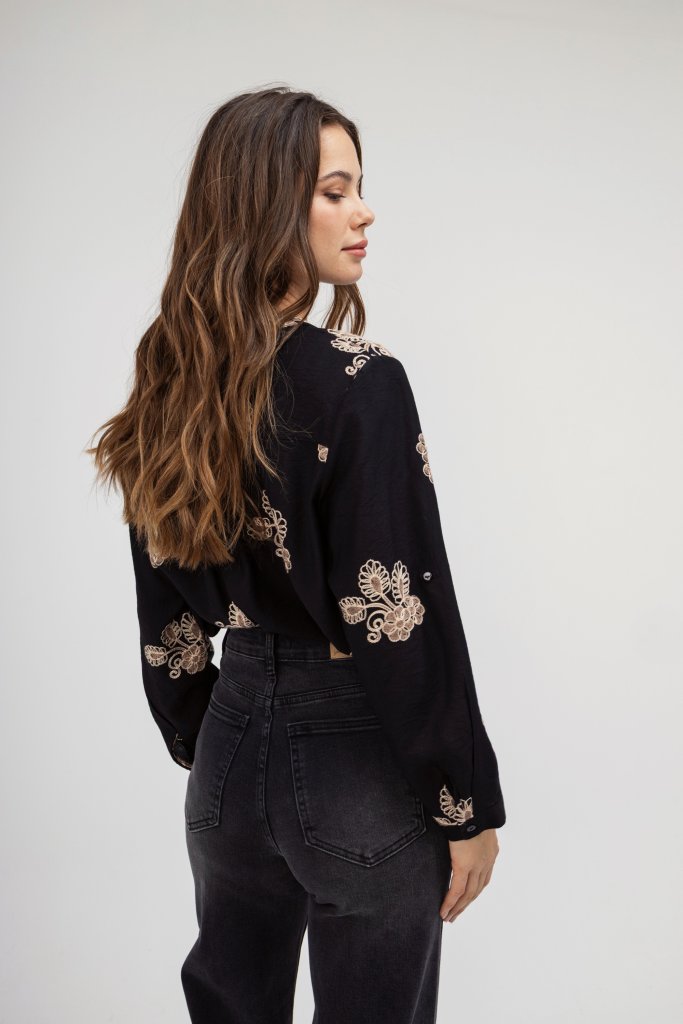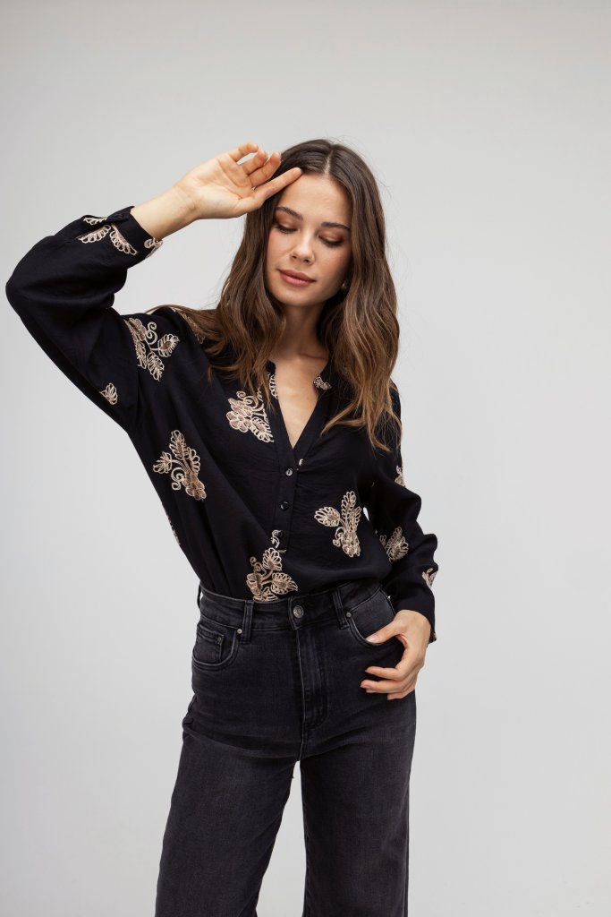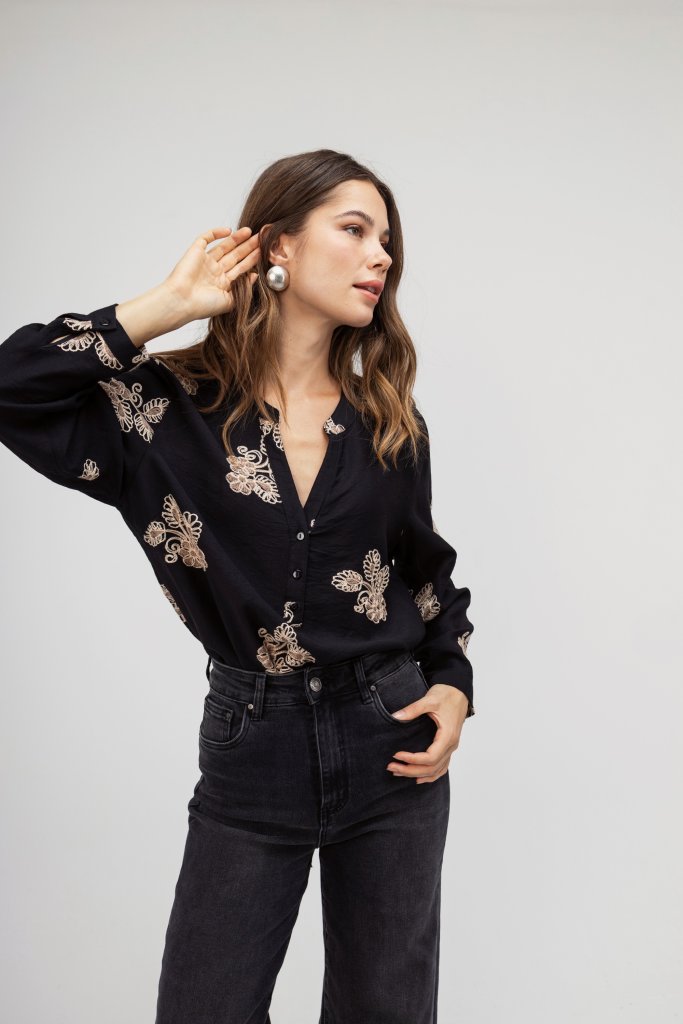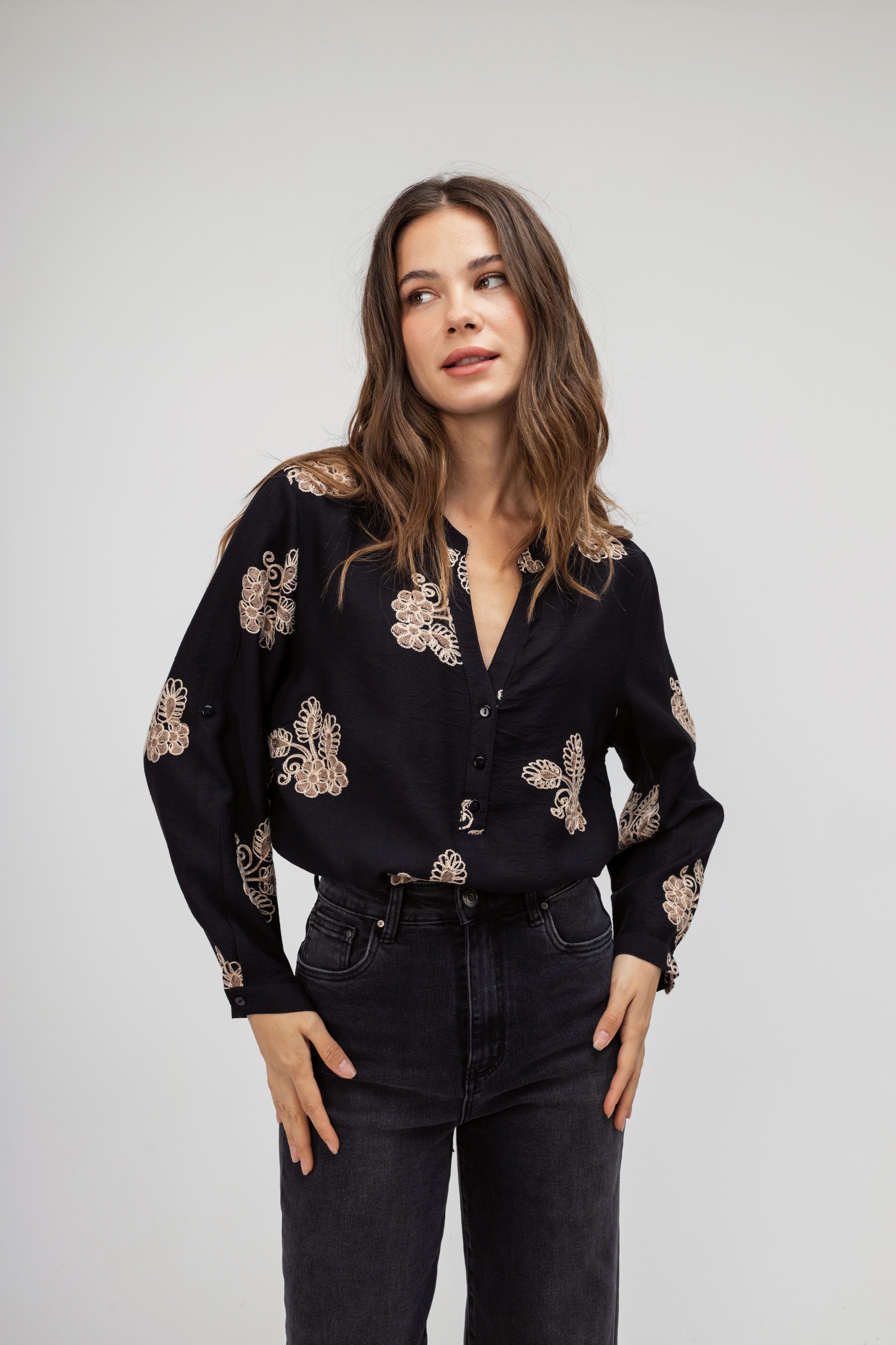 Γυναικείο πουκάμισο σε χρώμα μαύρο διακοσμημένο με μπεζ boho λουλούδια. Κλείσιμο με κουμπιά. Ένα άνετο και μοντέρνο σχέδιο, ιδανικό για ένα τολμηρό office look. Το συγκεκριμένο σχέδιο έχει φαρδιά εφαρμογή.
